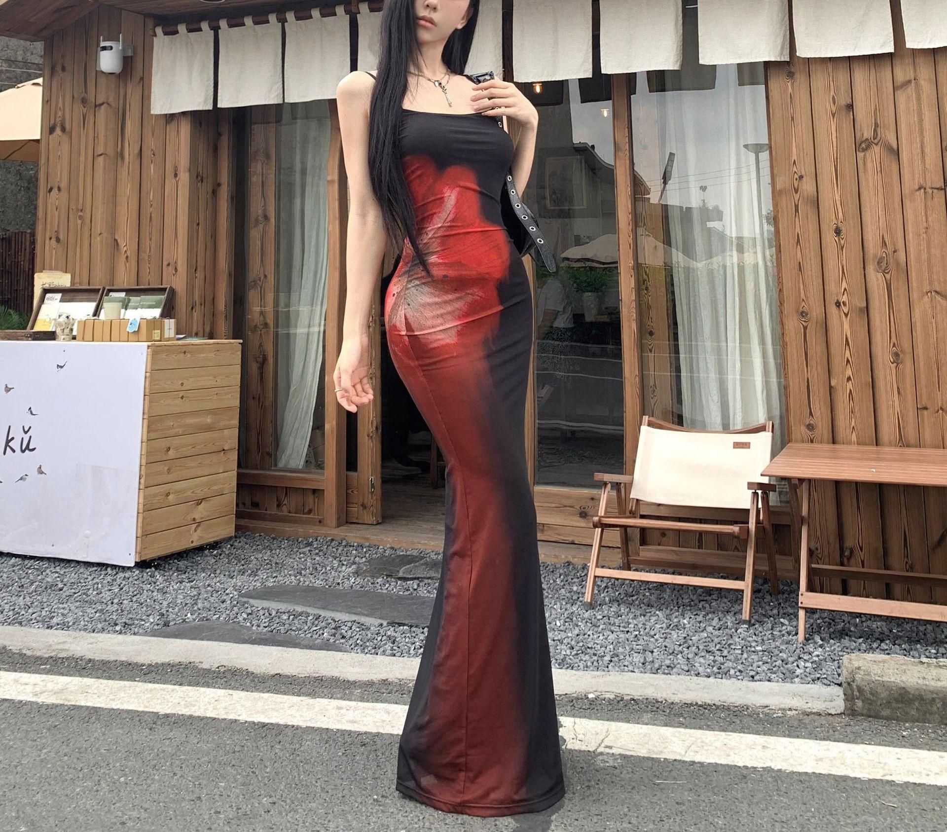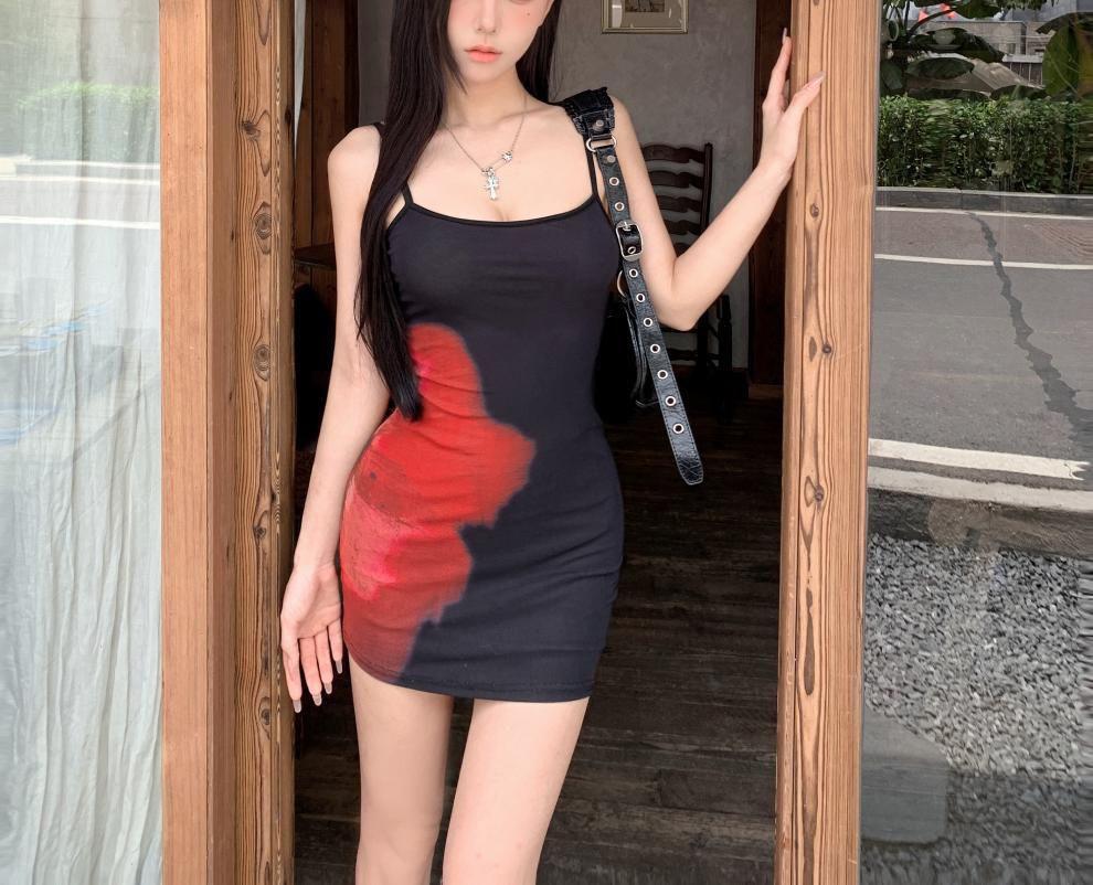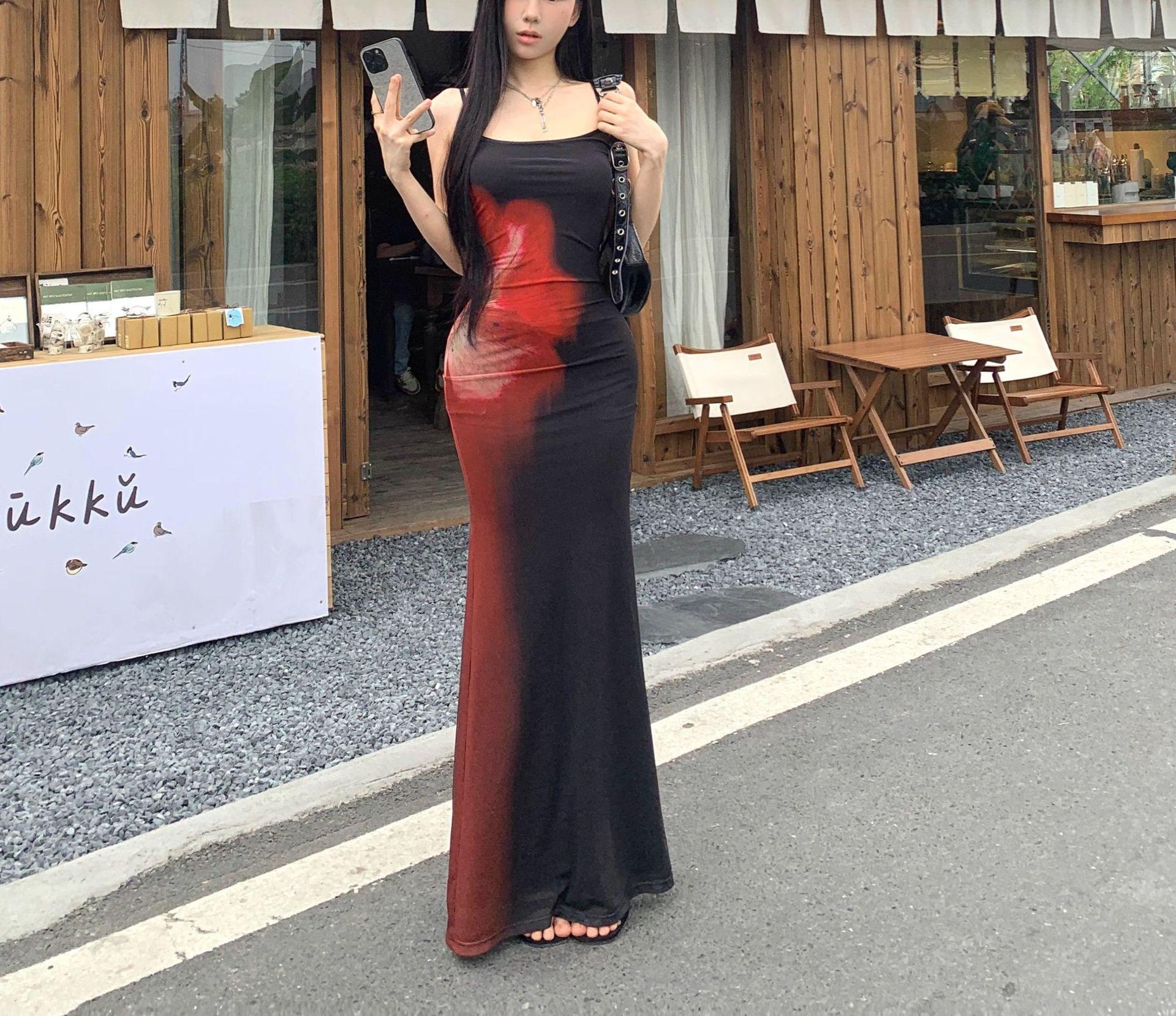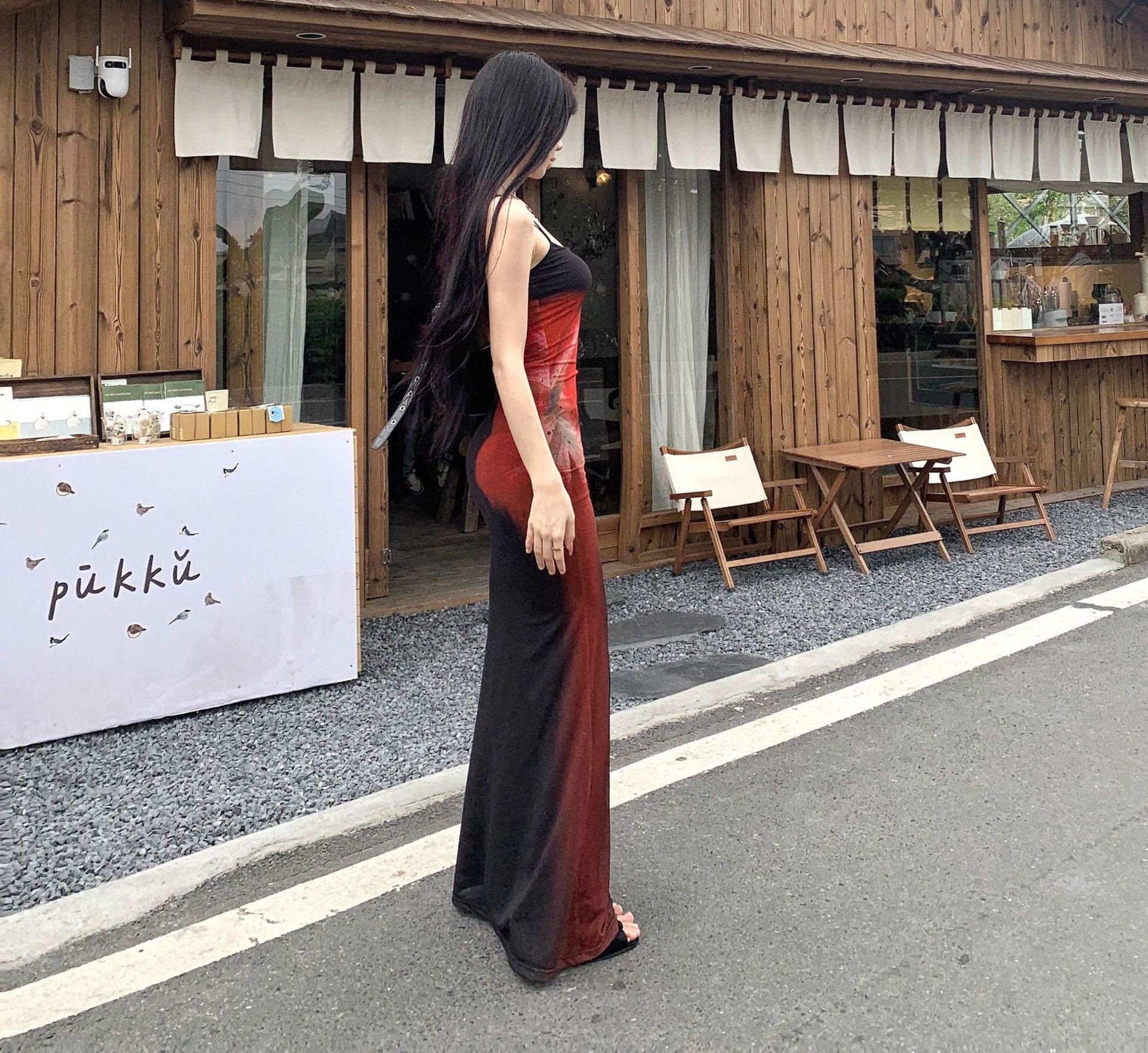 Estilo Lujuria Pura Sexy Vestido de Tirantes Estampado de Chica Caliente para Mujer Verano Nuevo Estilo Cintura Ajustada Cadera Falda Larga