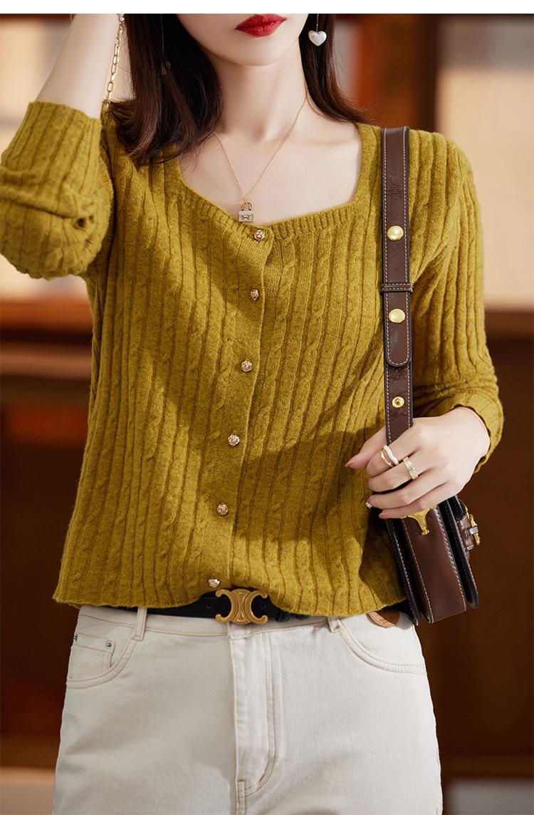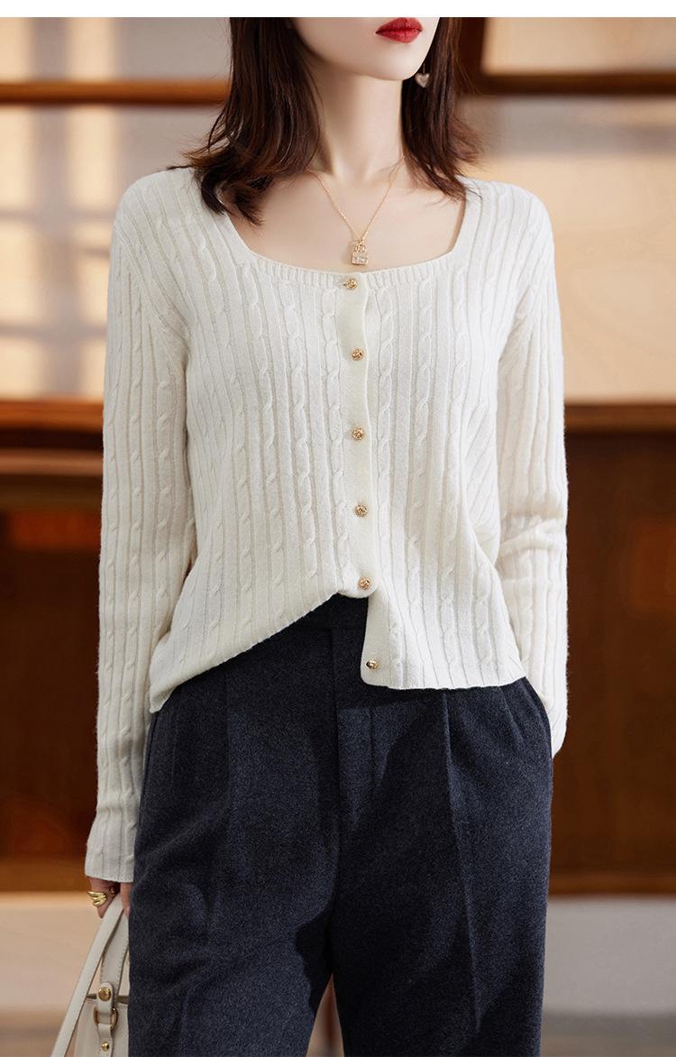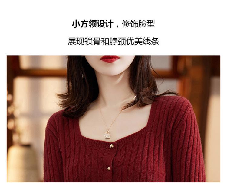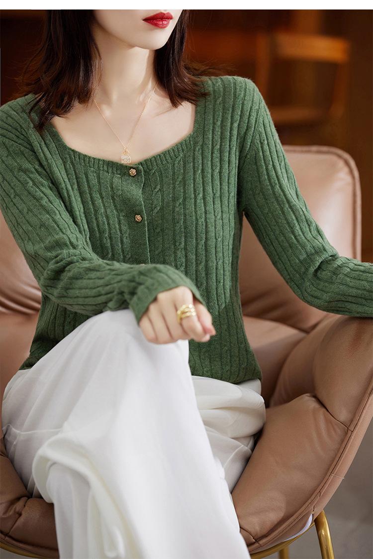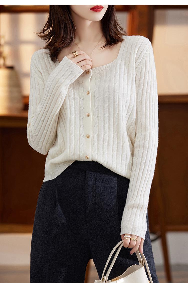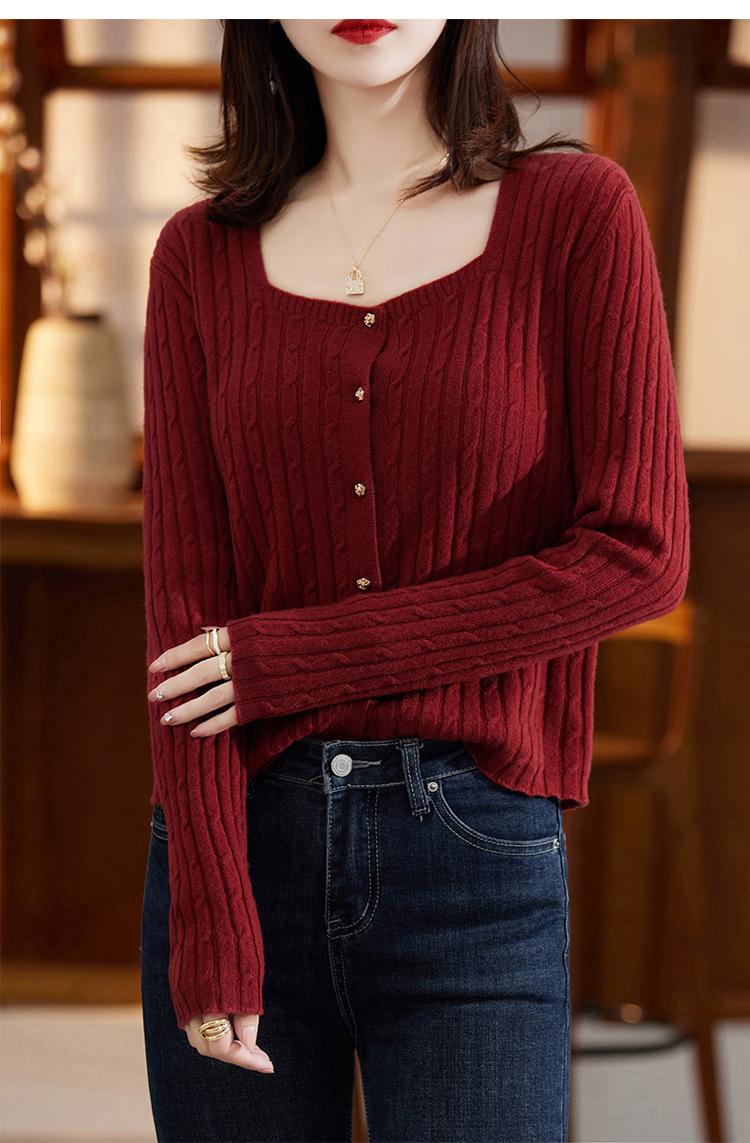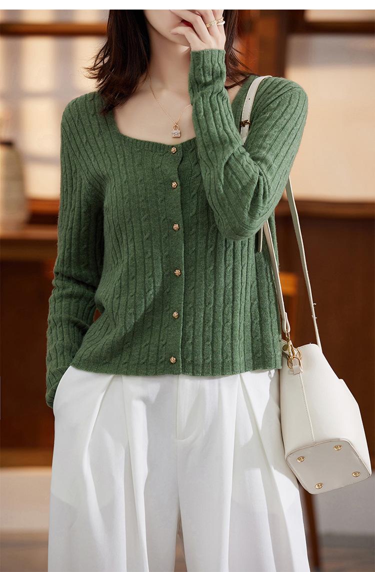 Cárdigan Retro de Punto Trenzado de Lana Pura para Mujer Otoño/Invierno Nuevo Estilo Versátil Diseño de Cuello Cuadrado Suéter Abrigo Corto