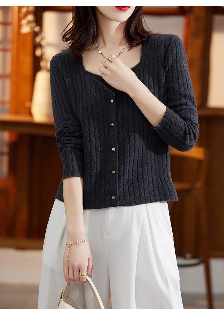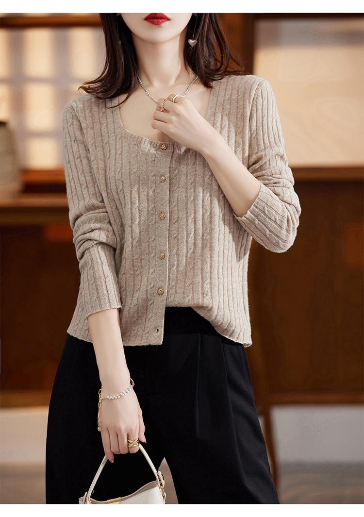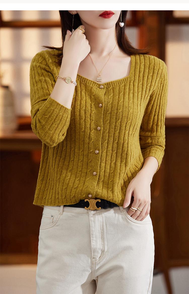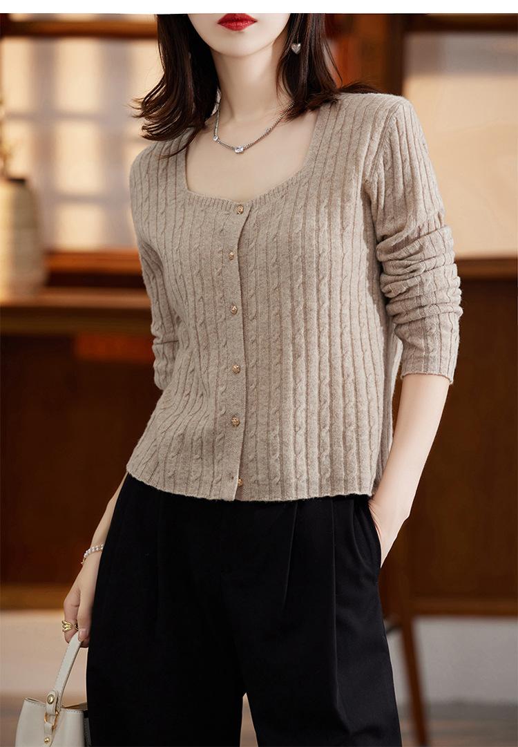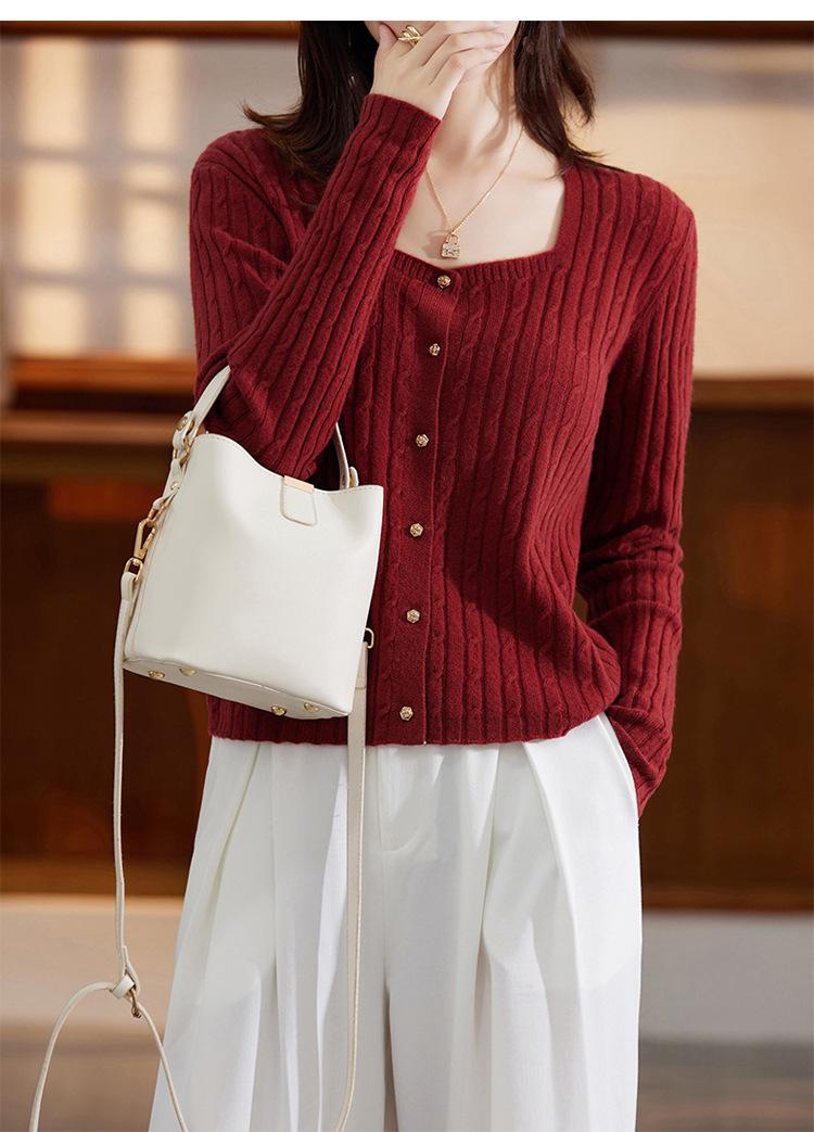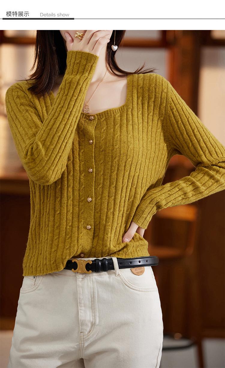Cárdigan Retro de Punto Trenzado de Lana Pura para Mujer Otoño/Invierno Nuevo Estilo Versátil Diseño de Cuello Cuadrado Suéter Abrigo Corto
