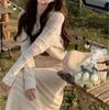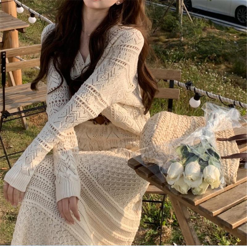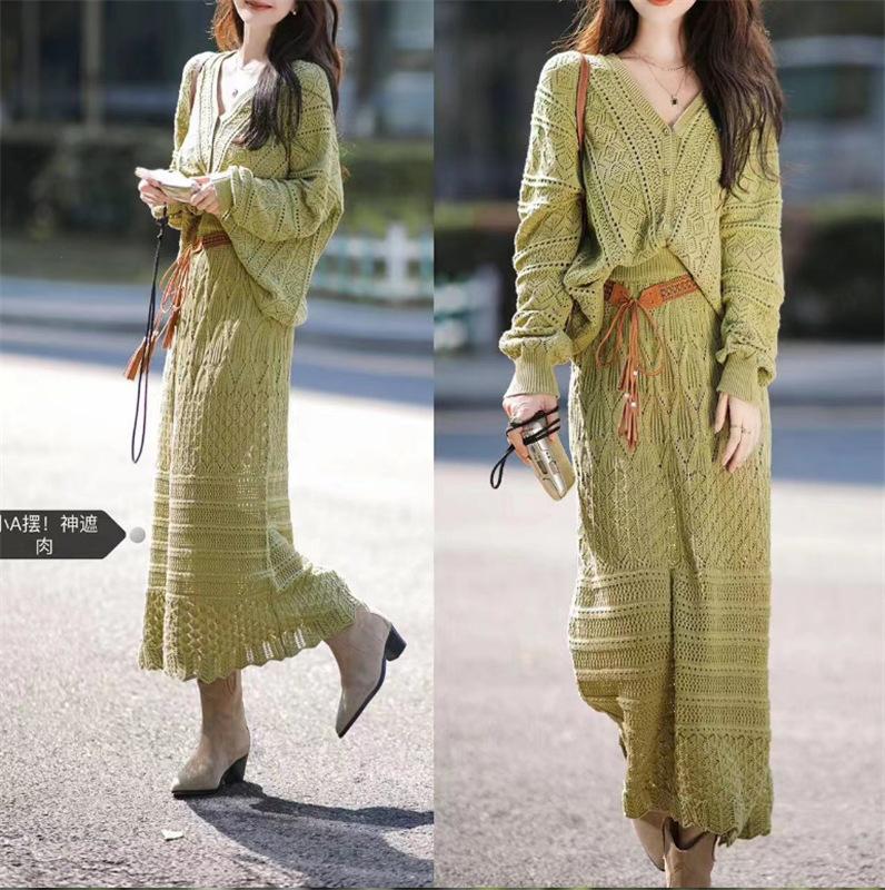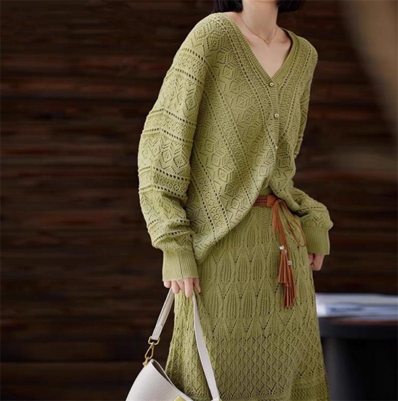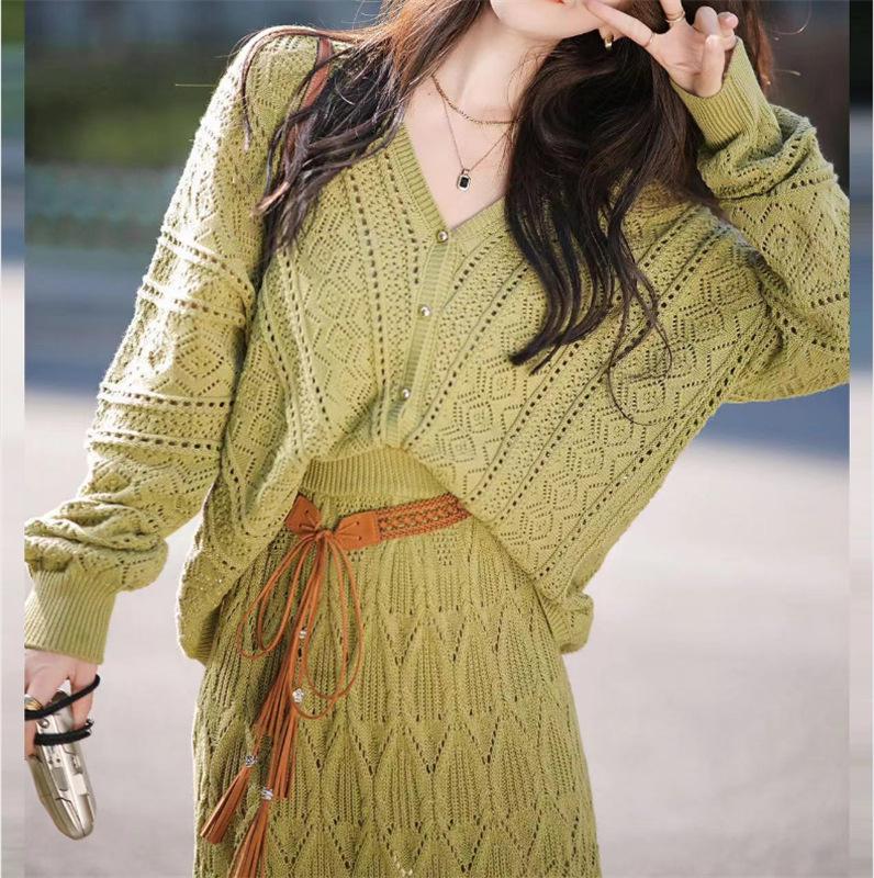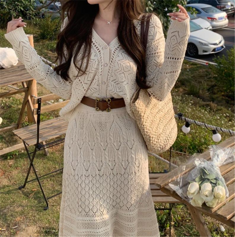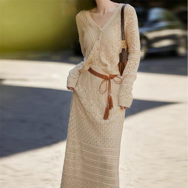 Traje hueco de punto suave de moda Cárdigan Falda Primavera y Verano Nuevo sentido del diseño Estilo occidental Reductor de edad Conjunto de 2 piezas para mujer