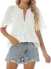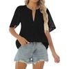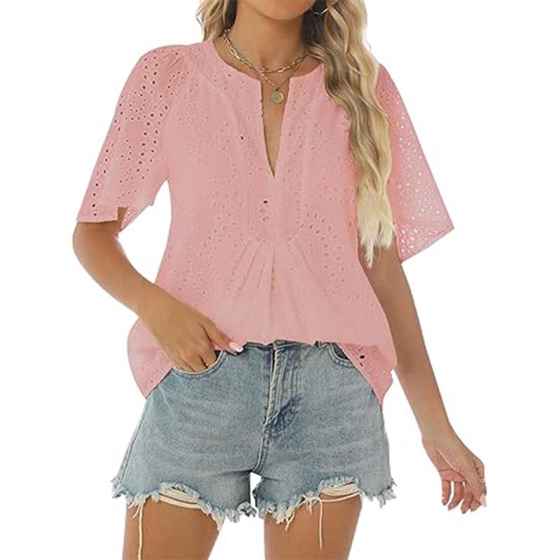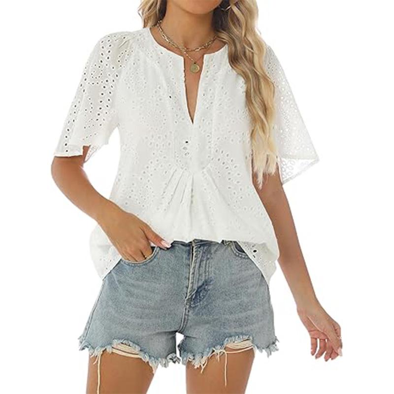 Amazon 2025 Nuevo Top de Ojalillos Europeo y Americano Transfronterizo para Mujer Cuello en V Manga Mariposa Encaje Calado Camisa Bordada