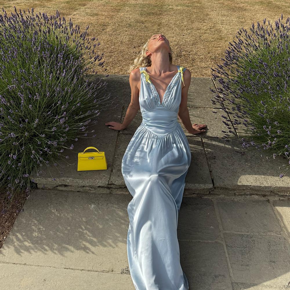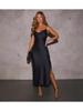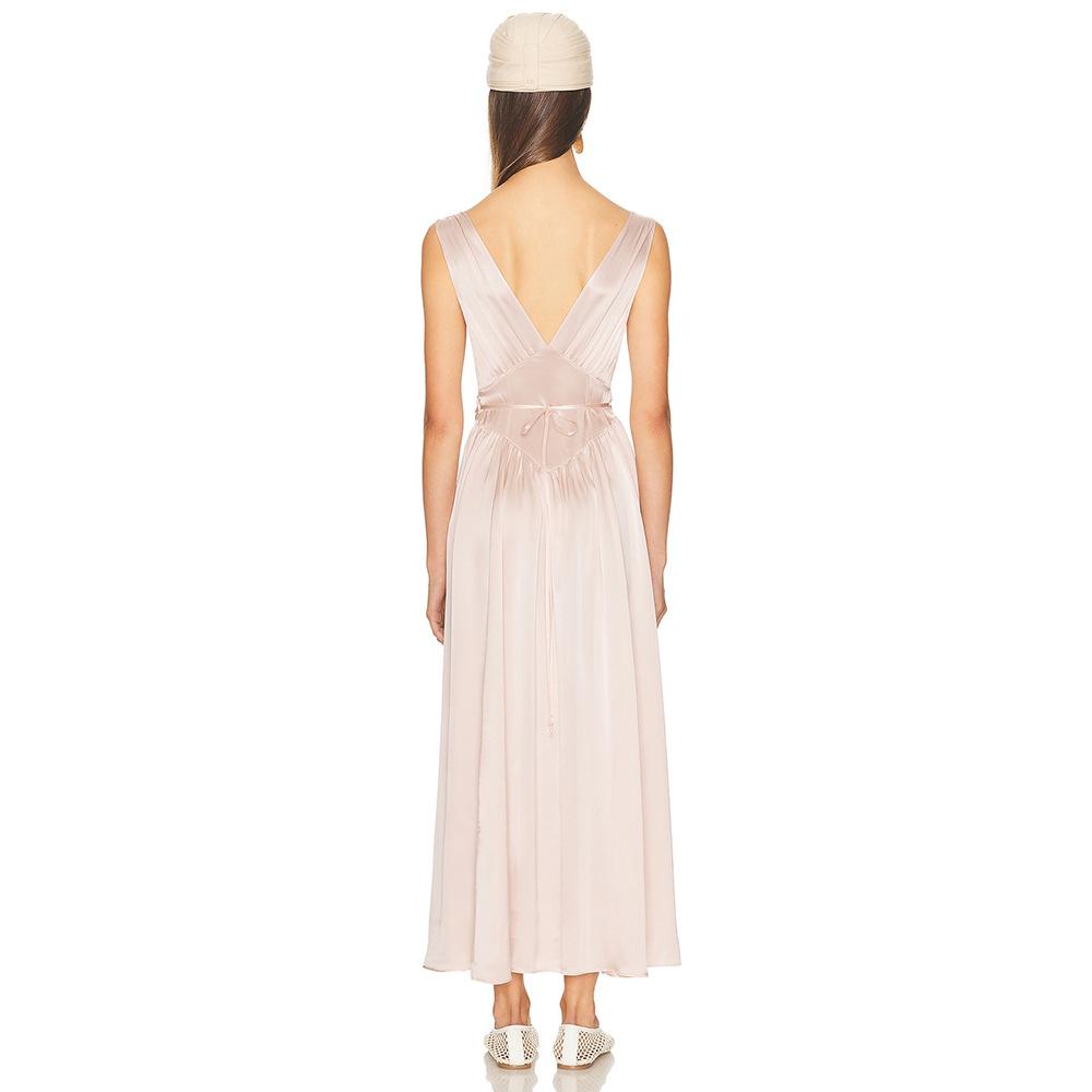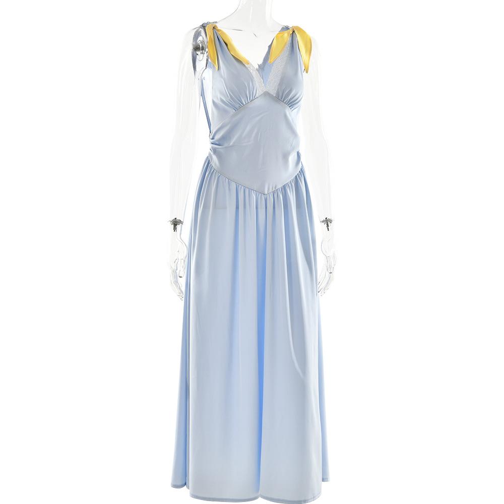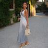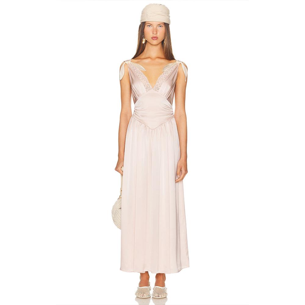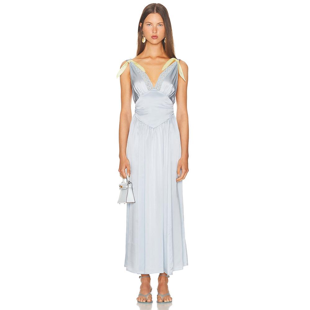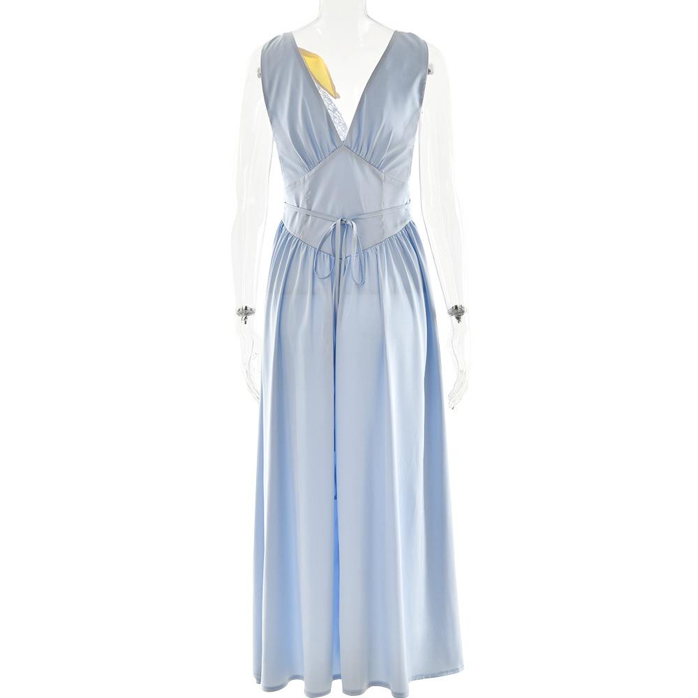 Amazon Ventas Calientes Transfronterizas Elegante Vestido de Satén con Espalda Profunda en V sin Espalda Sexy Ajustado a la Cintura Encaje Sin Mangas Color Sólido Vestido Largo
