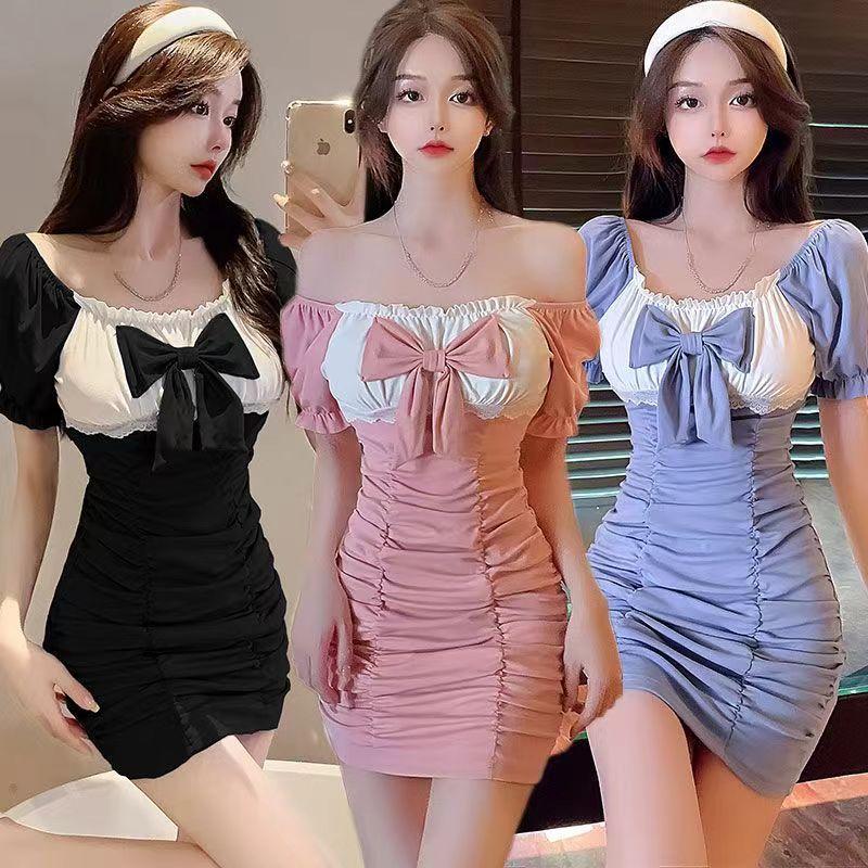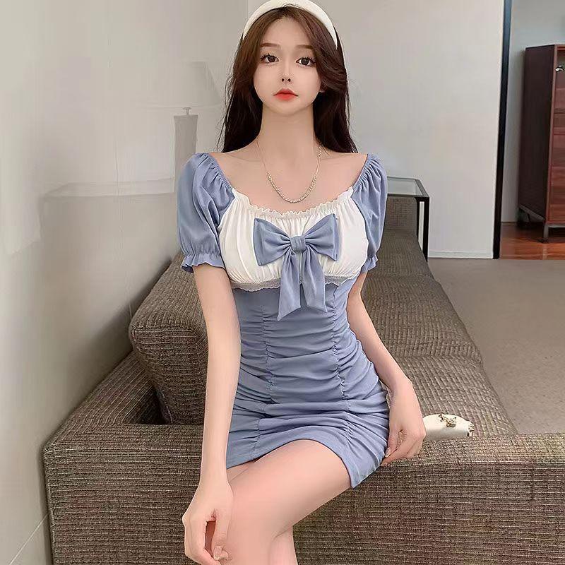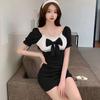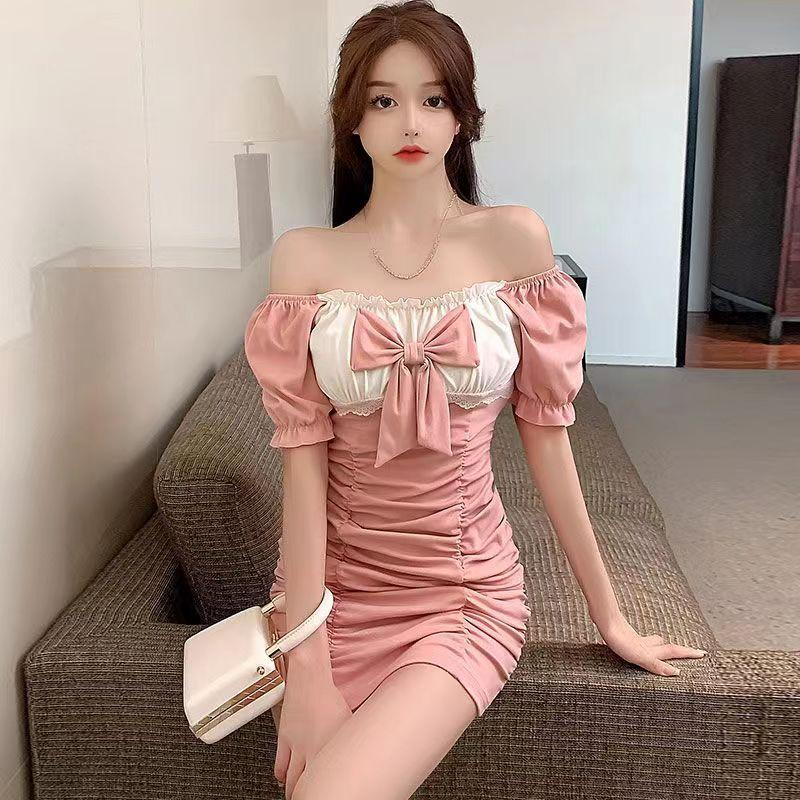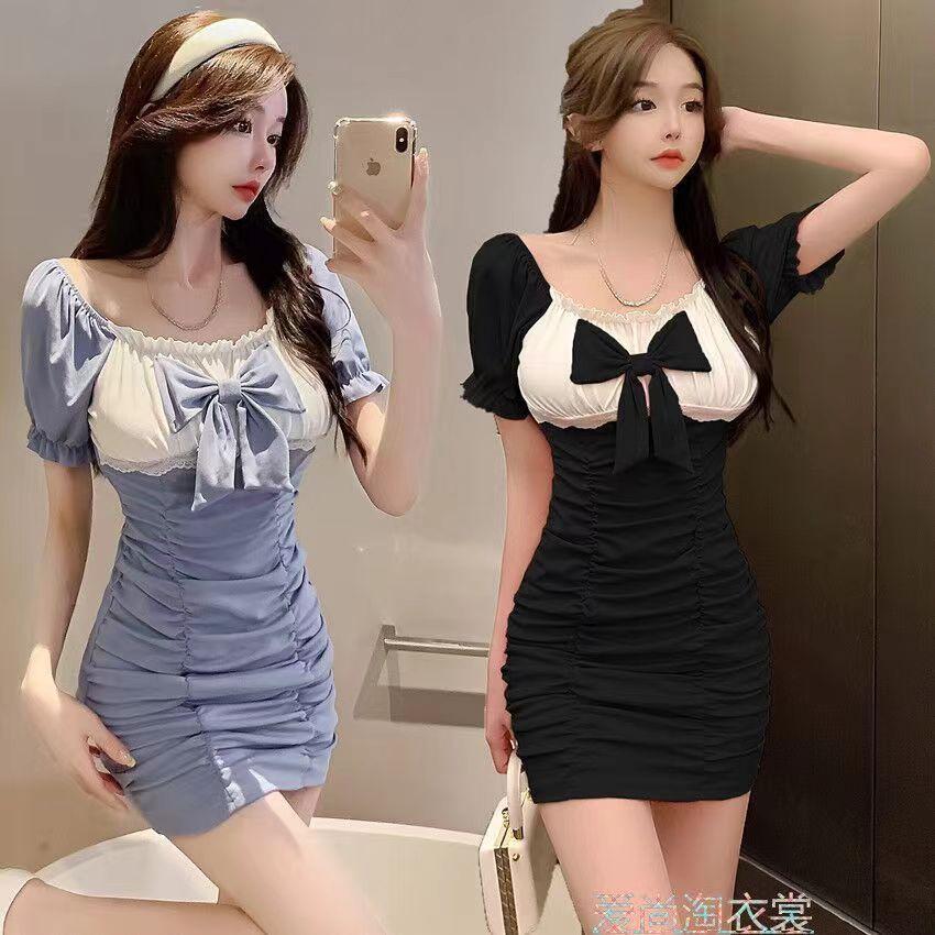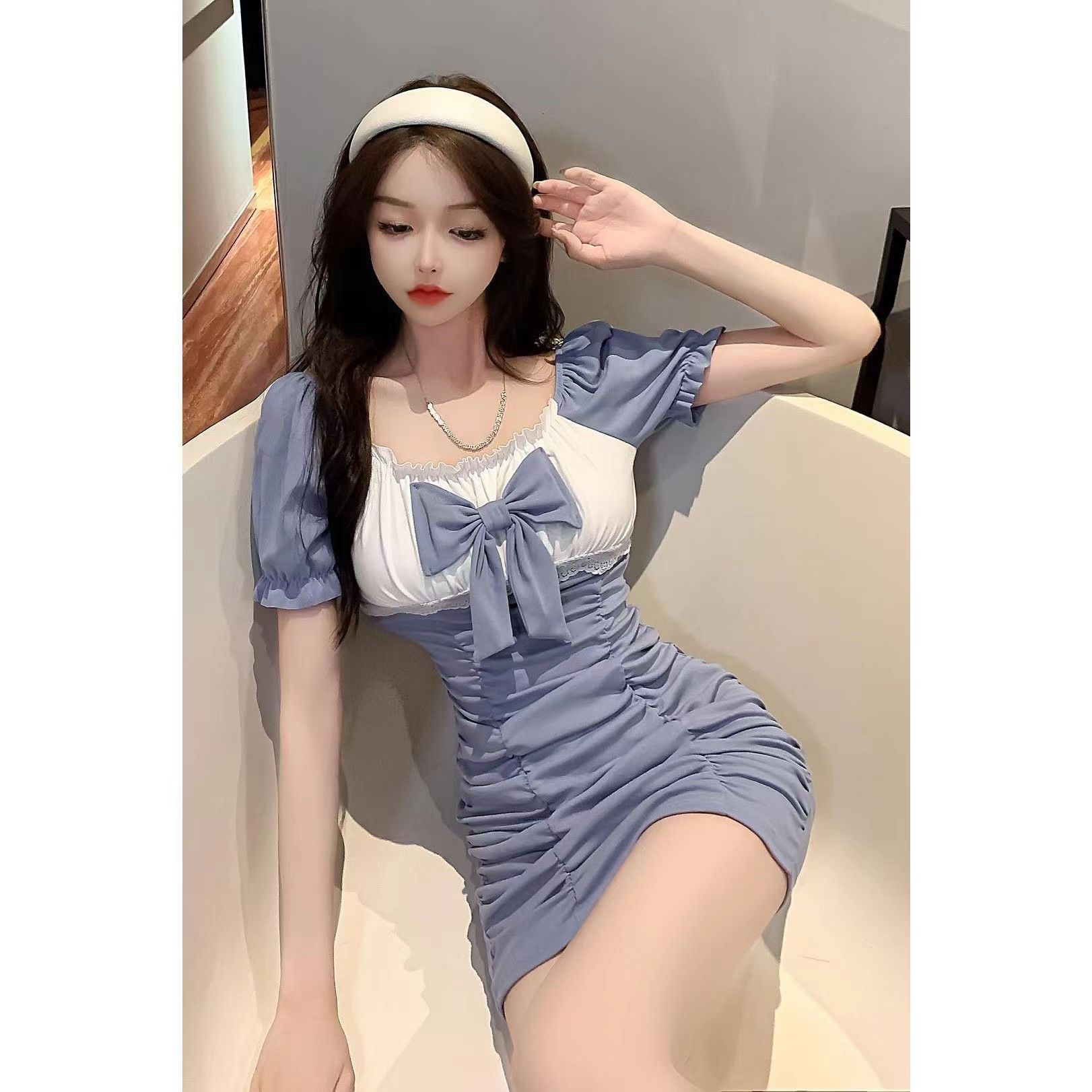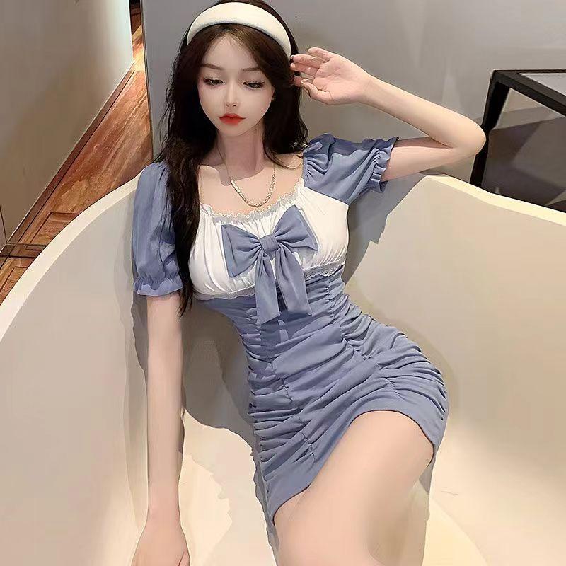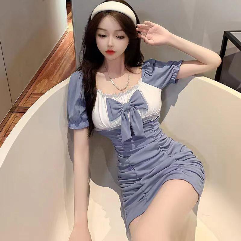 Vestido Sexy de Cadera con Escote Bajo 2024 Verano Nueva Llegada Lazo Elegante Callejero Frito Falda Base Plisada para Mujer