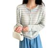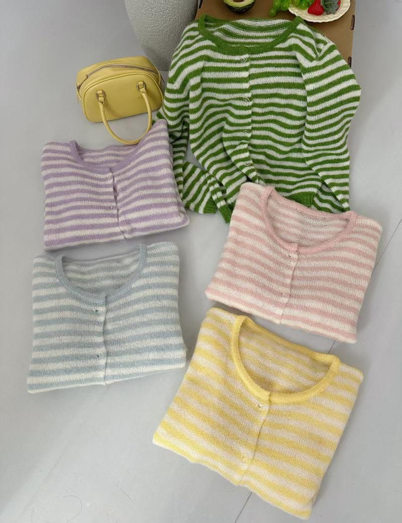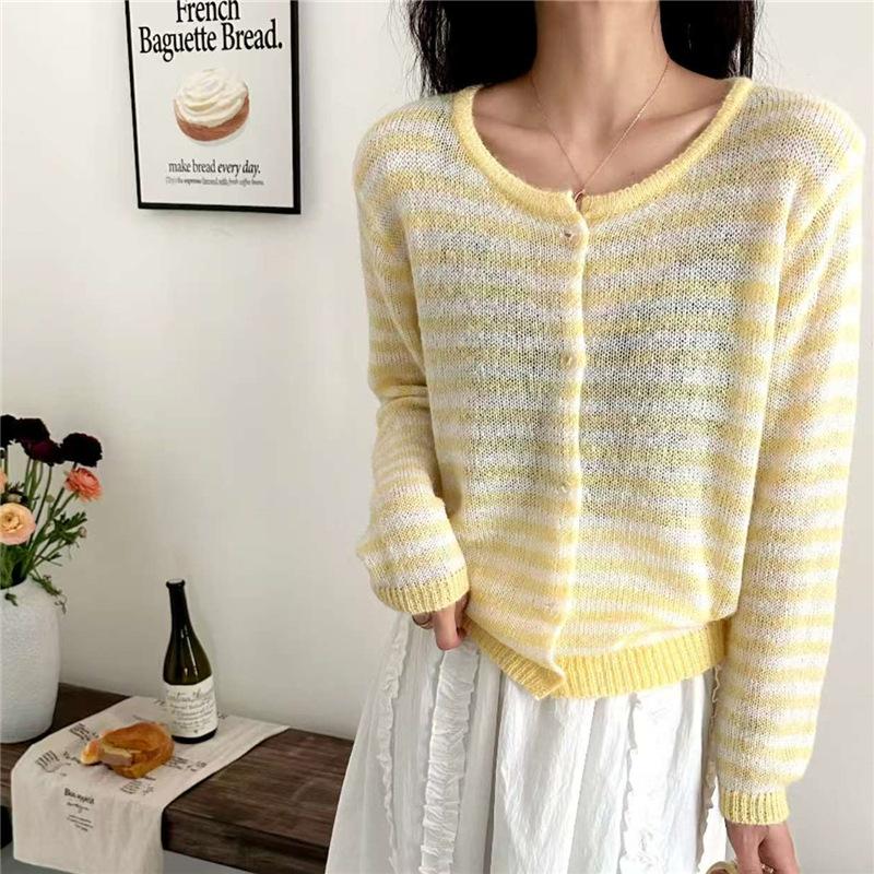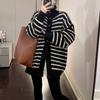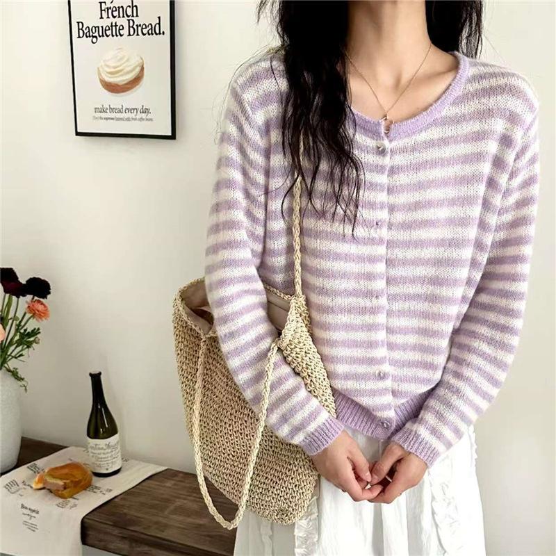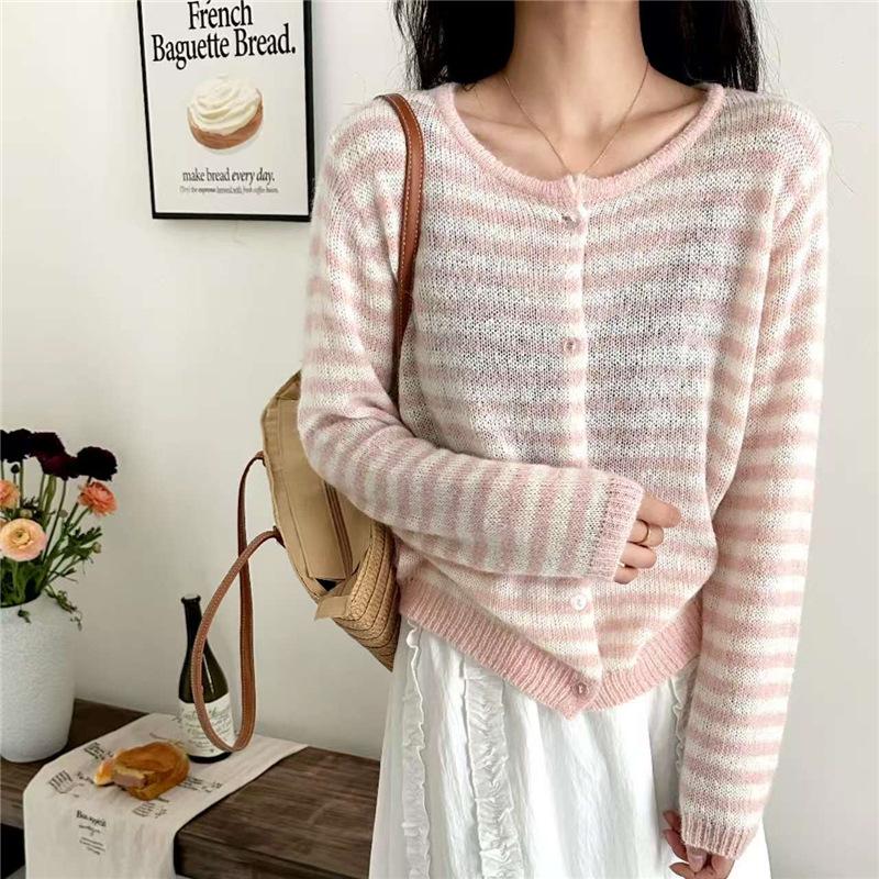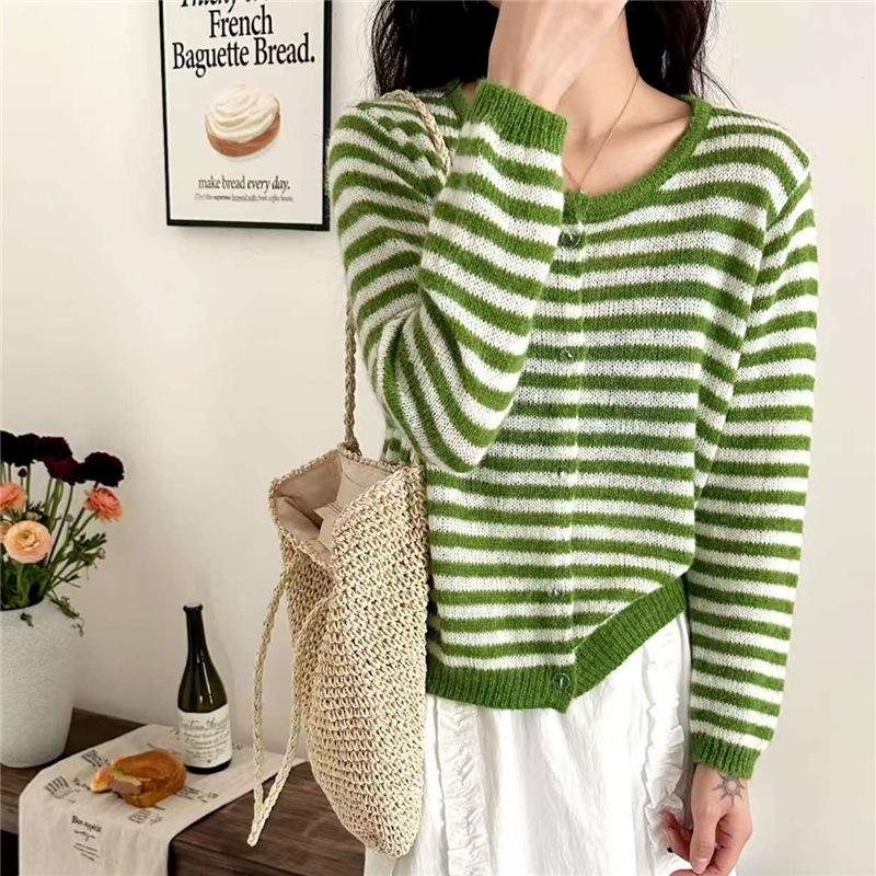 Cárdigan de punto de mohair a rayas holgado nuevo de primavera y otoño 2025, cuello redondo, top exterior, abrigo suéter corto para mujer