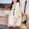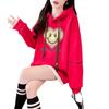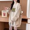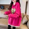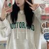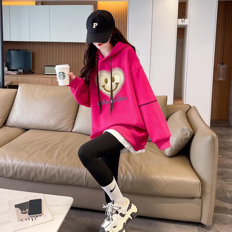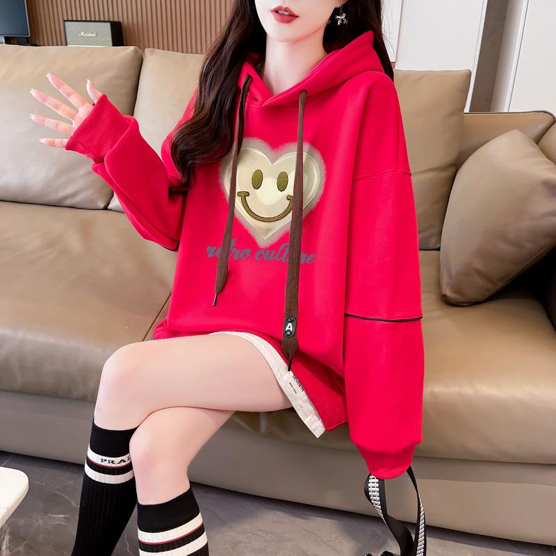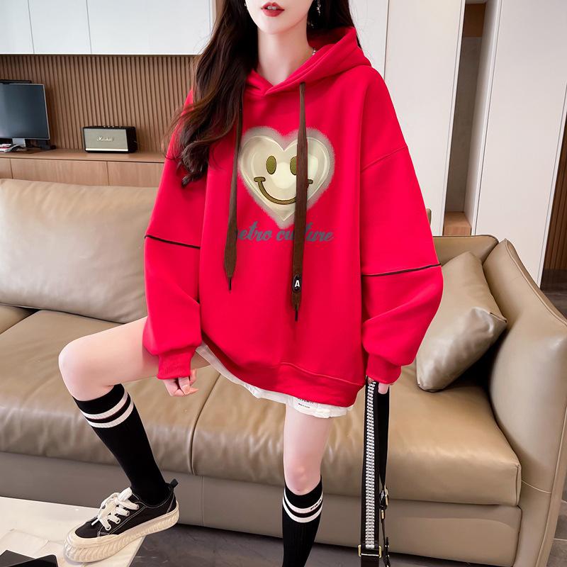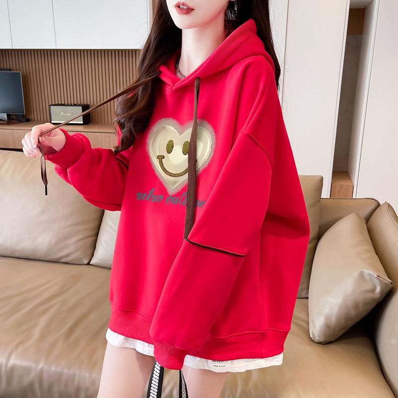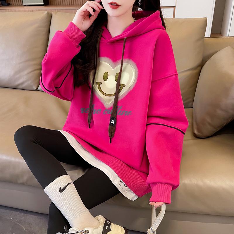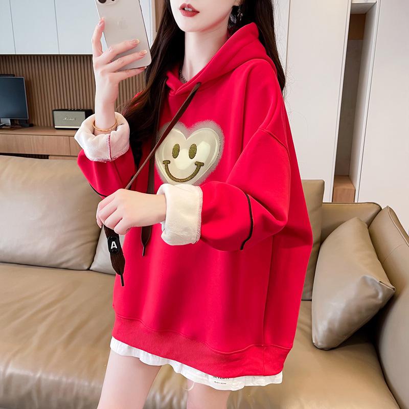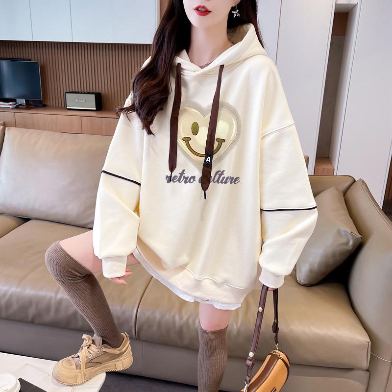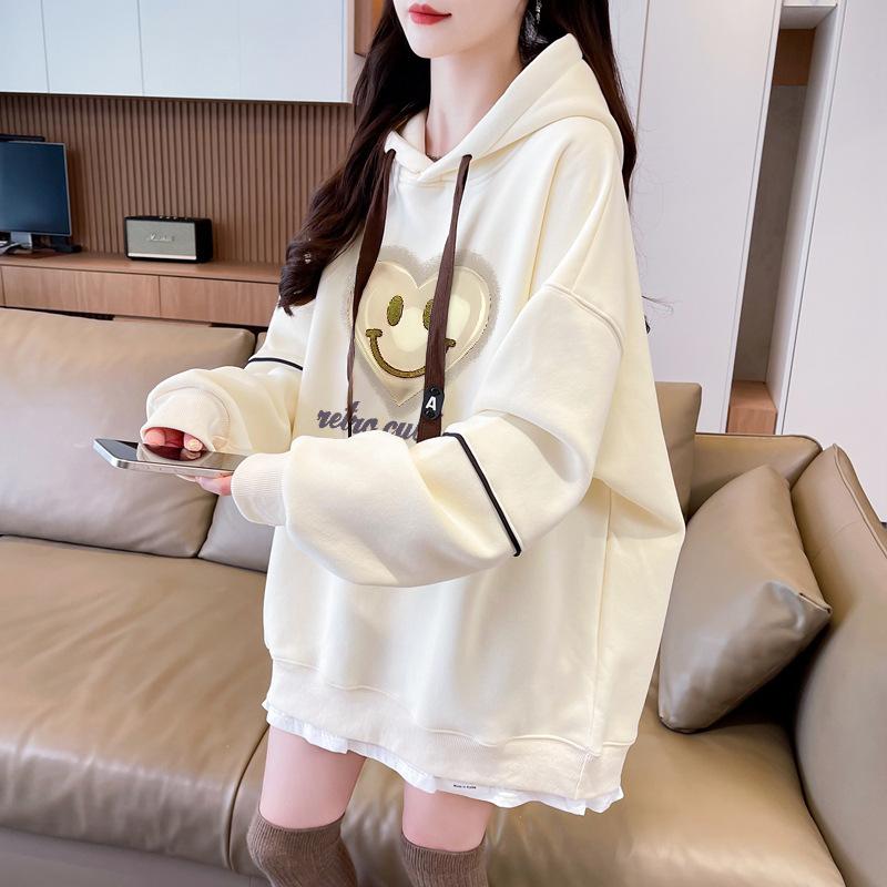 Otoño e Invierno Diseño Falso de Dos Piezas Divertido Chic Estampado de Letras con Cara Sonriente Forrado de Felpa Grueso Holgado Adelgazante Sudadera con Capucha
