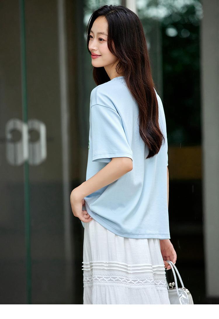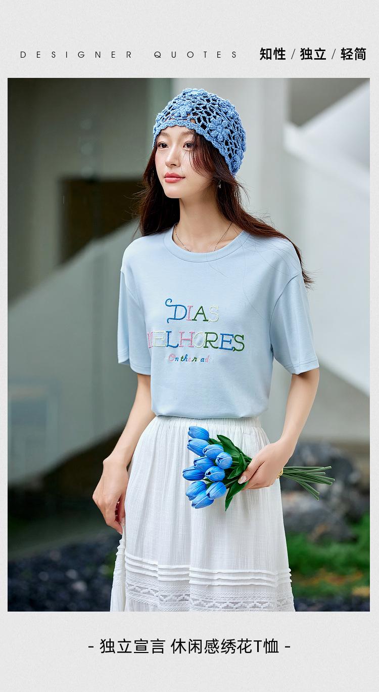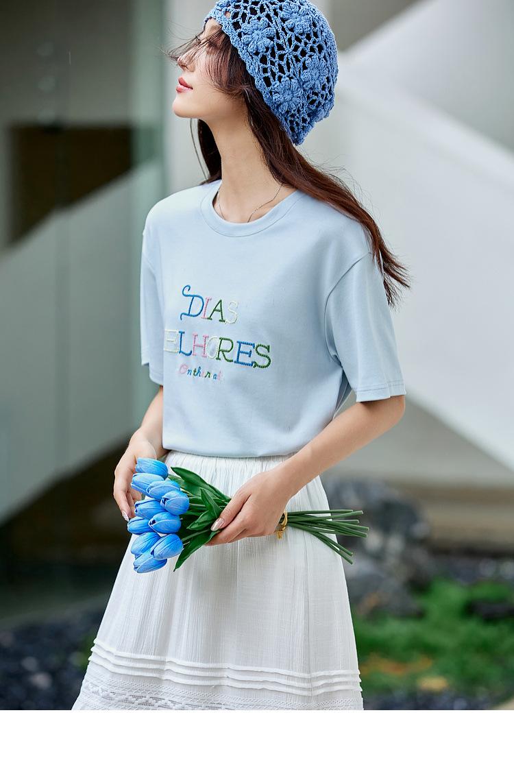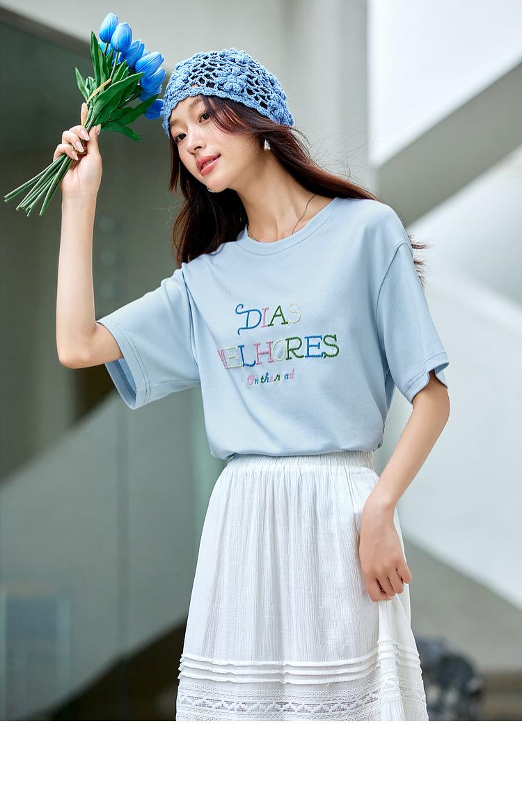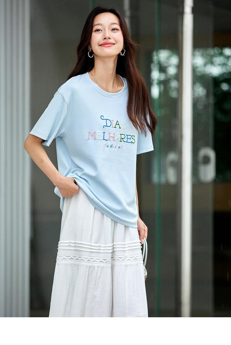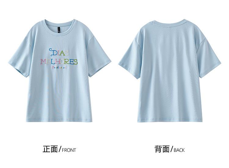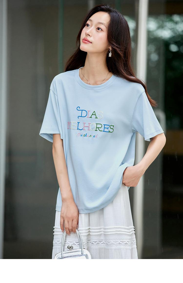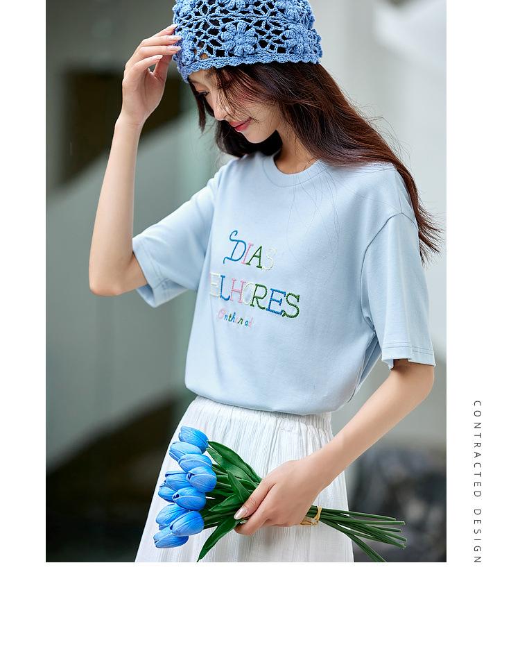 Zhenxi Nueva Carta Bordada Cuello Redondo Manga Corta Algodón Camiseta para Mujer Holgada Casual Versátil Top Sq916