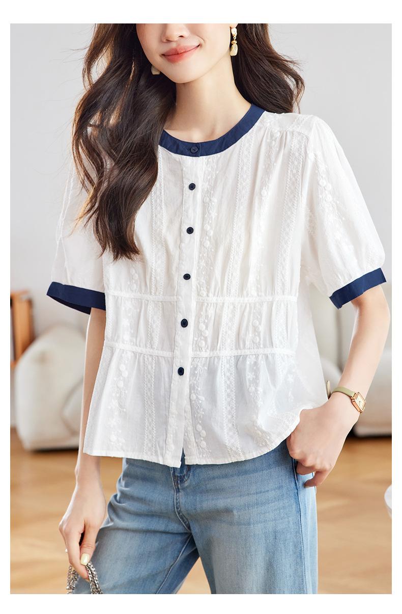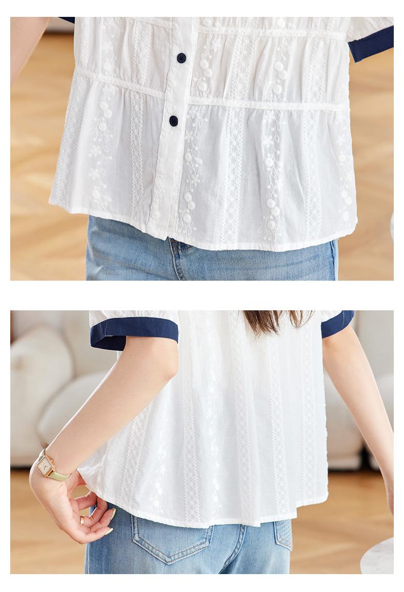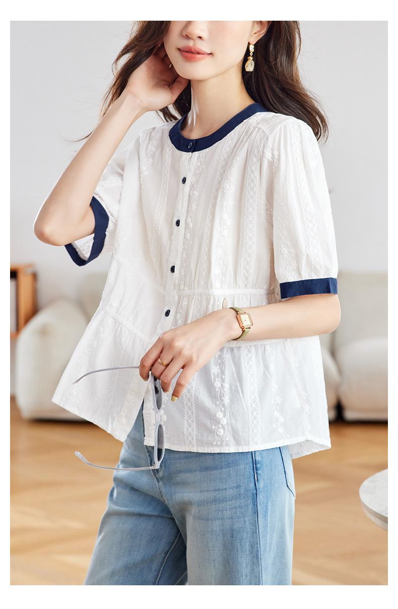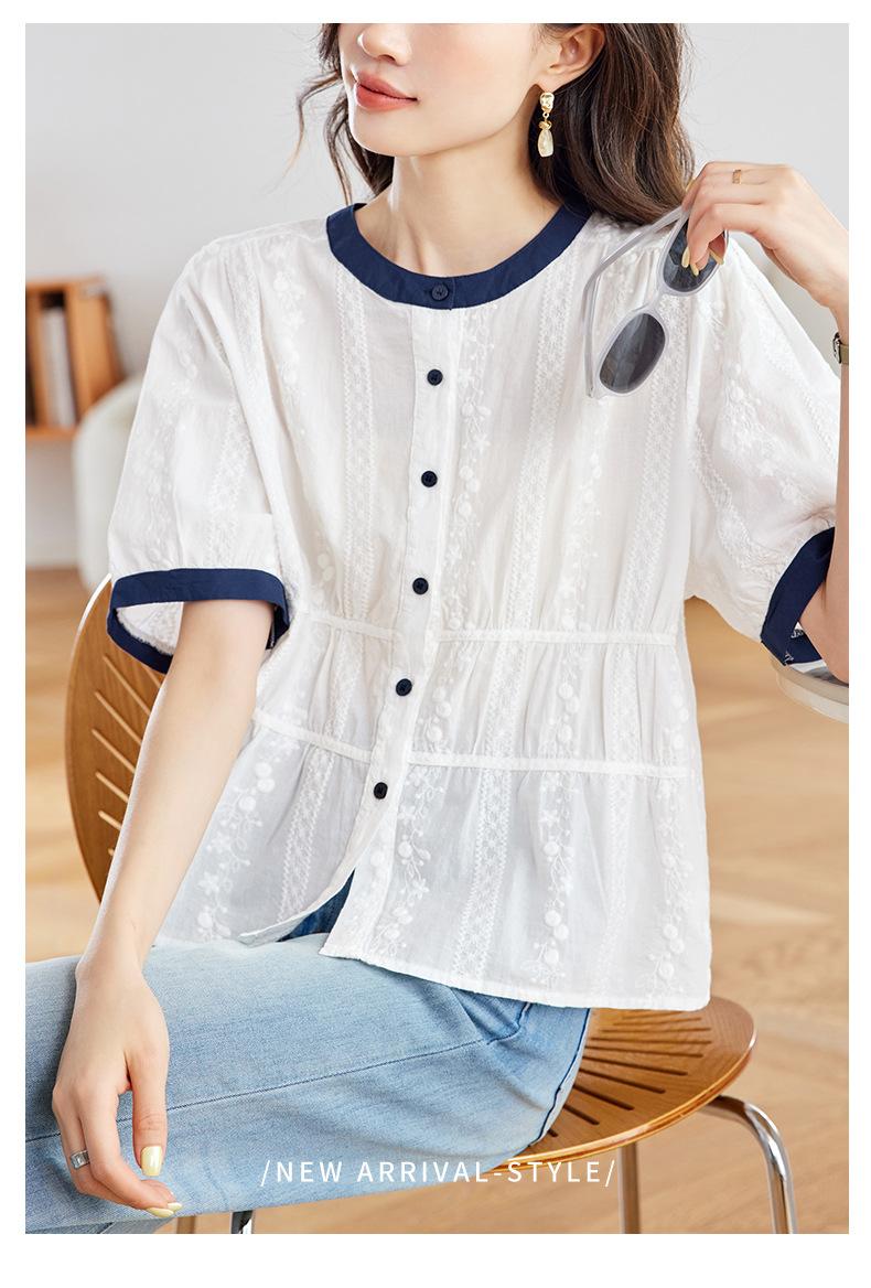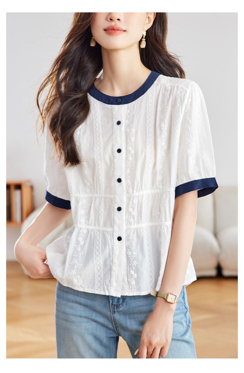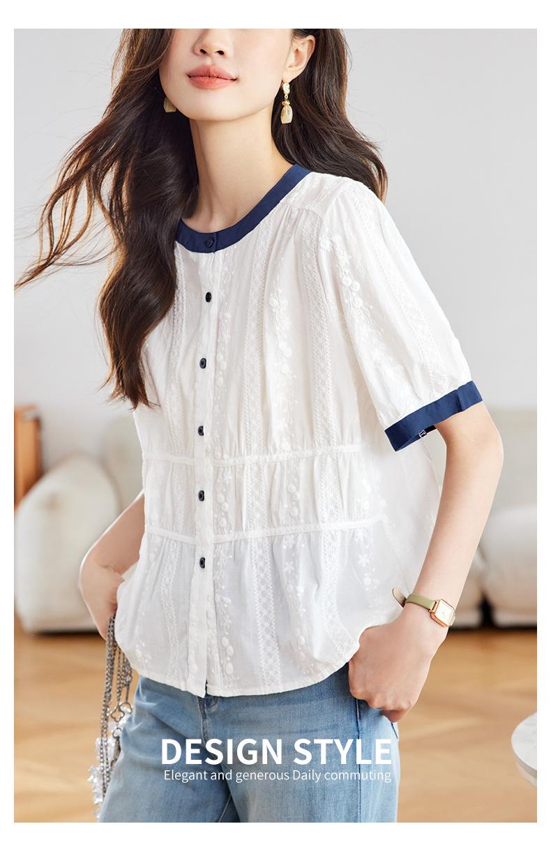 Camiseta de Algodón Capullo Bordado Cuello Redondo Manga Corta Mujer Verano 2025 Nuevo Temperamento Bloque de Color Camiseta Todo Algodón Blusa Casual