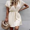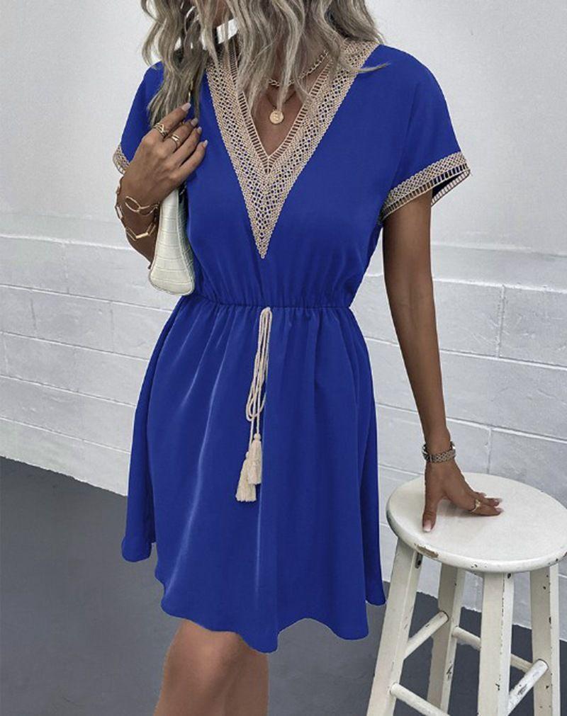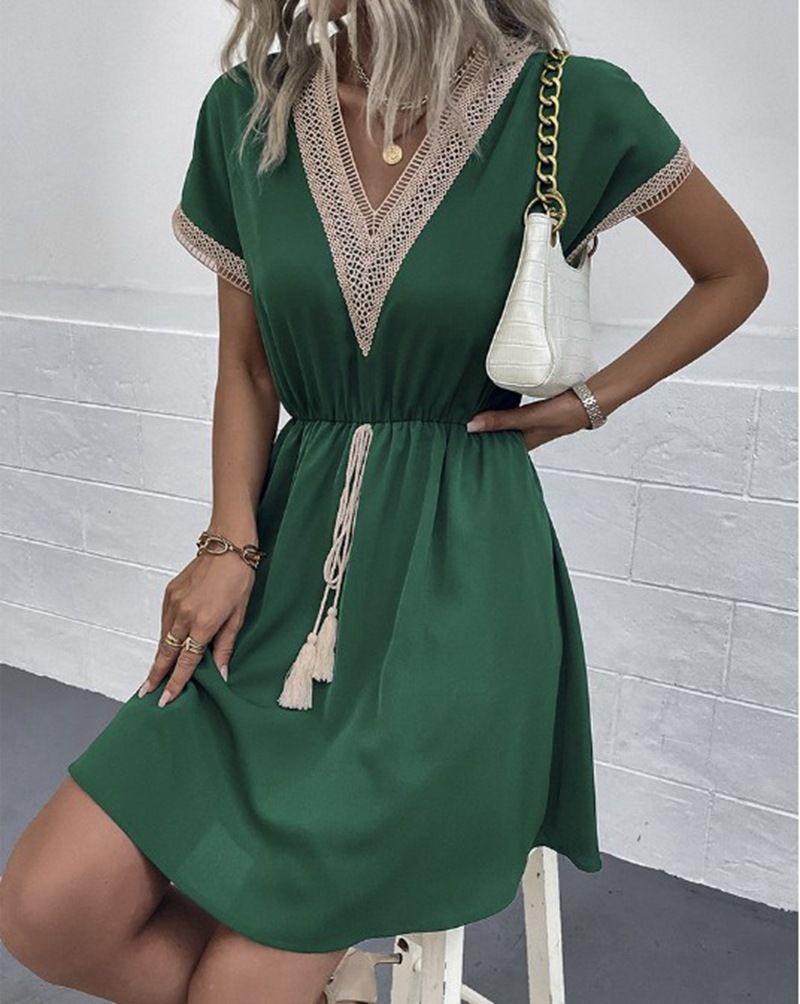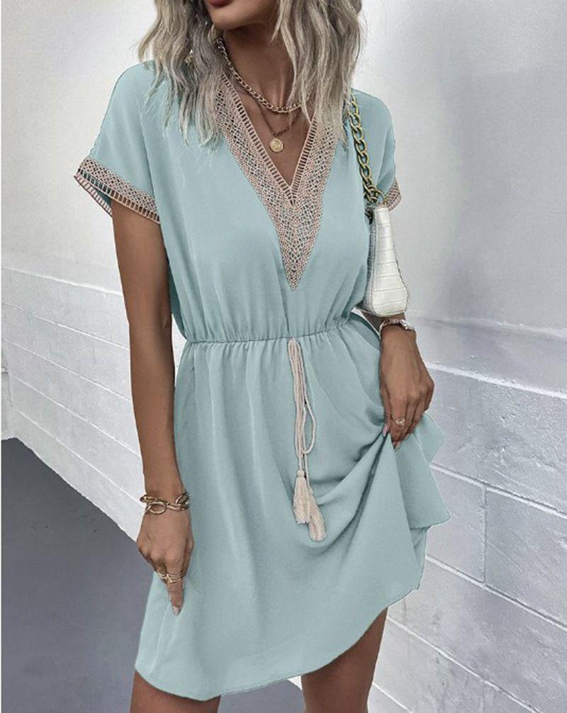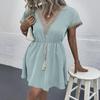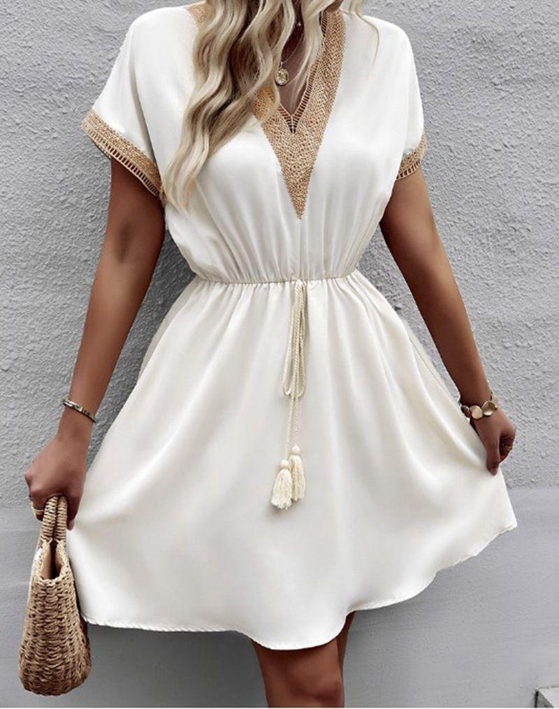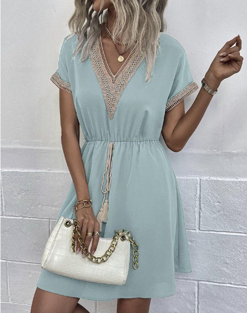 Vestido de primavera y verano con cuello en V y manga corta de color liso con encaje de Amazon 2025 para comercio exterior transfronterizo entre Europa y Estados Unidos
