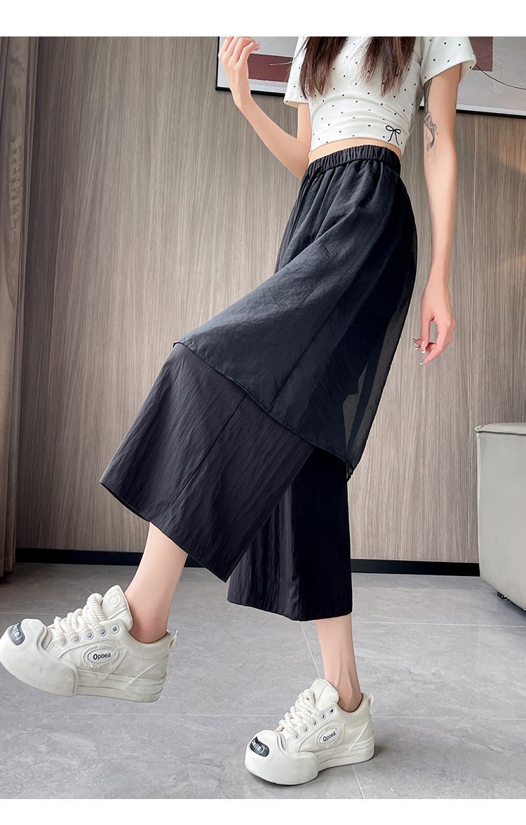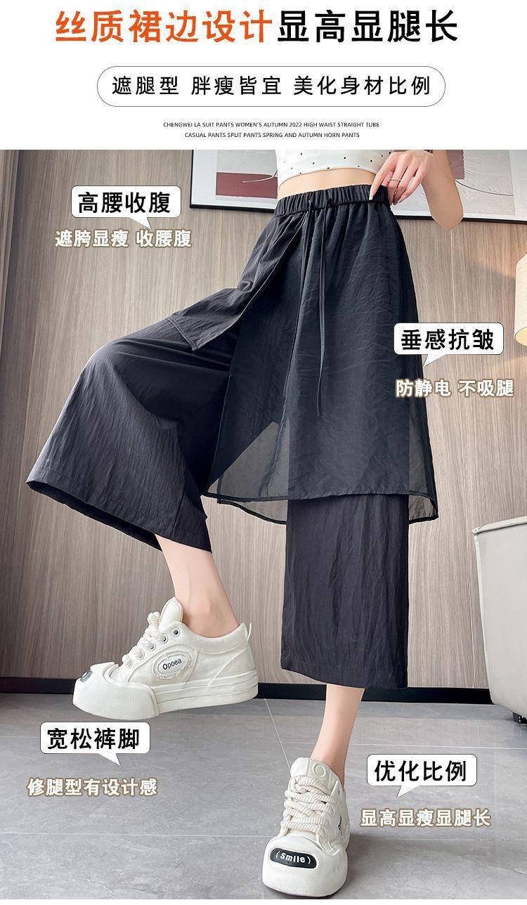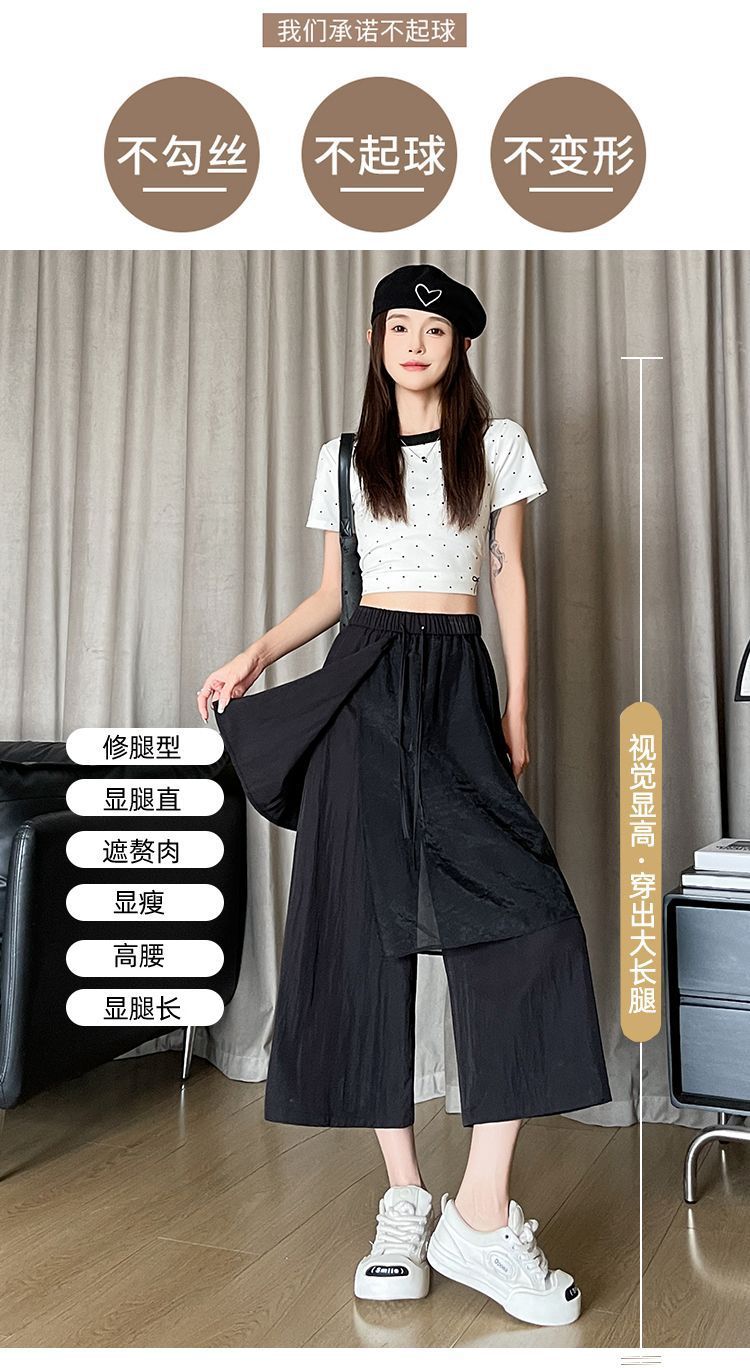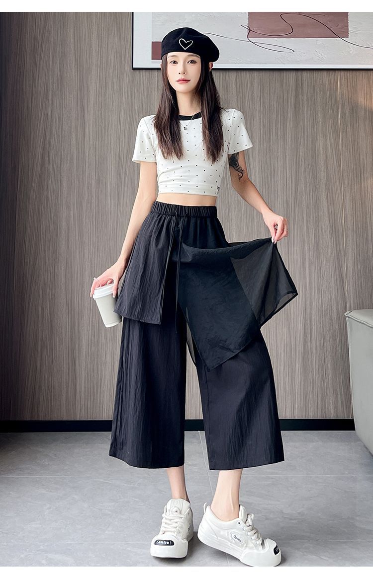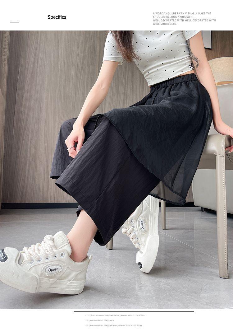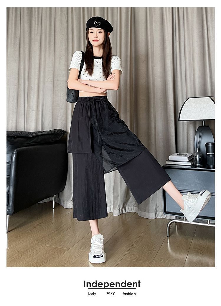 Pantalones Negros de Pierna Ancha Mujer Verano Delgados 2025 Nuevo Sentido del Diseño Costuras de Malla Solapa Trasera Casual Adelgazantes Pantalones Falda Nueve Puntos