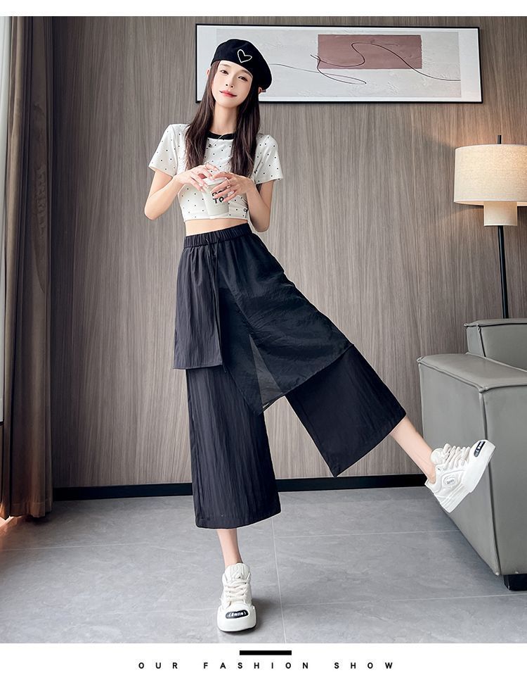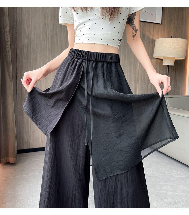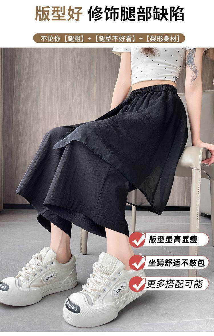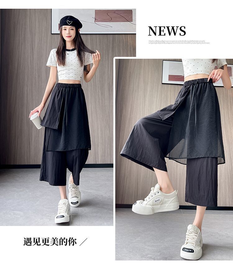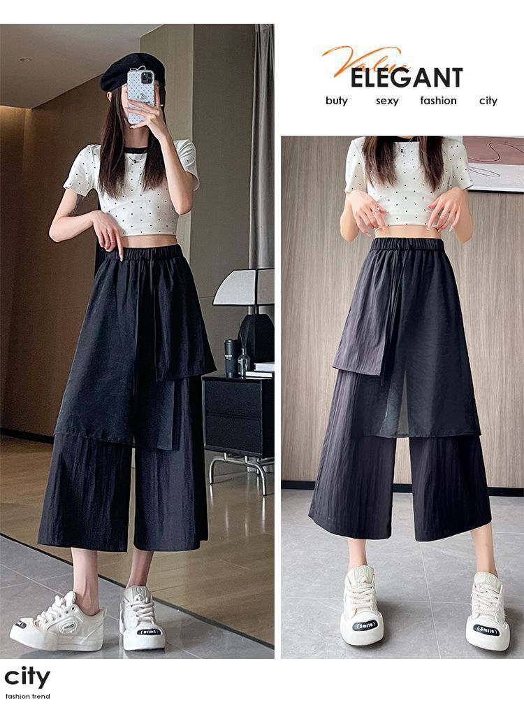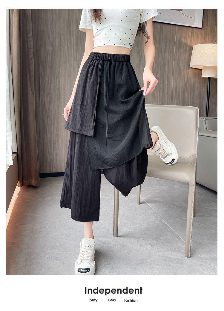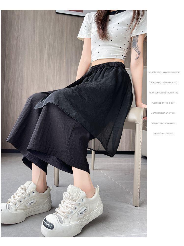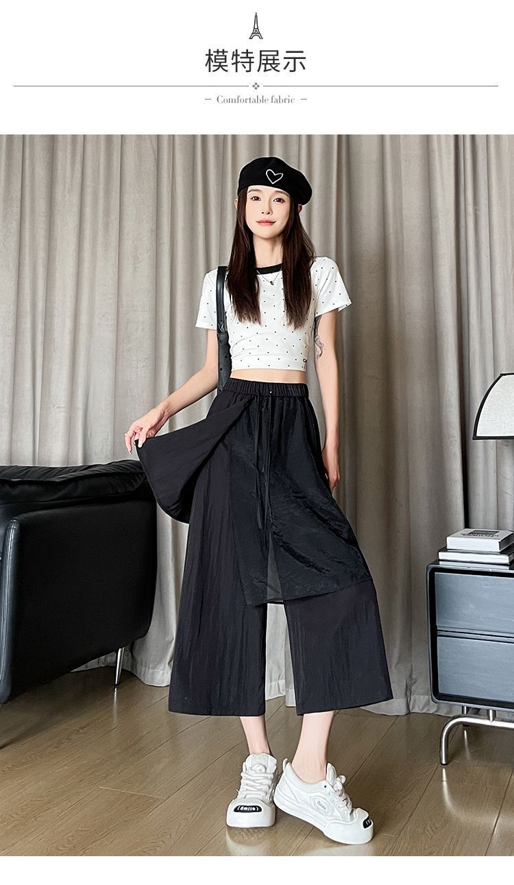 Pantalones Negros de Pierna Ancha Mujer Verano Delgados 2025 Nuevo Sentido del Diseño Costuras de Malla Solapa Trasera Casual Adelgazantes Pantalones Falda Nueve Puntos