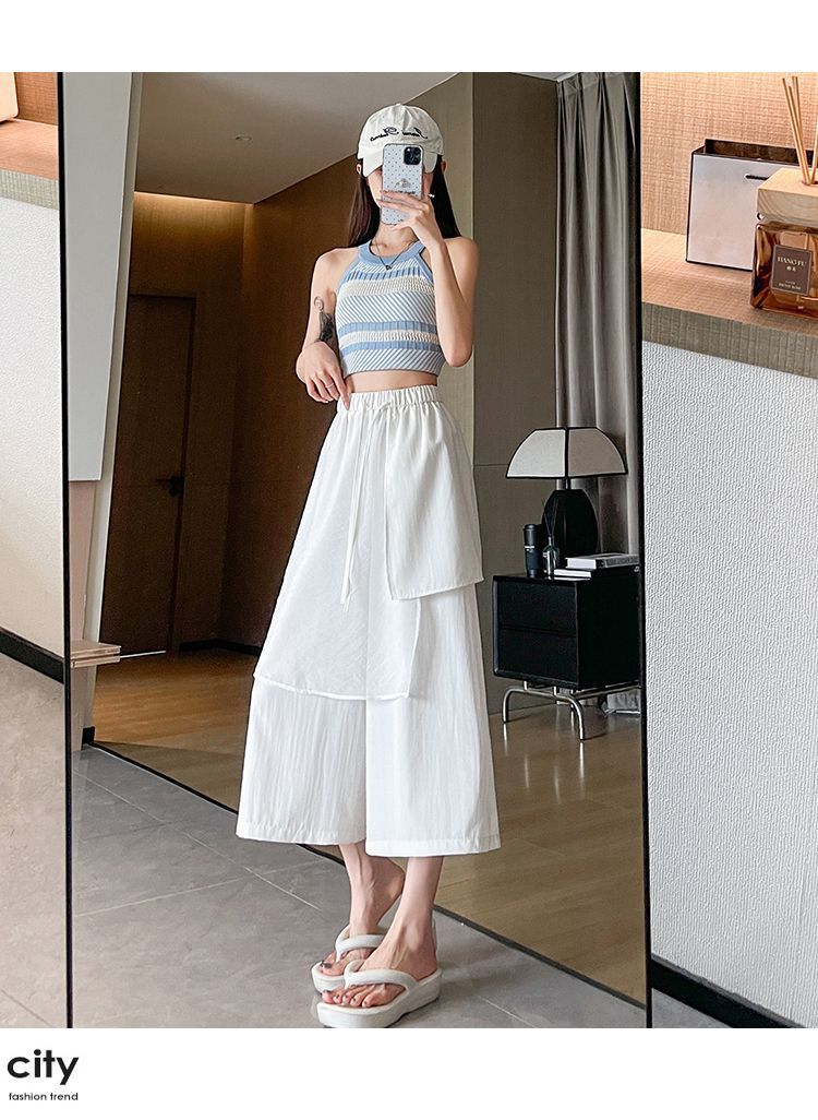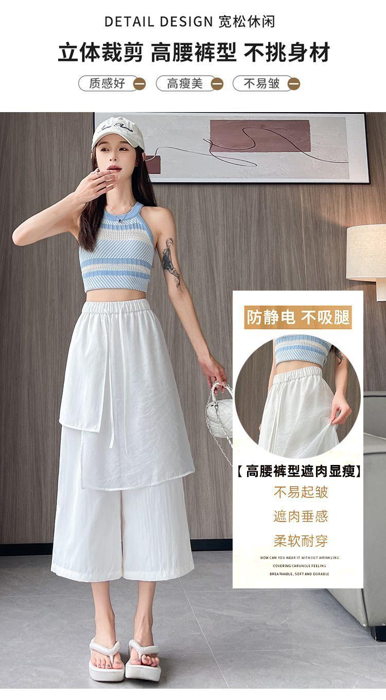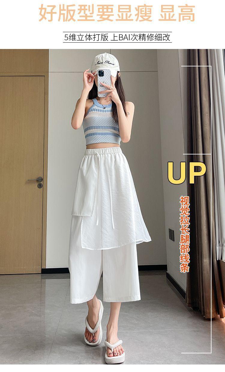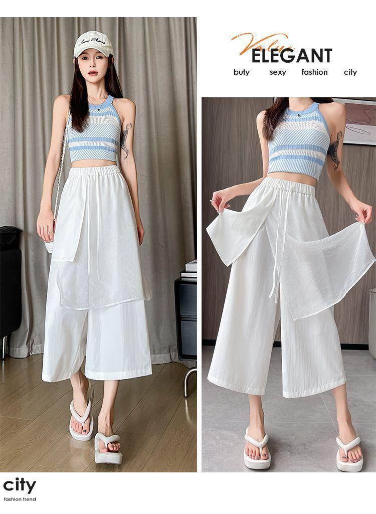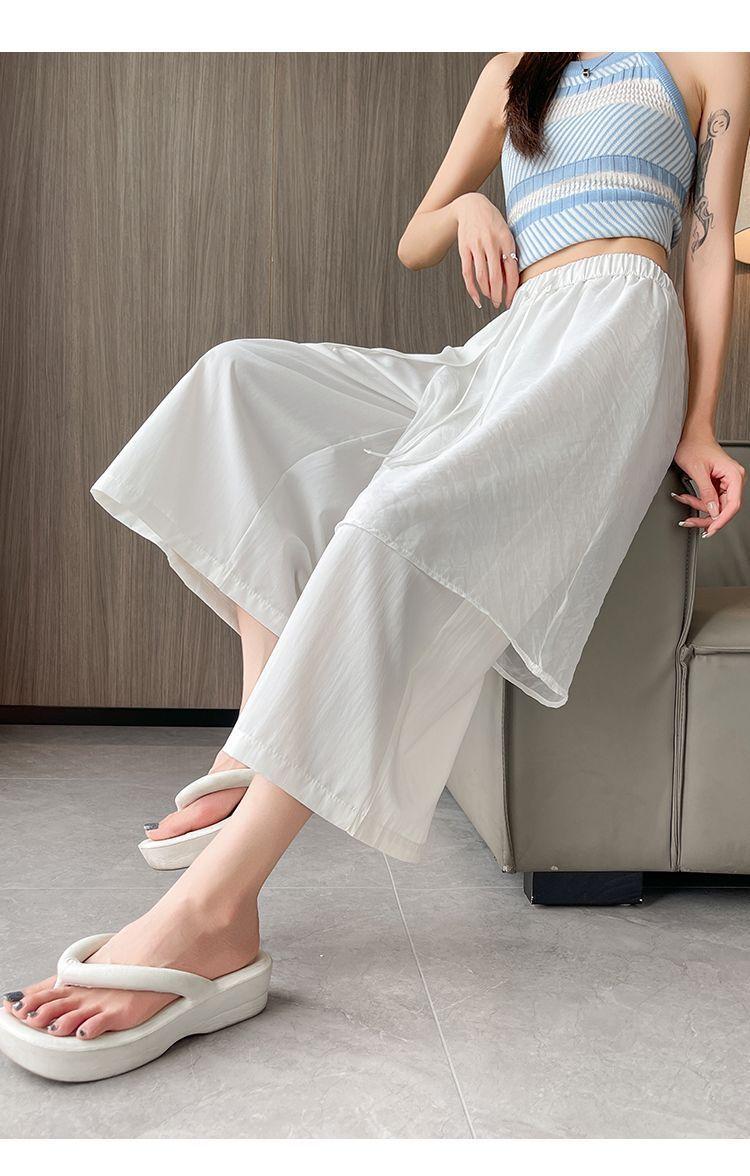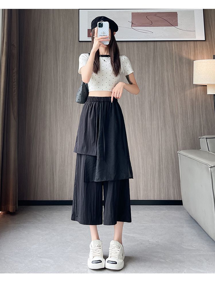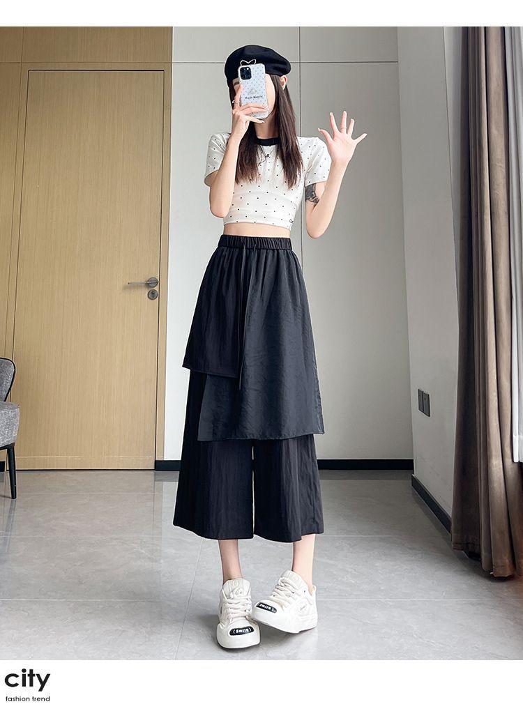 Pantalones Negros de Pierna Ancha Mujer Verano Delgados 2025 Nuevo Sentido del Diseño Costuras de Malla Solapa Trasera Casual Adelgazantes Pantalones Falda Nueve Puntos