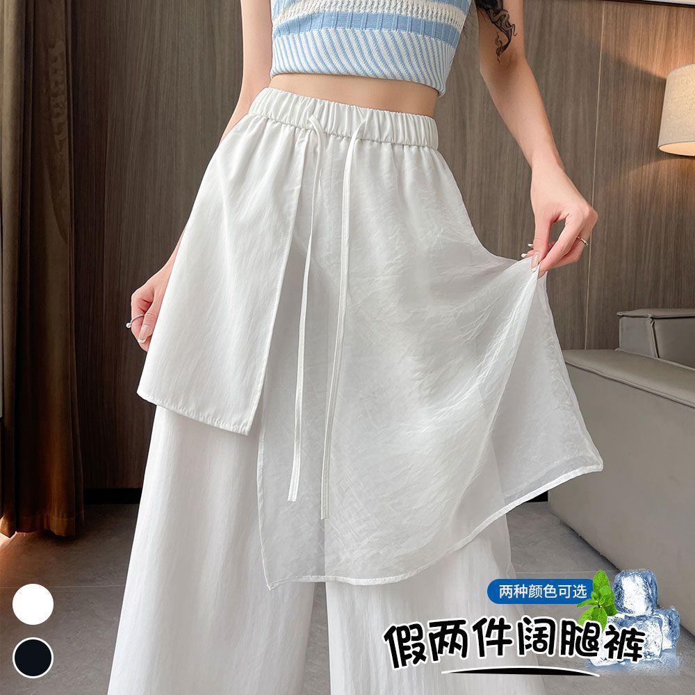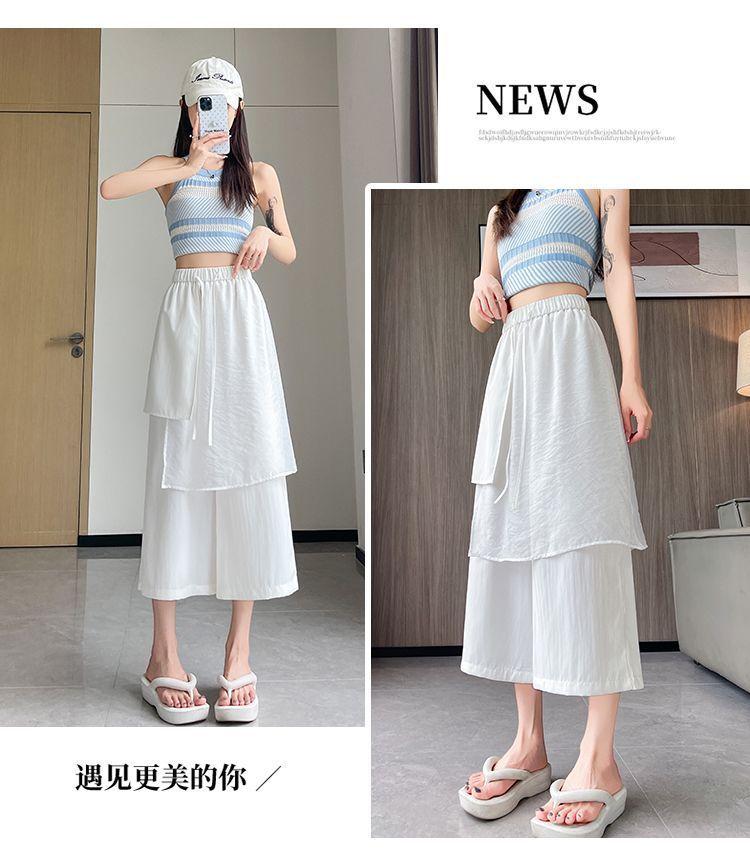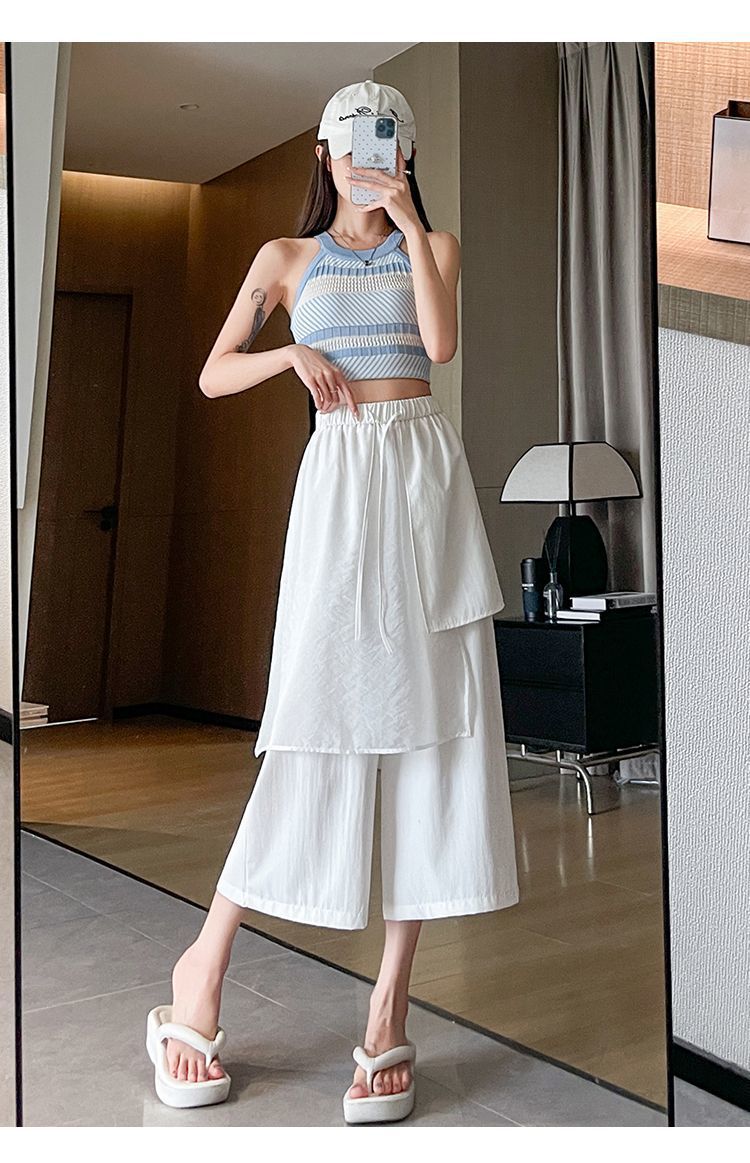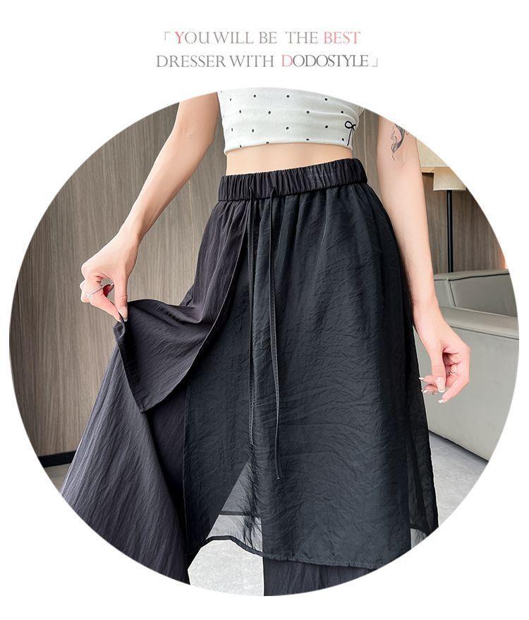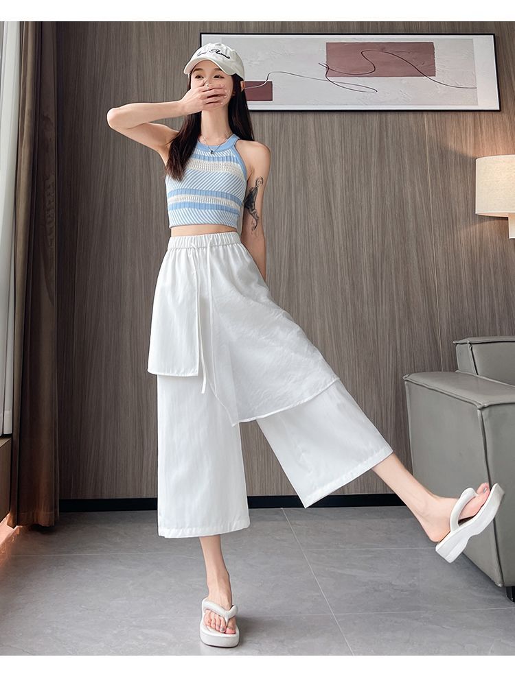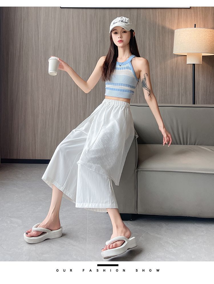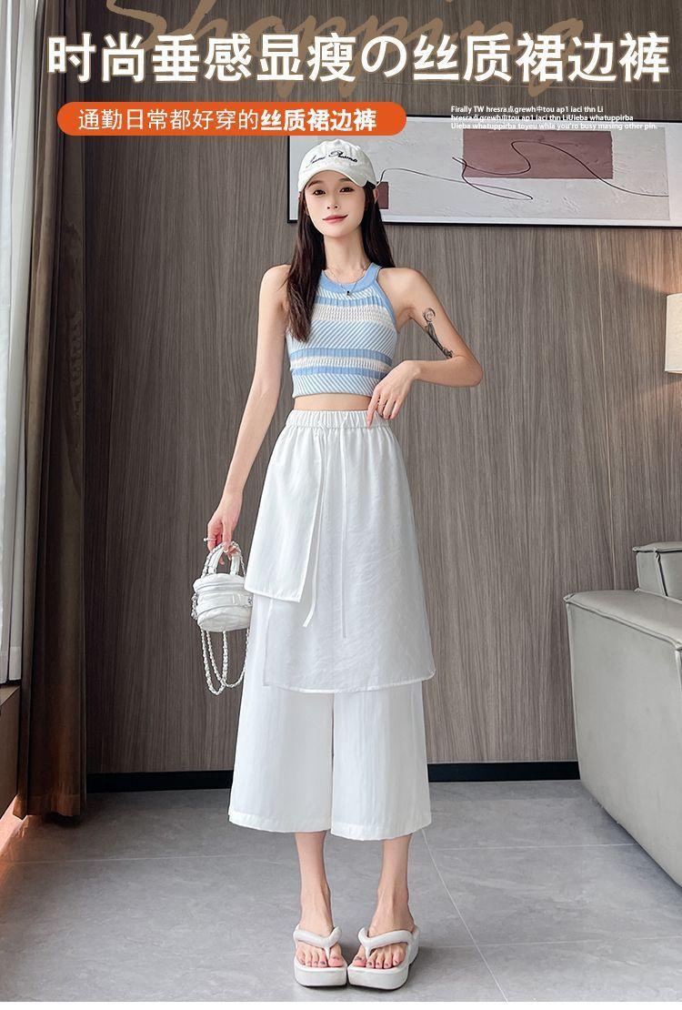 Pantalones Negros de Pierna Ancha Mujer Verano Delgados 2025 Nuevo Sentido del Diseño Costuras de Malla Solapa Trasera Casual Adelgazantes Pantalones Falda Nueve Puntos