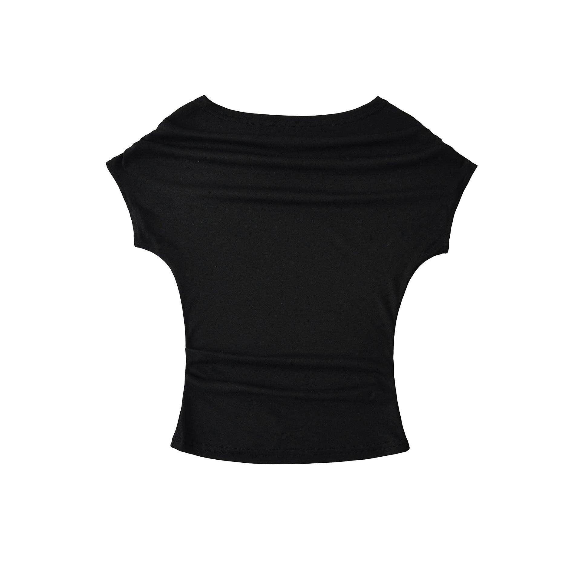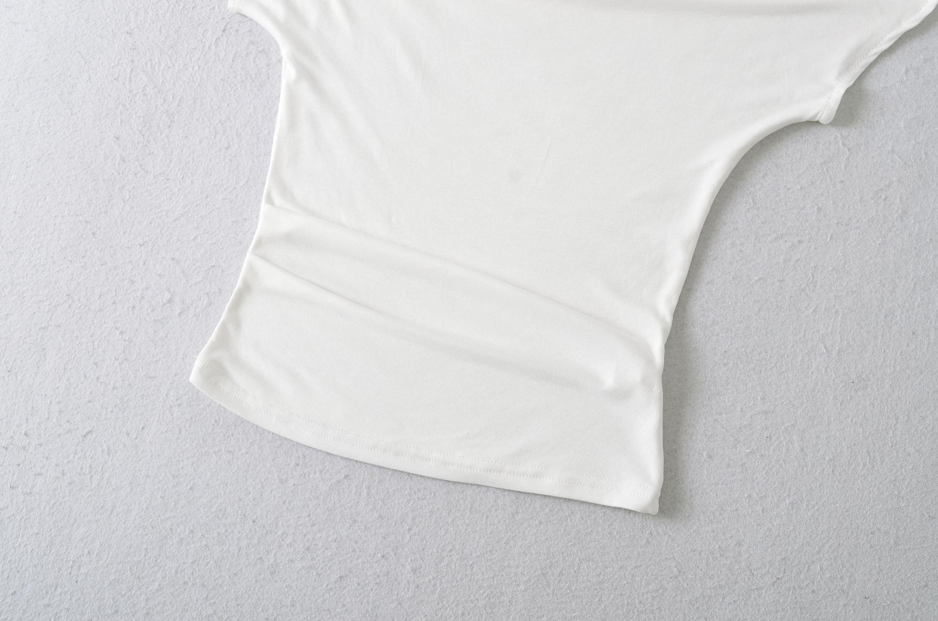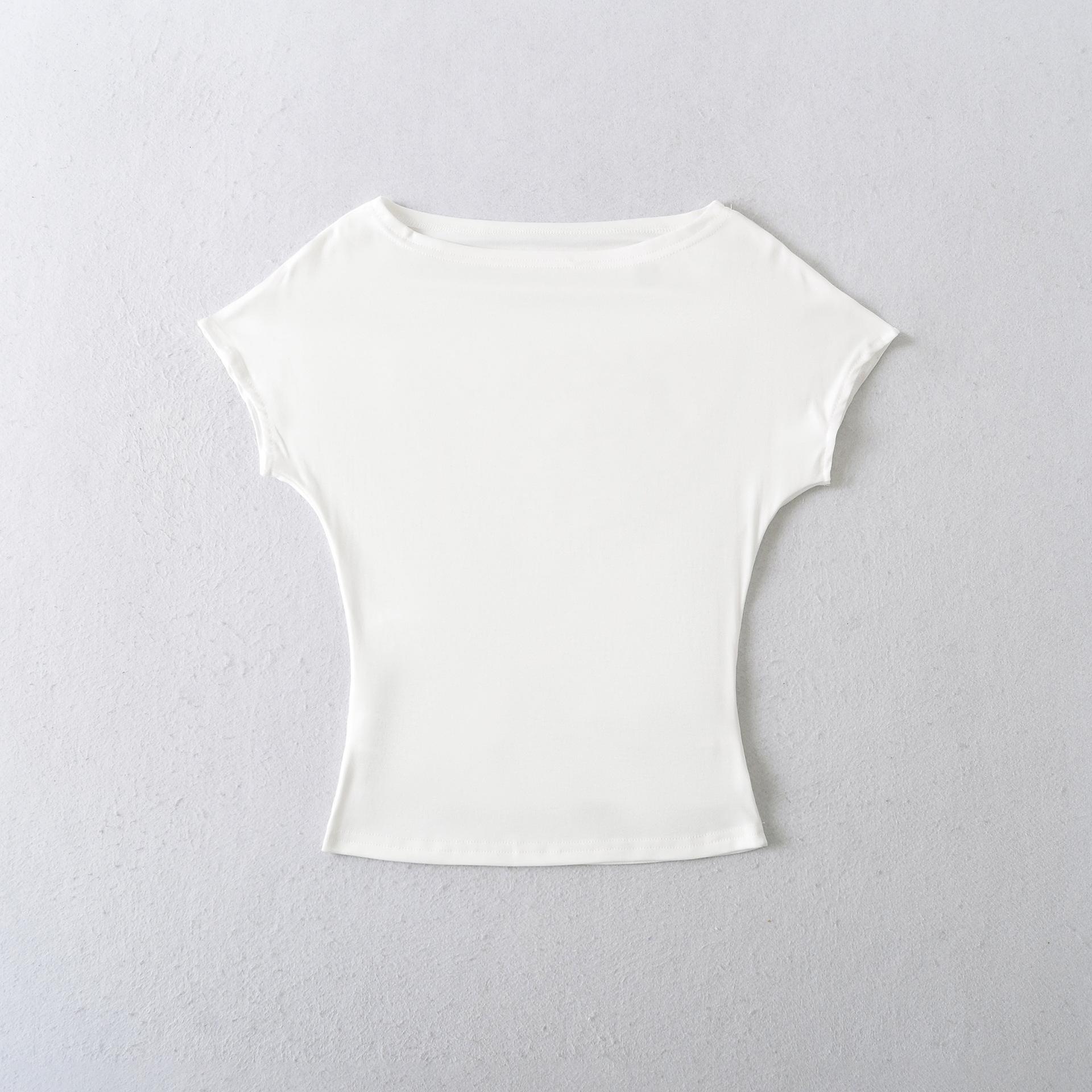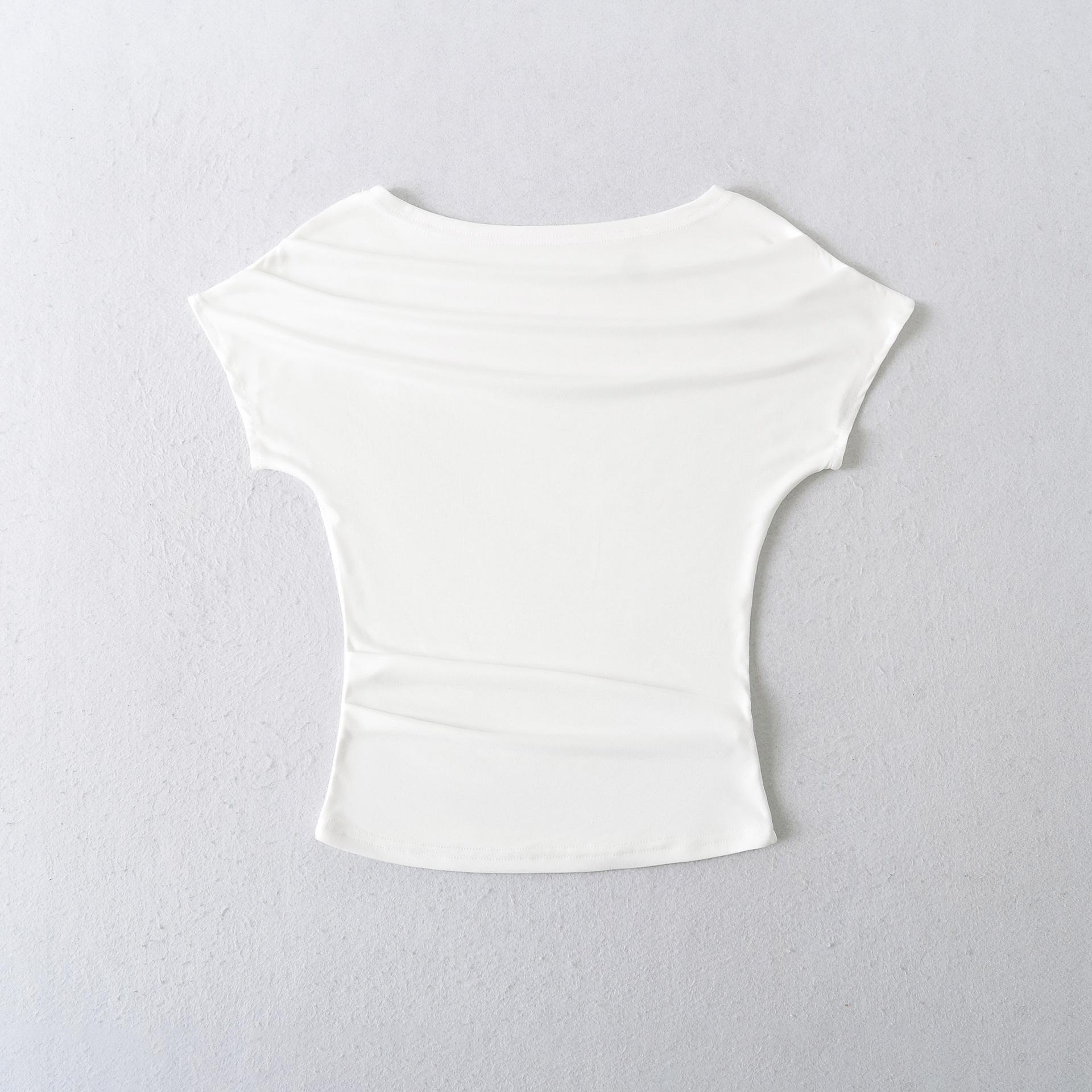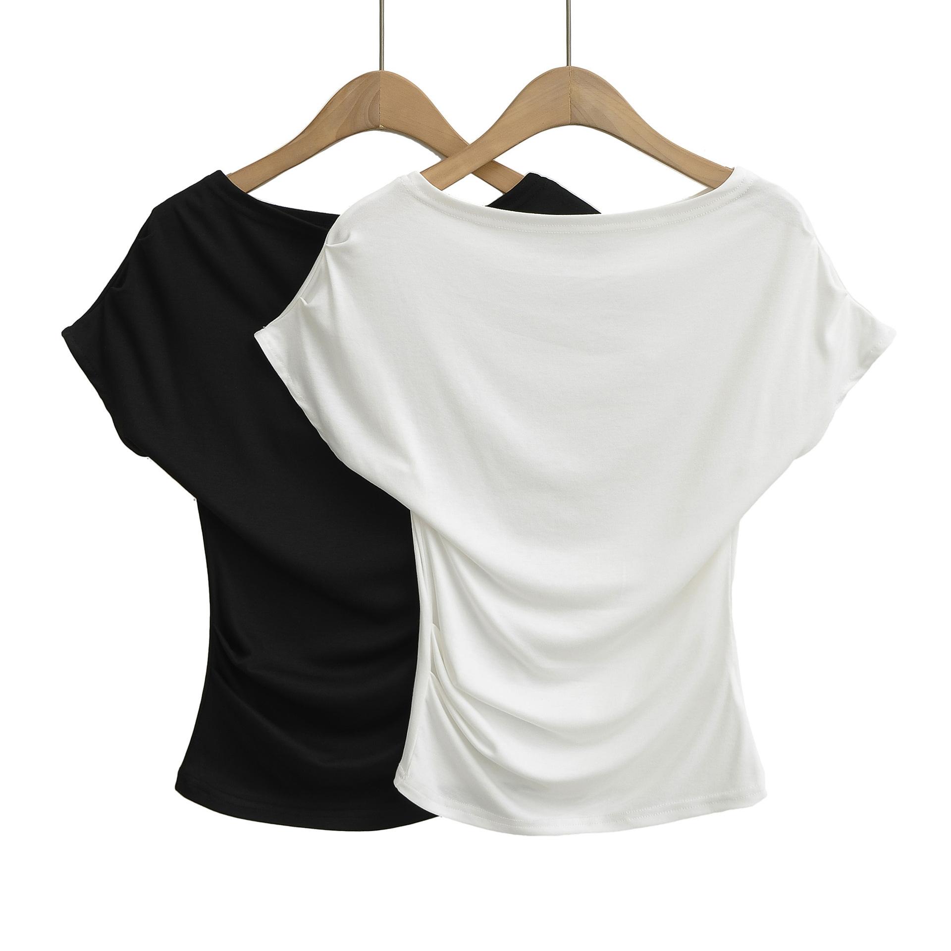 Playera de Estilo Holgazán con Hombro Caído y Cintura Ajustada de Manga Corta para Mujer 2025 Verano Nuevo Aspecto Adelgazante Cuello de una Línea Top Corto