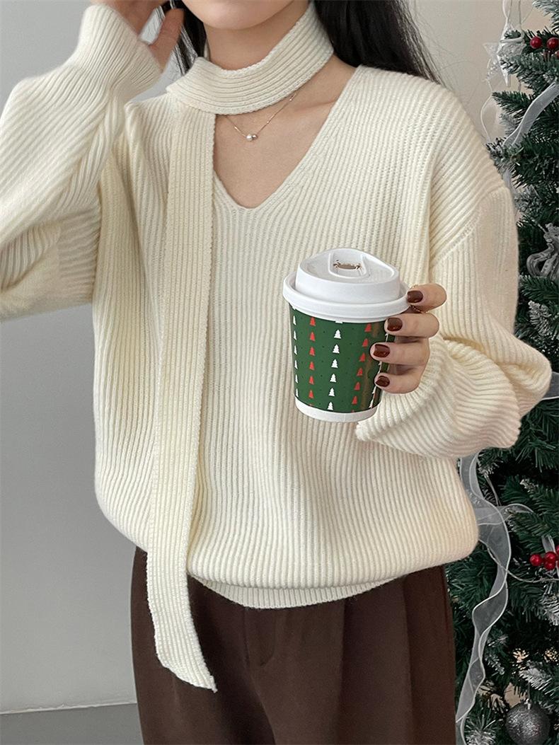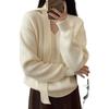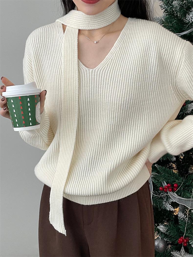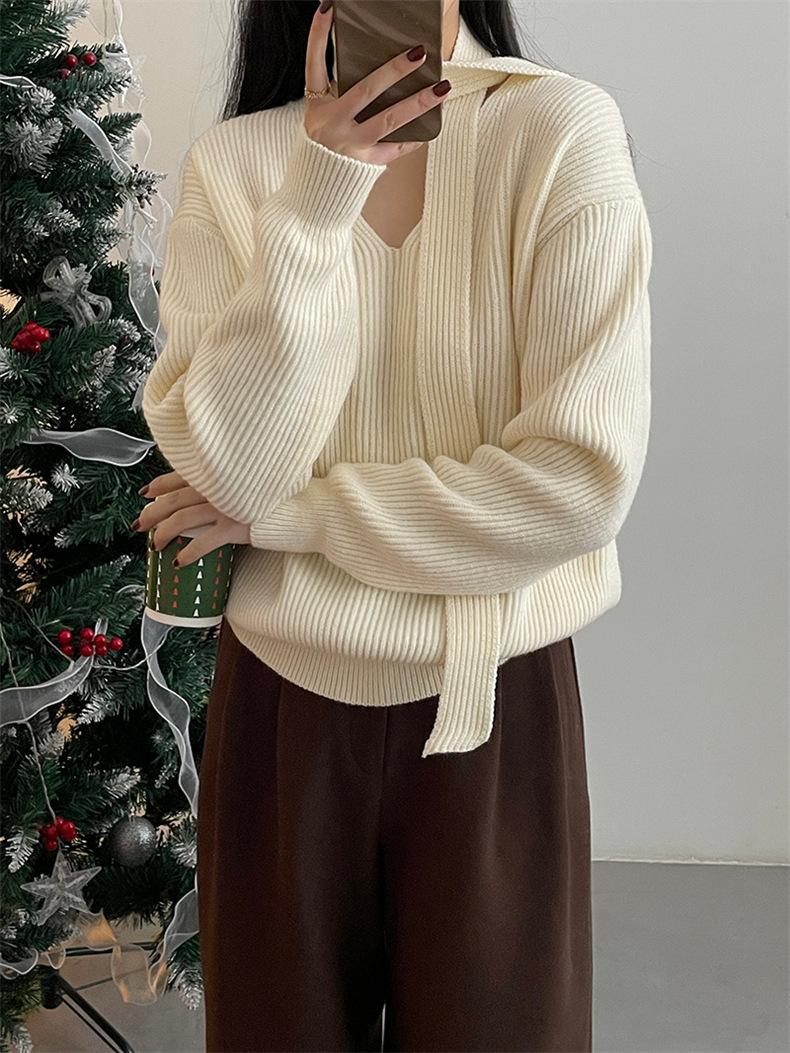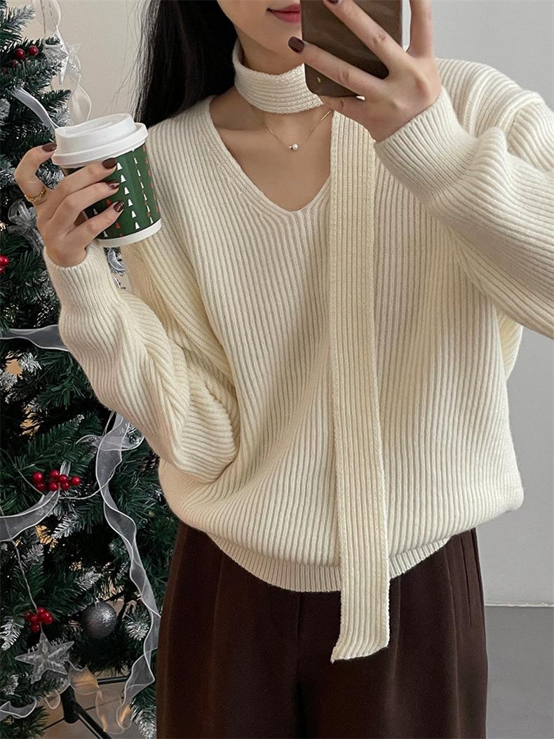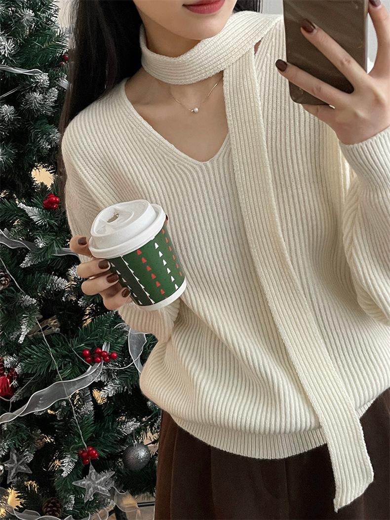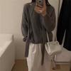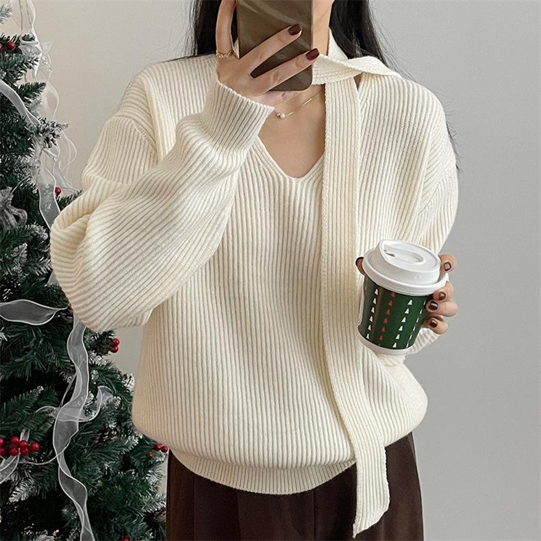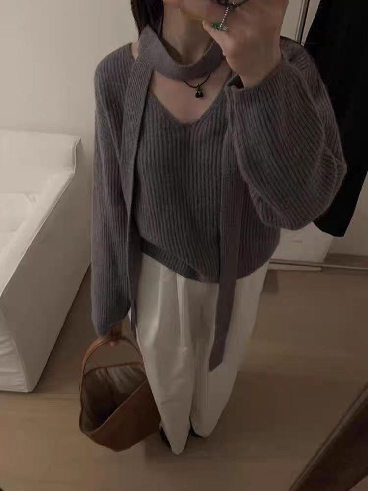 Suéter Abrigo de Punto para Mujer de Manga Larga Estilo Coreano Ins Otoño e Invierno Color Sólido Simple Temperamento Suave Cuello en V Bufanda