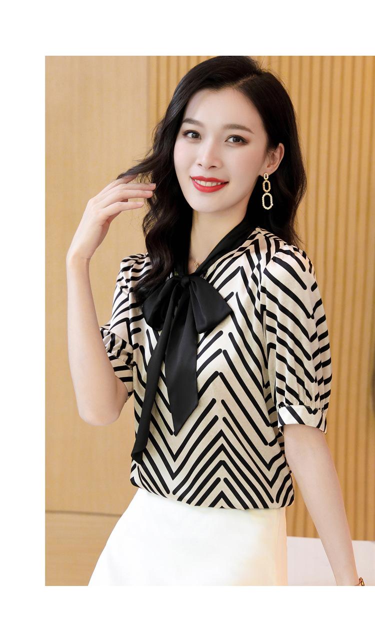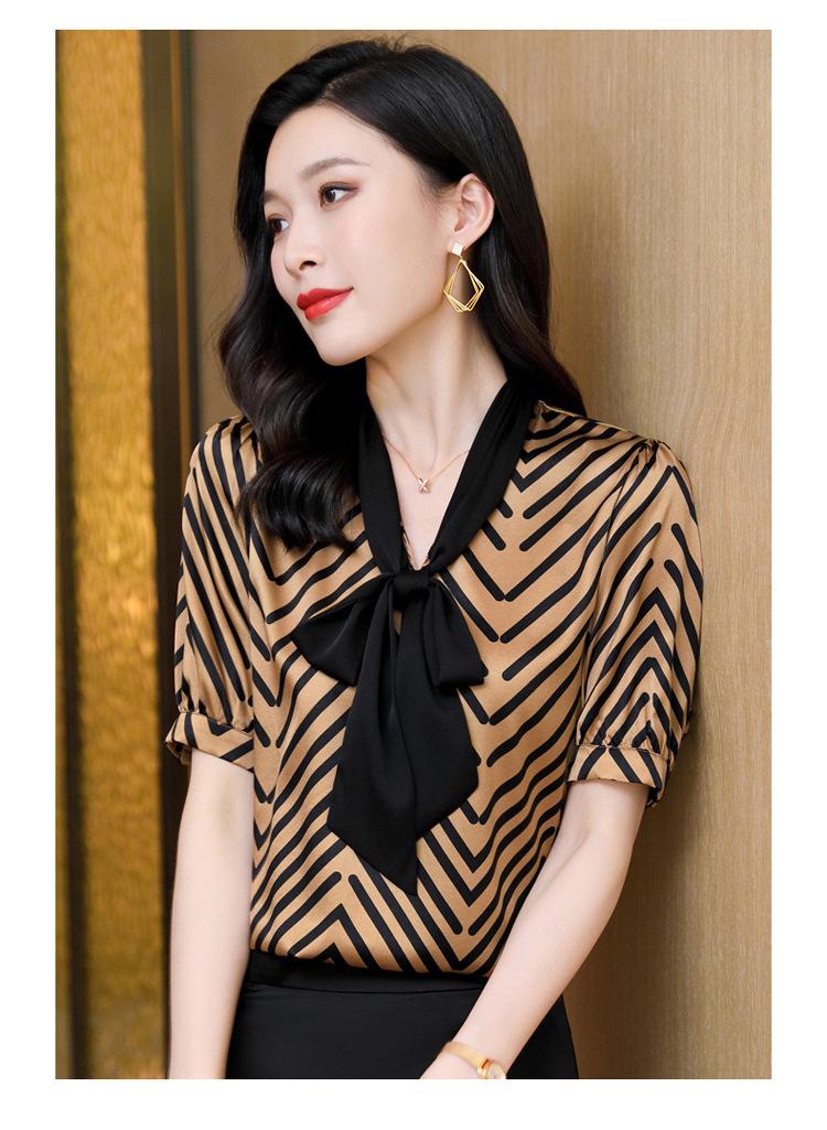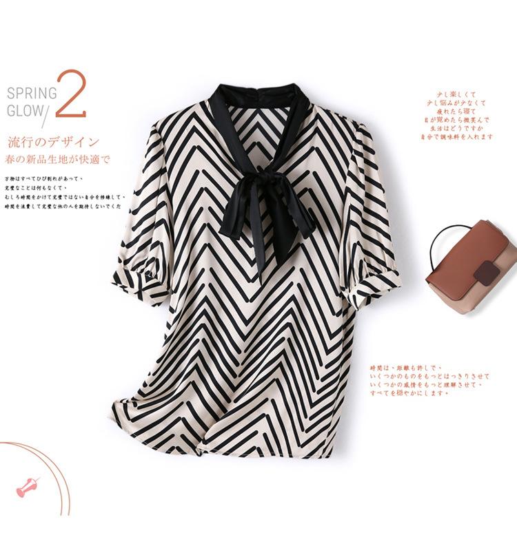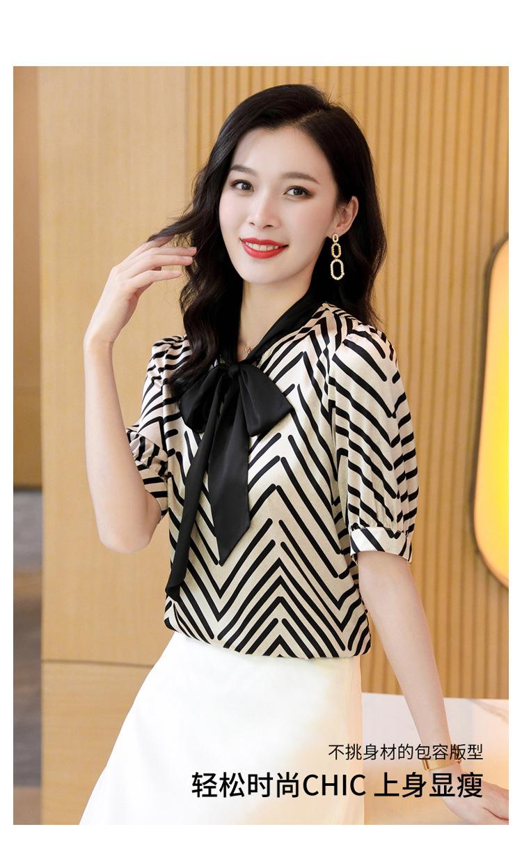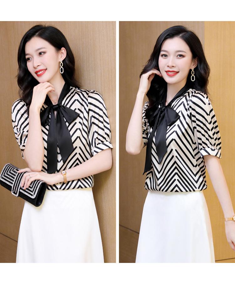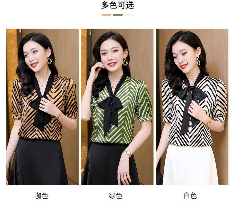 Camisa de Seda de Manga Corta con Lazo de Nuevo Estilo para Primavera y Verano, Elegante Camisa Rayada para Mujer, Top Sencillo y Elegante