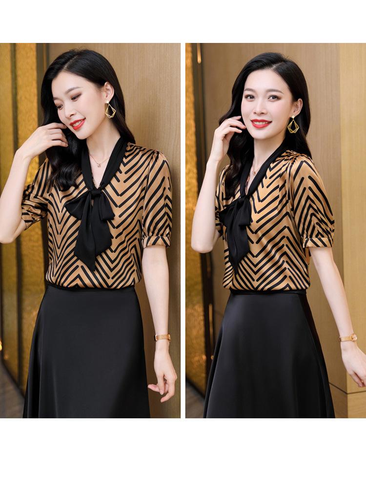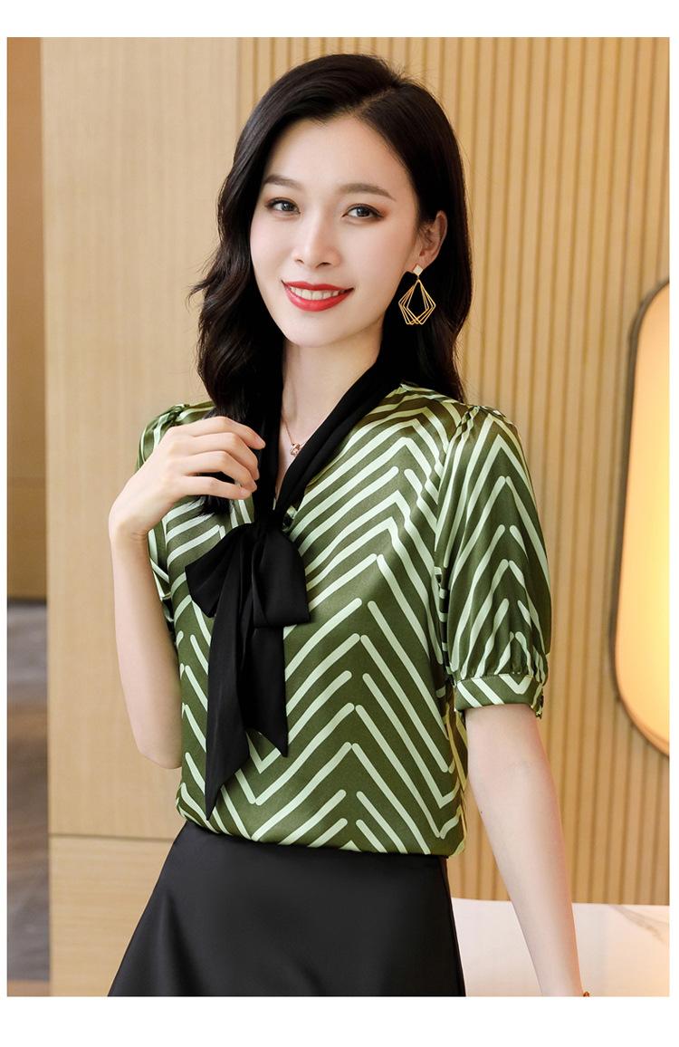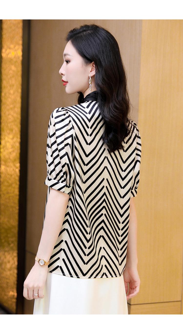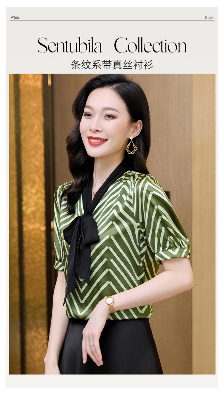 Camisa de Seda de Manga Corta con Lazo de Nuevo Estilo para Primavera y Verano, Elegante Camisa Rayada para Mujer, Top Sencillo y Elegante