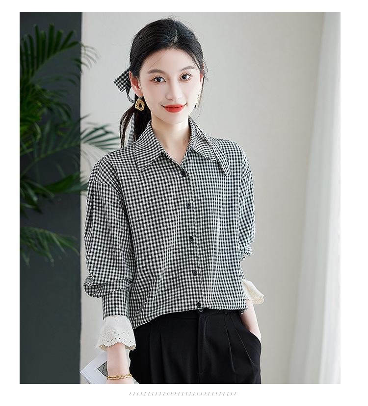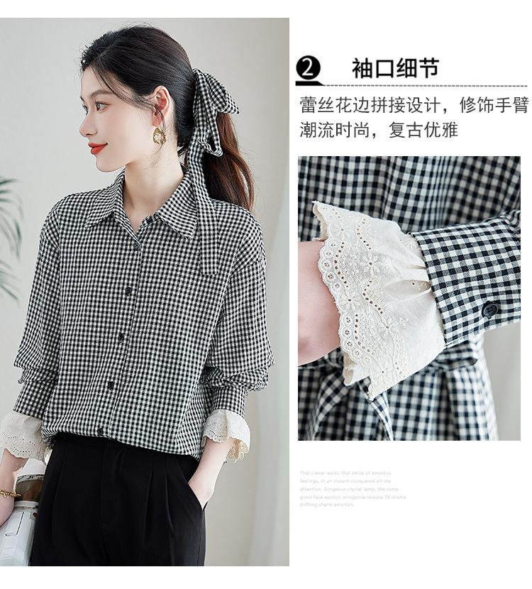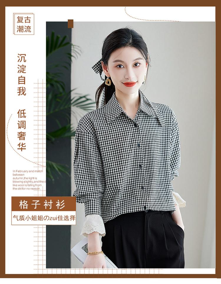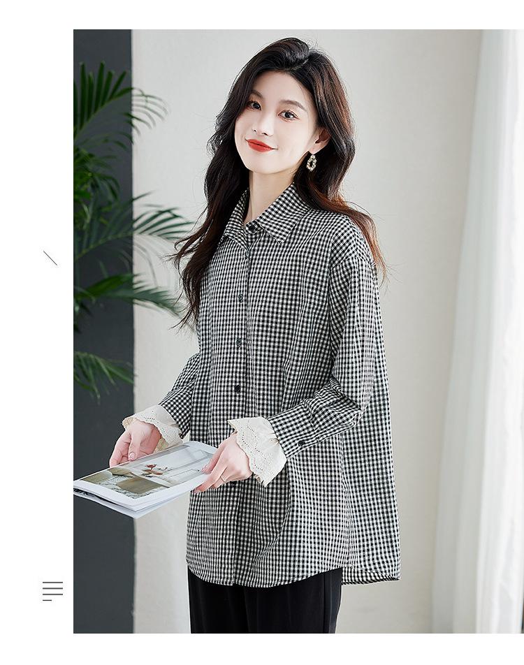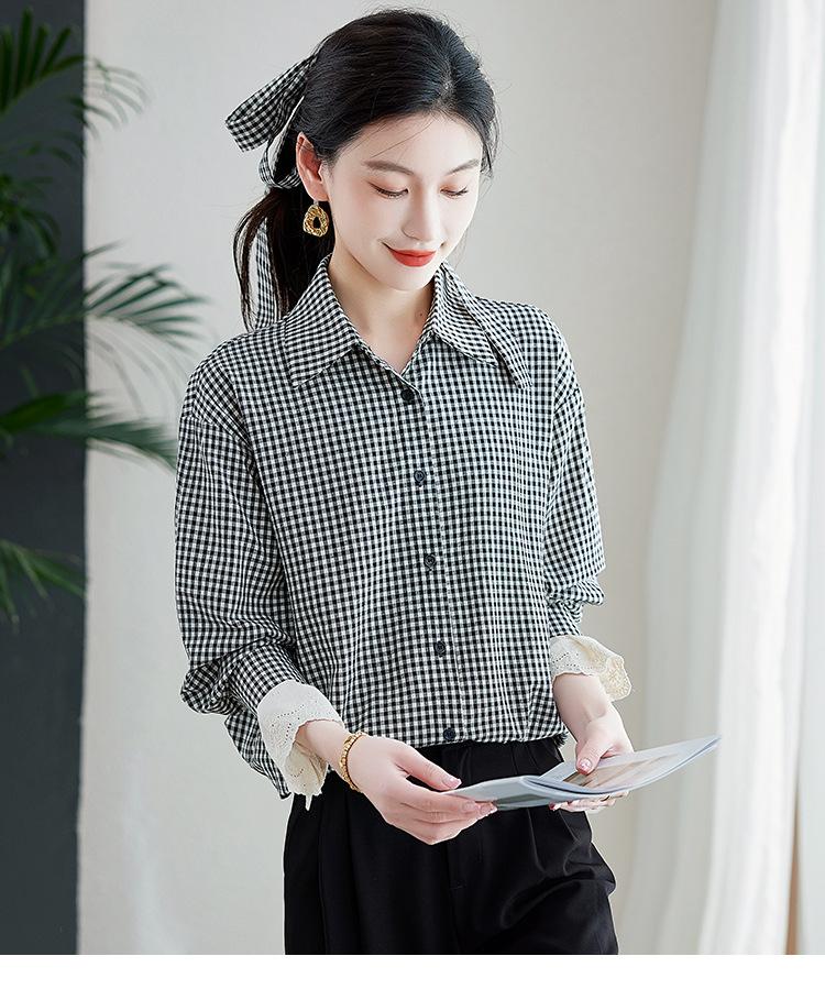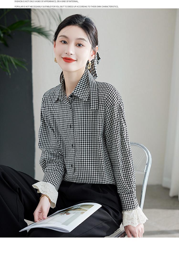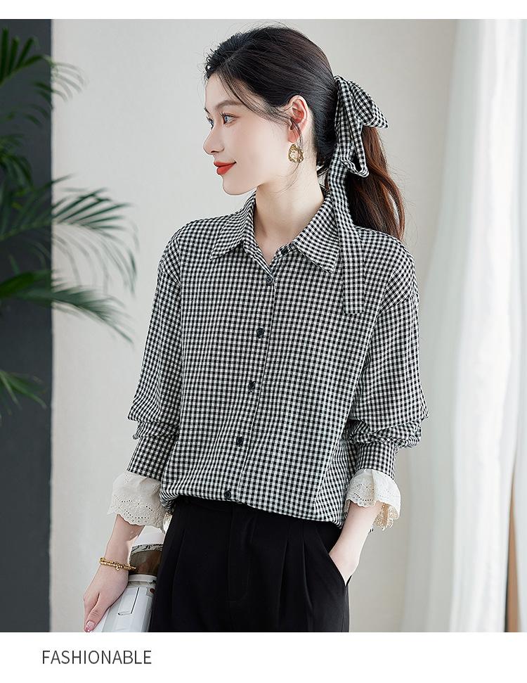 Puño Encaje Costuras Cuadros Elegante Camisa Personalizada para Mujer Primavera y Otoño Nuevo Diseño Holgado Nicho Camisa de Manga Larga