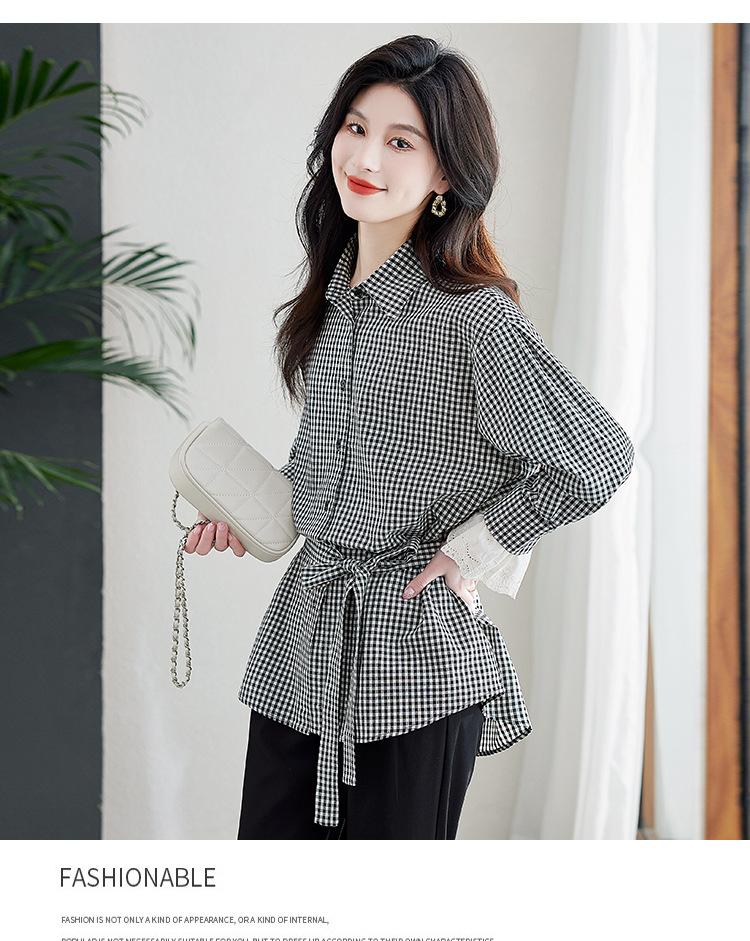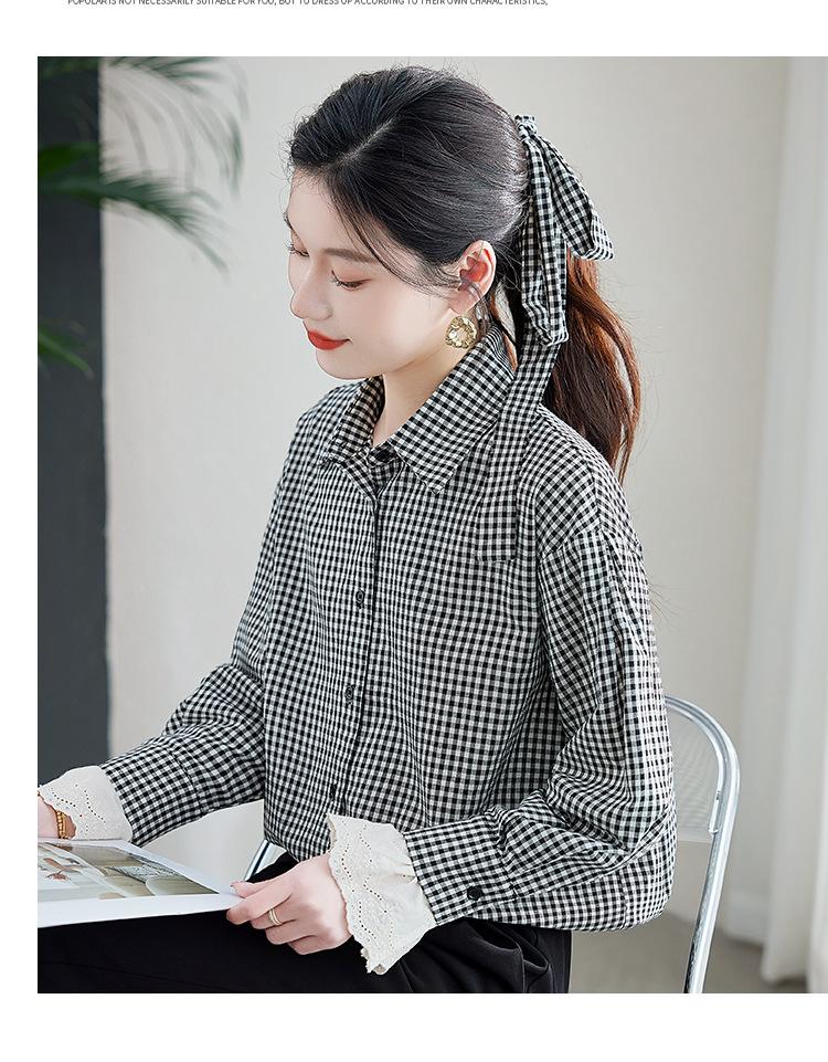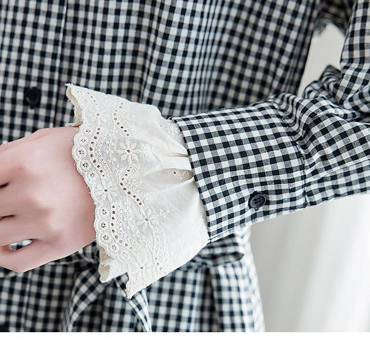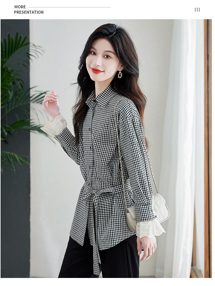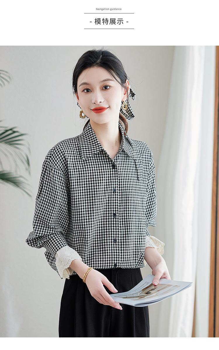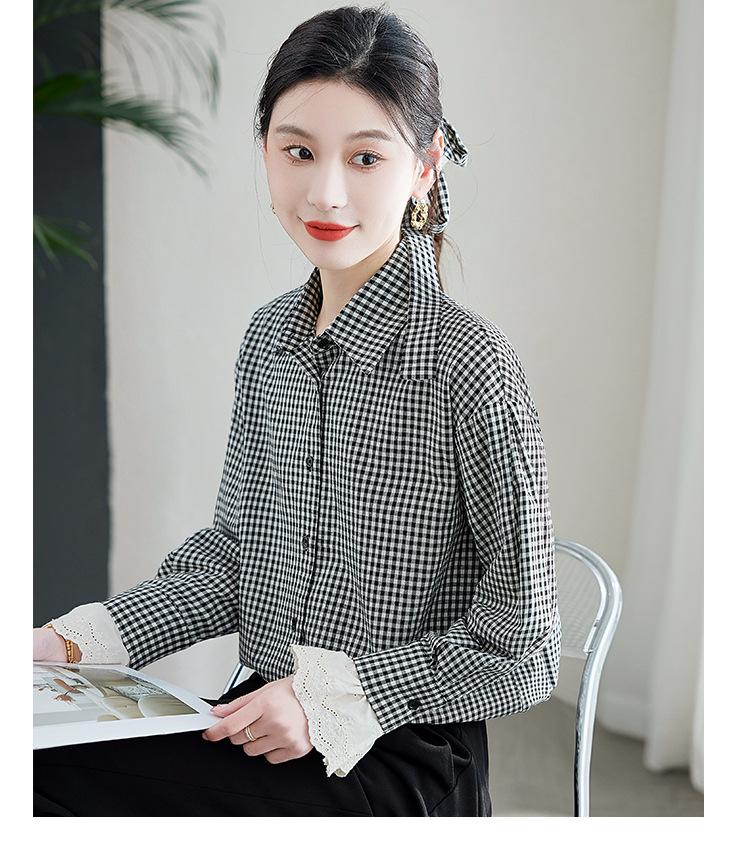 Puño Encaje Costuras Cuadros Elegante Camisa Personalizada para Mujer Primavera y Otoño Nuevo Diseño Holgado Nicho Camisa de Manga Larga