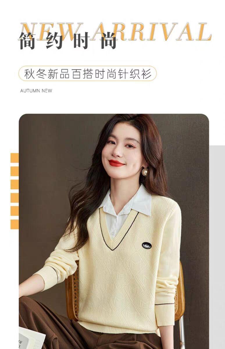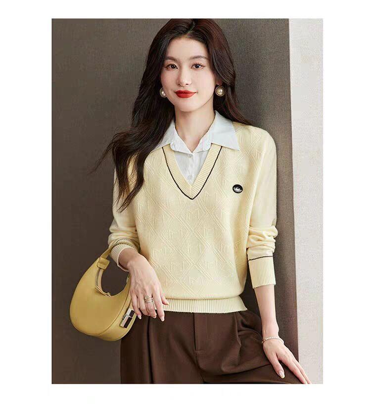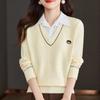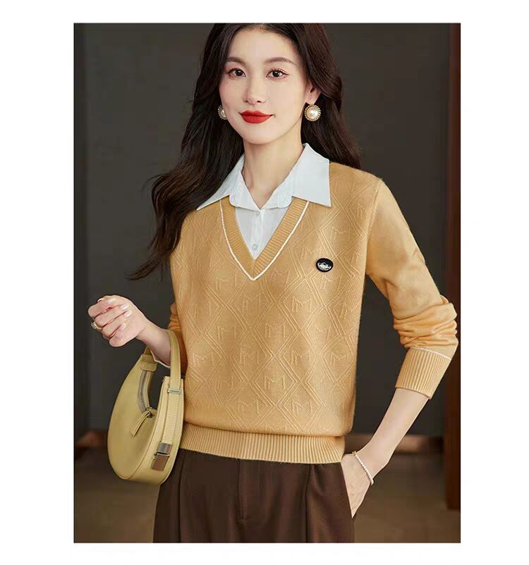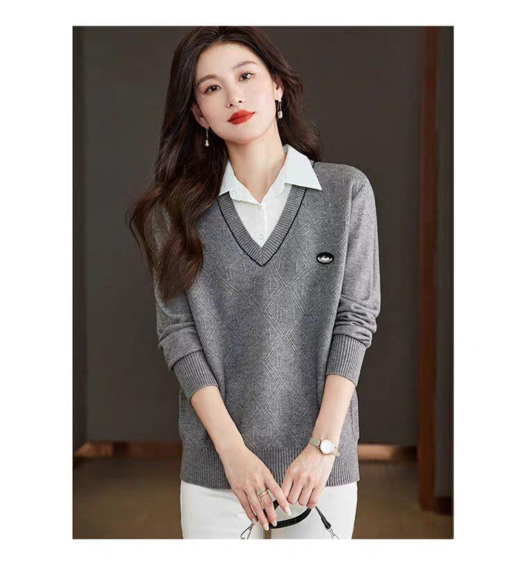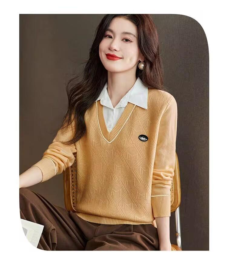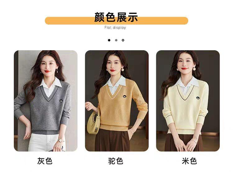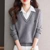 Top de Suéter Falso de Dos Piezas para Mujer Moda de Primavera y Otoño Camiseta Base Elegante Suéter con Cuello Camisa Casual