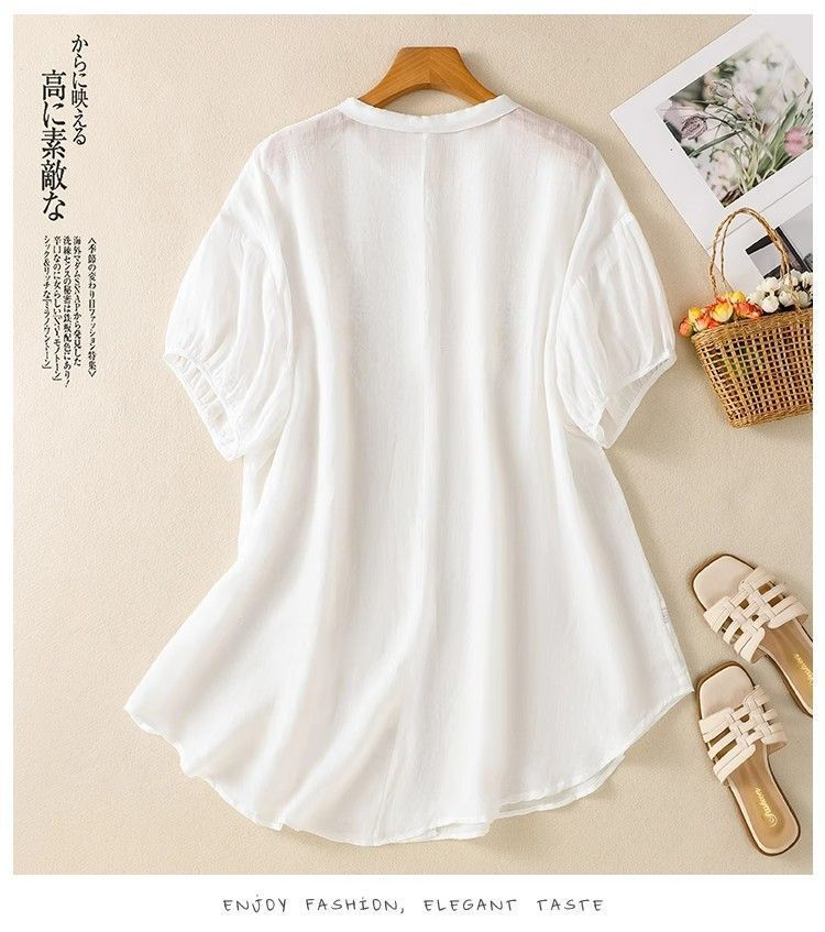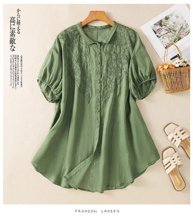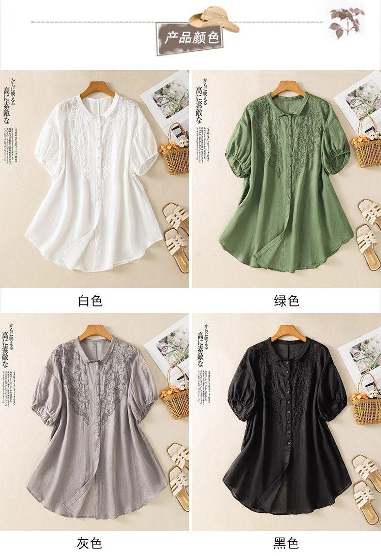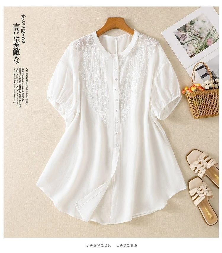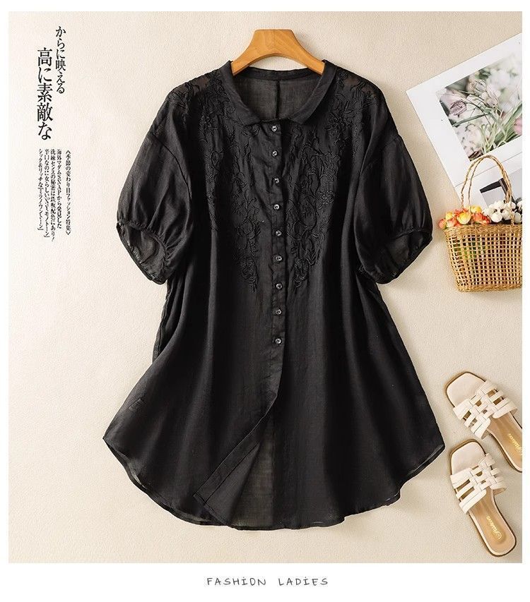 Verano 2025 Nuevo Versátil Holgado Camisa de Manga Corta de Lino Algodón para Mujer Largo Medio Bordado Retro Literario Color Sólido Top