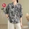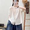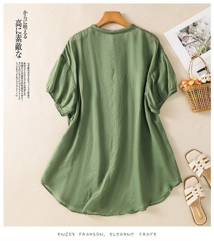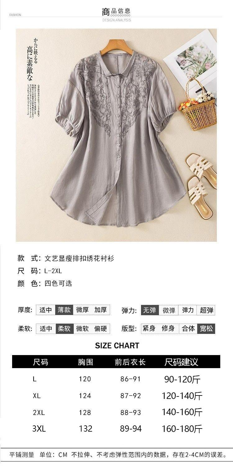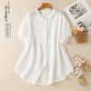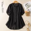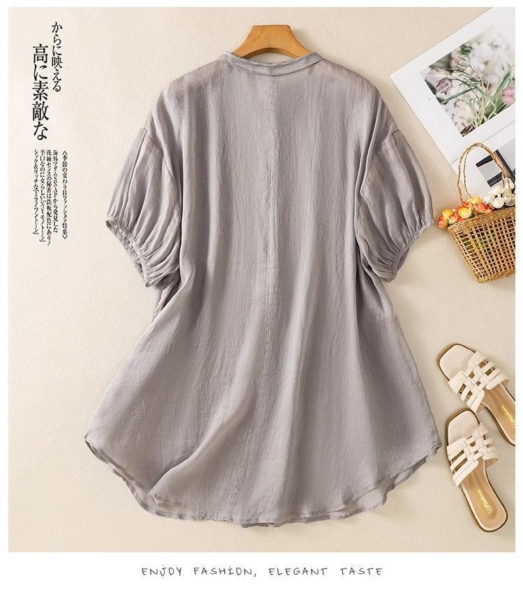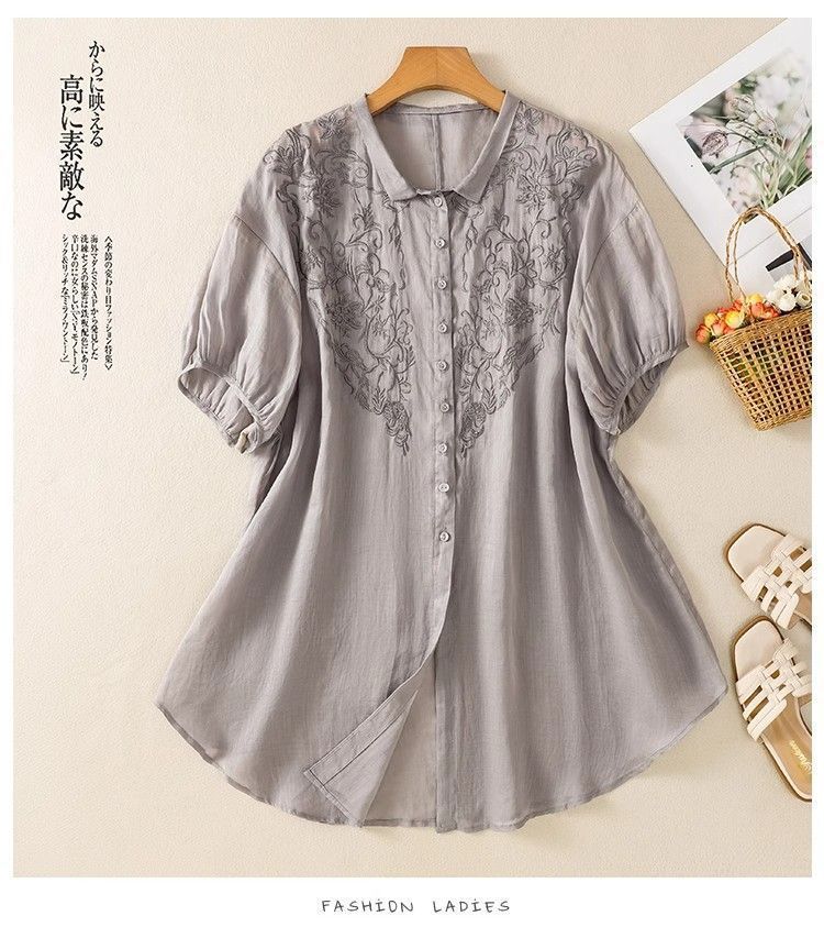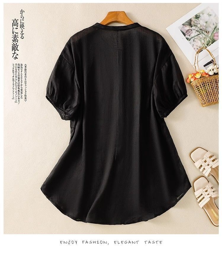 Verano 2025 Nuevo Versátil Holgado Camisa de Manga Corta de Lino Algodón para Mujer Largo Medio Bordado Retro Literario Color Sólido Top