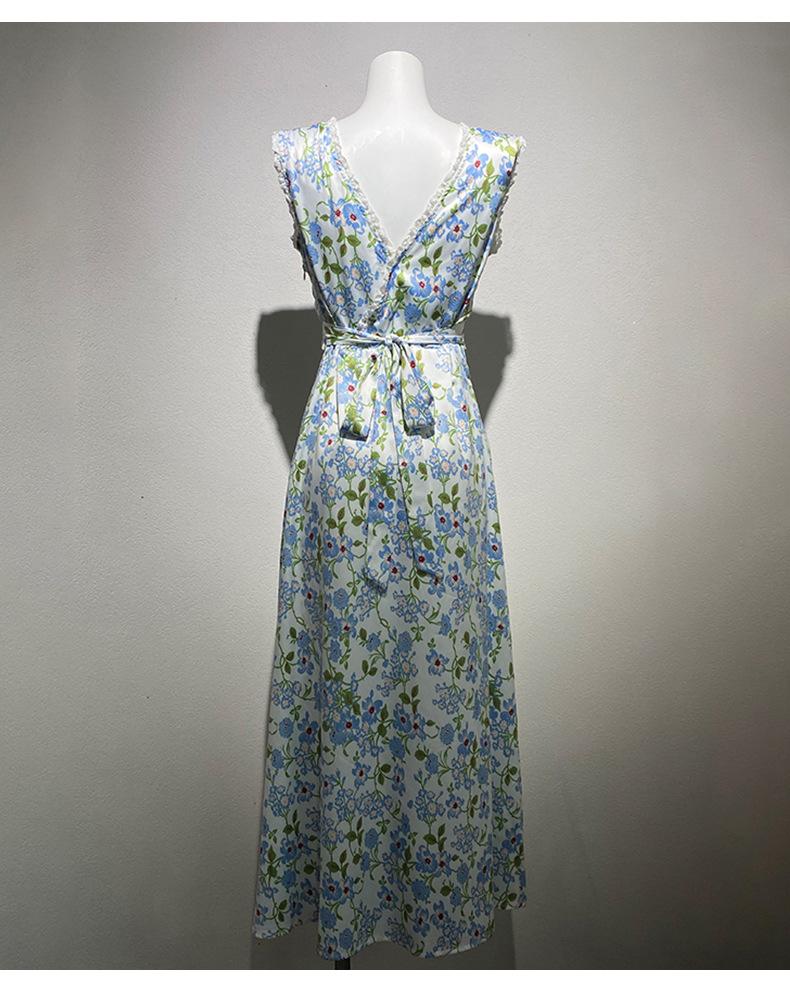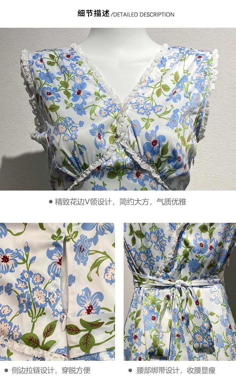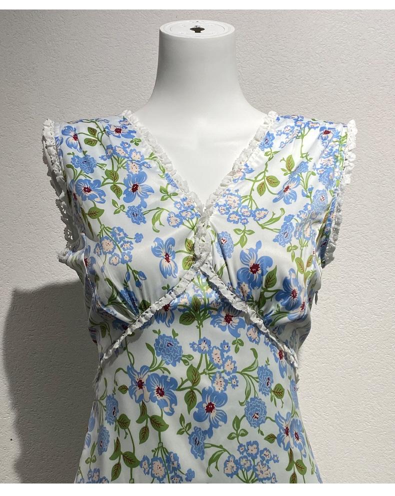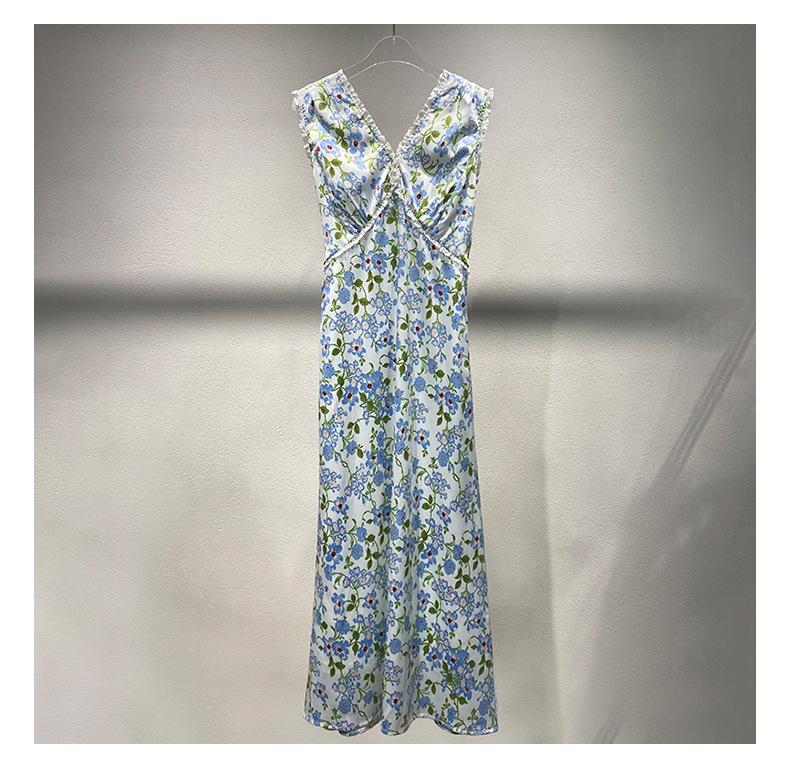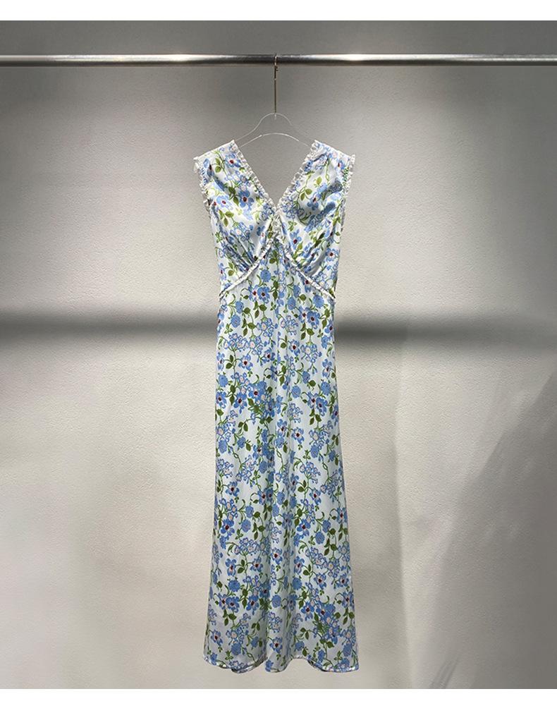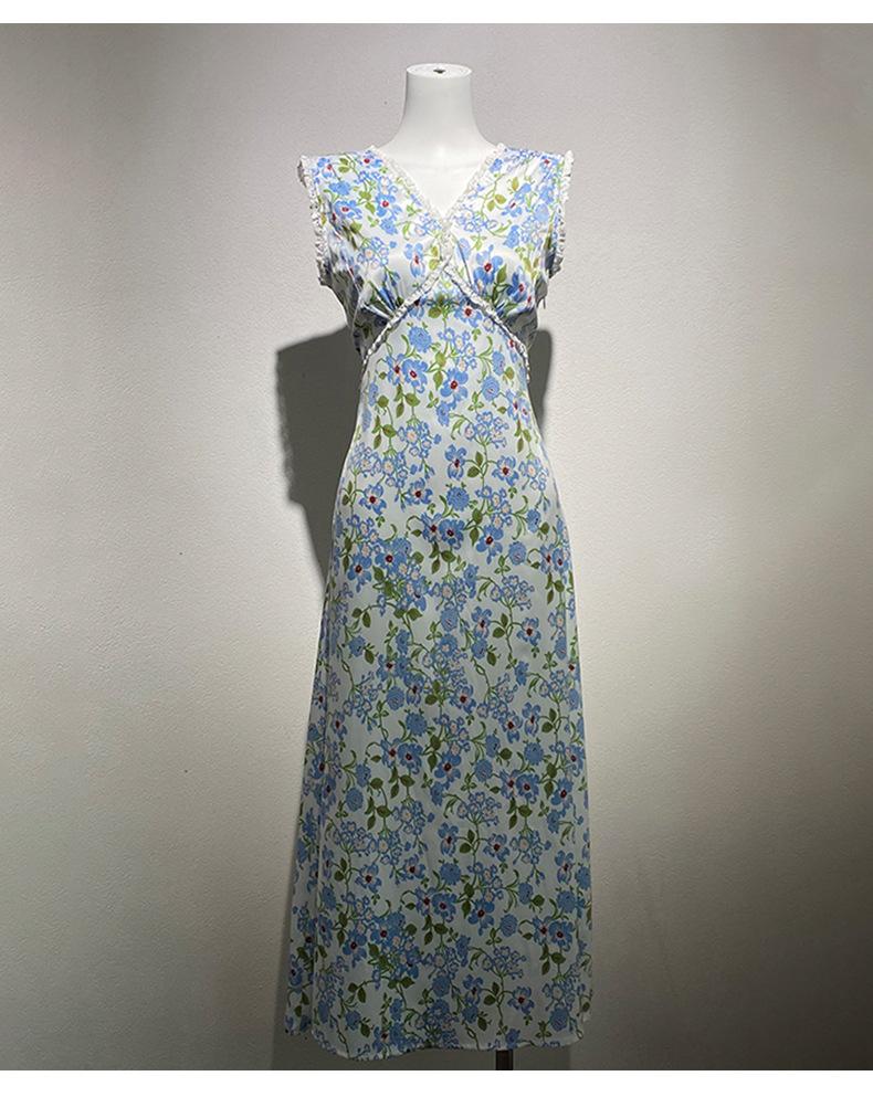 Ahora 2025 Nuevo Estilo Verano Francés Dulce Vestido sin Mangas con Cuello en V y Falda Larga Floral Adelgazante de Cintura para Mujer
