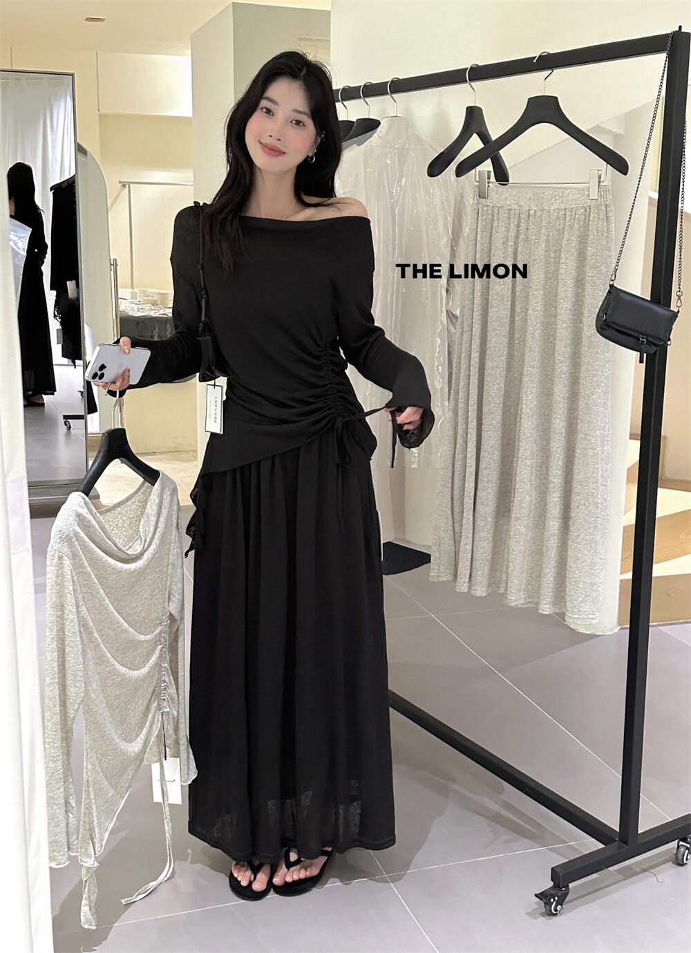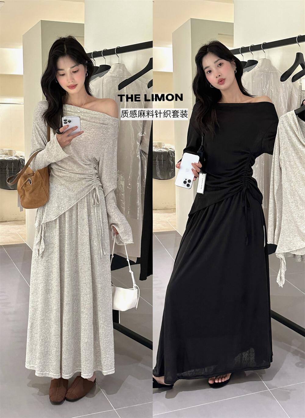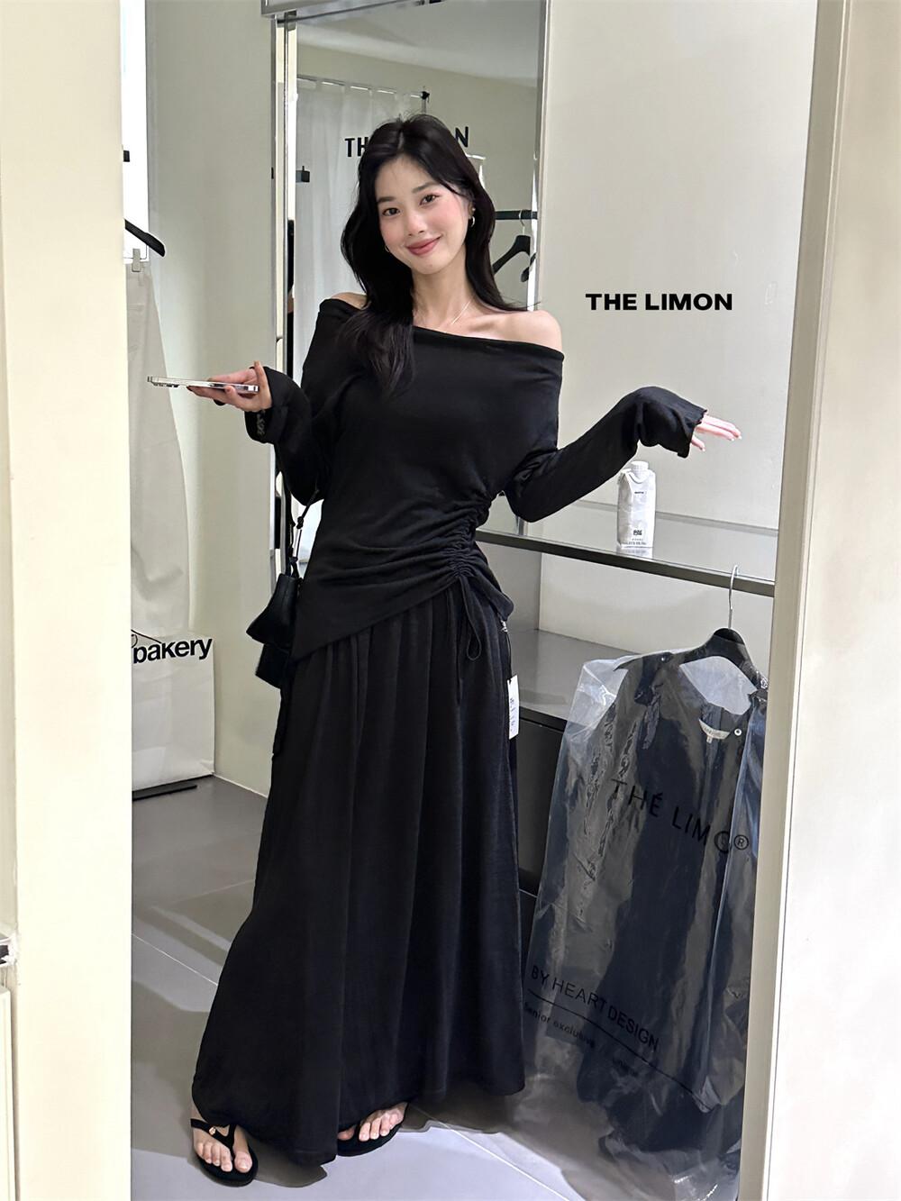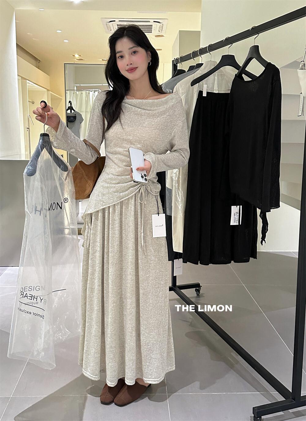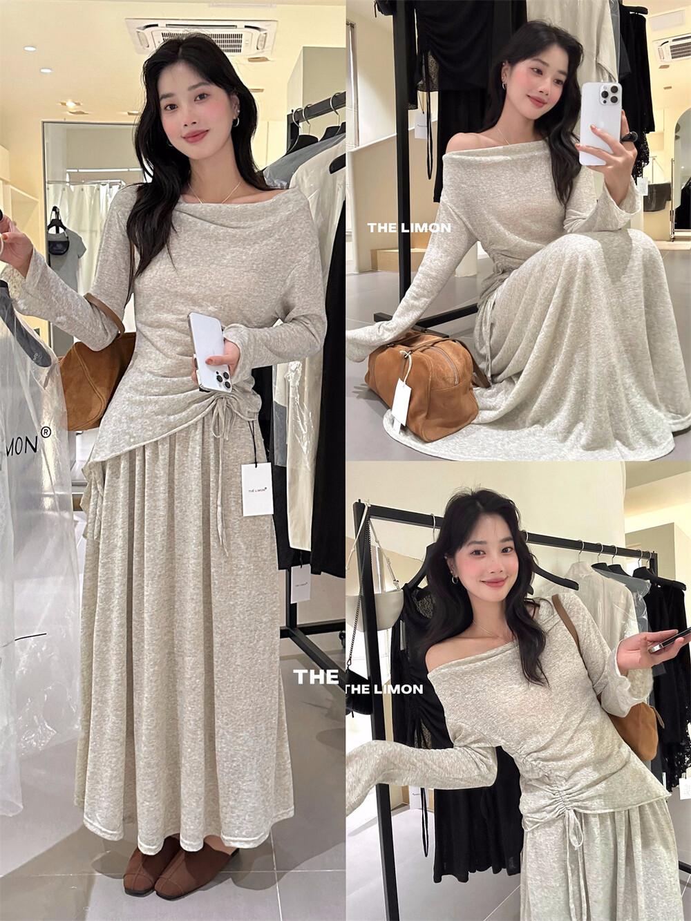 THE LIMON Camiseta de Manga Larga con Hombro Descubierto con Diseño de Otoño de Té Verde Limón + Falda Midi Larga Conjunto de Dos Piezas
