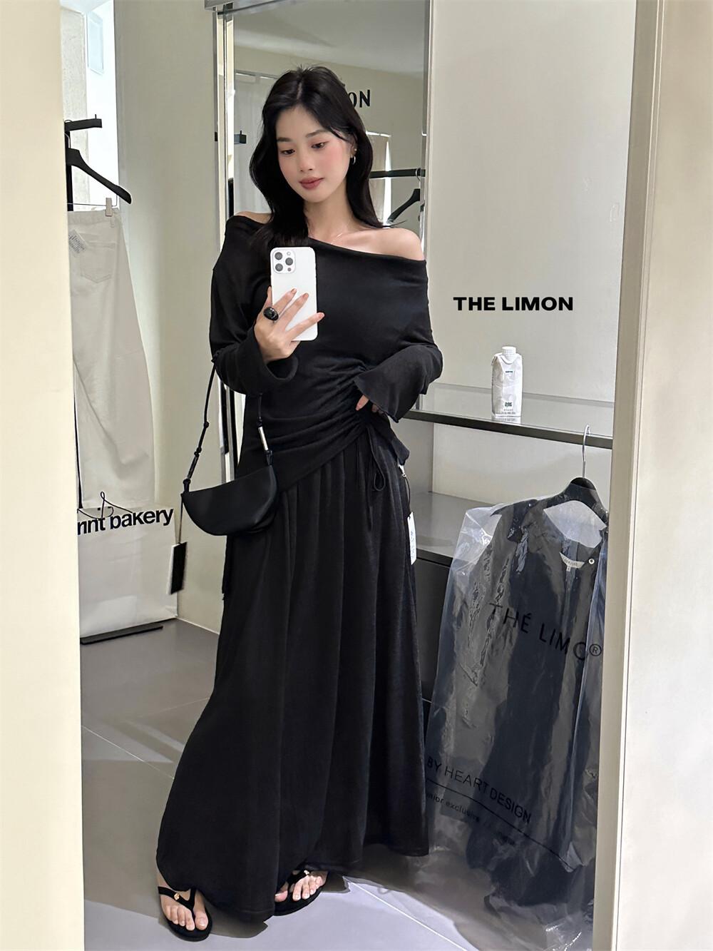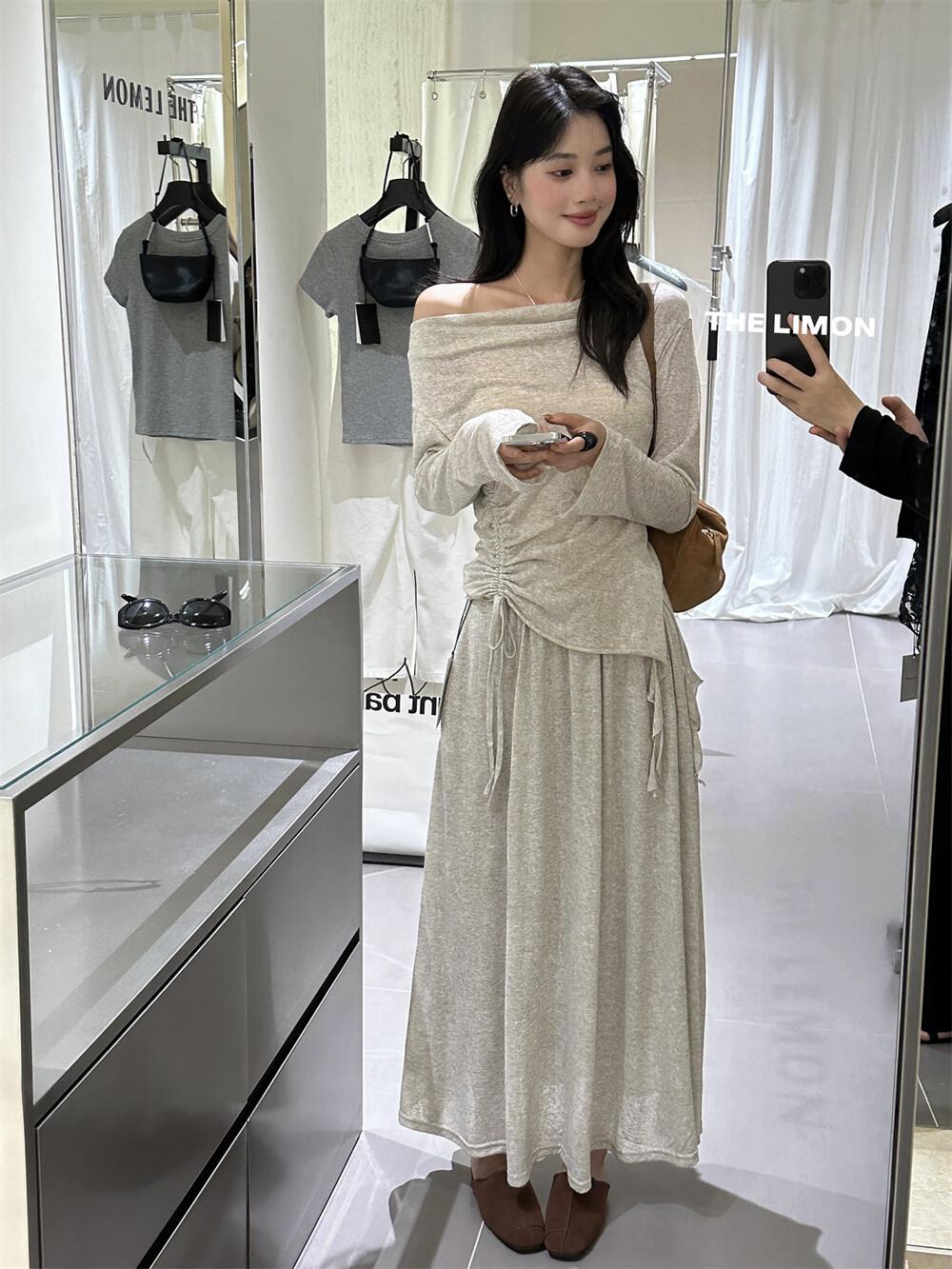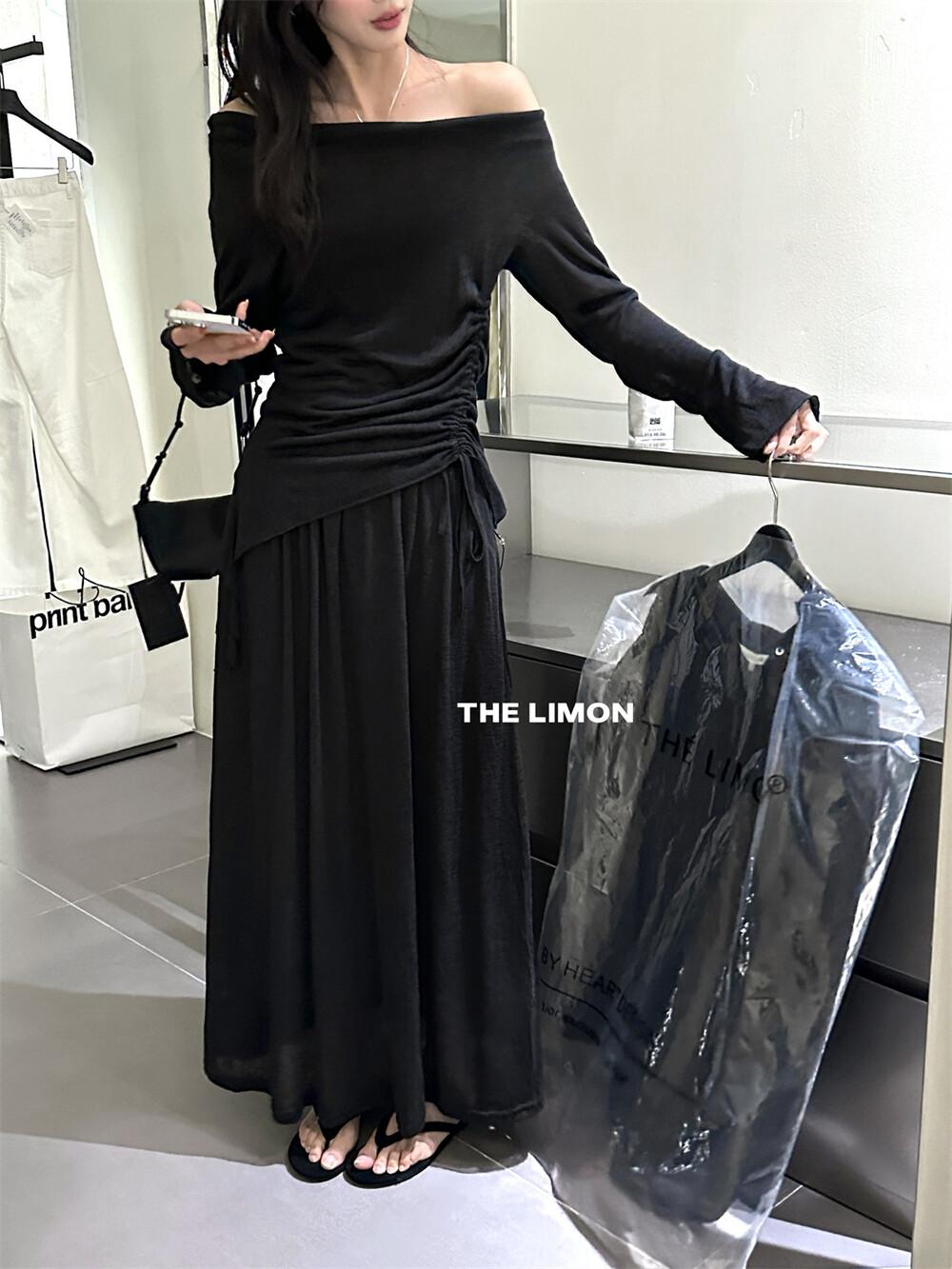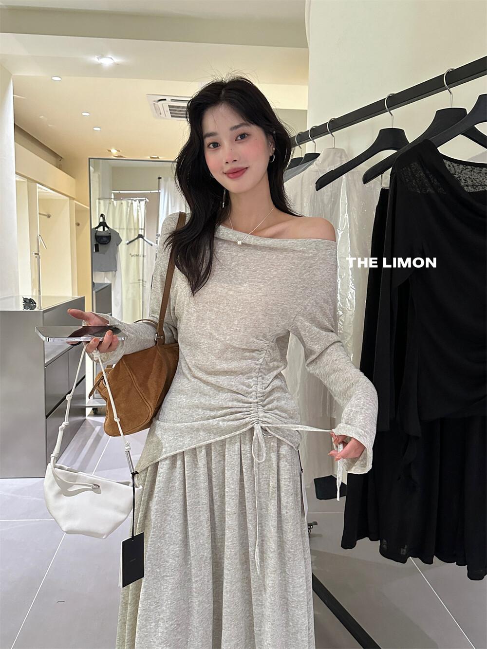 THE LIMON Camiseta de Manga Larga con Hombro Descubierto con Diseño de Otoño de Té Verde Limón + Falda Midi Larga Conjunto de Dos Piezas