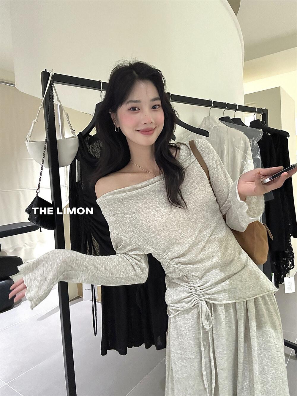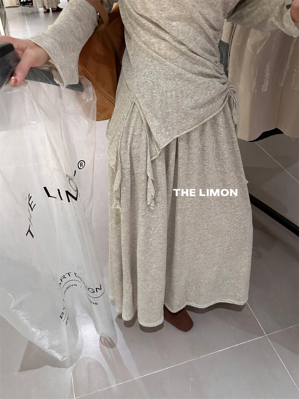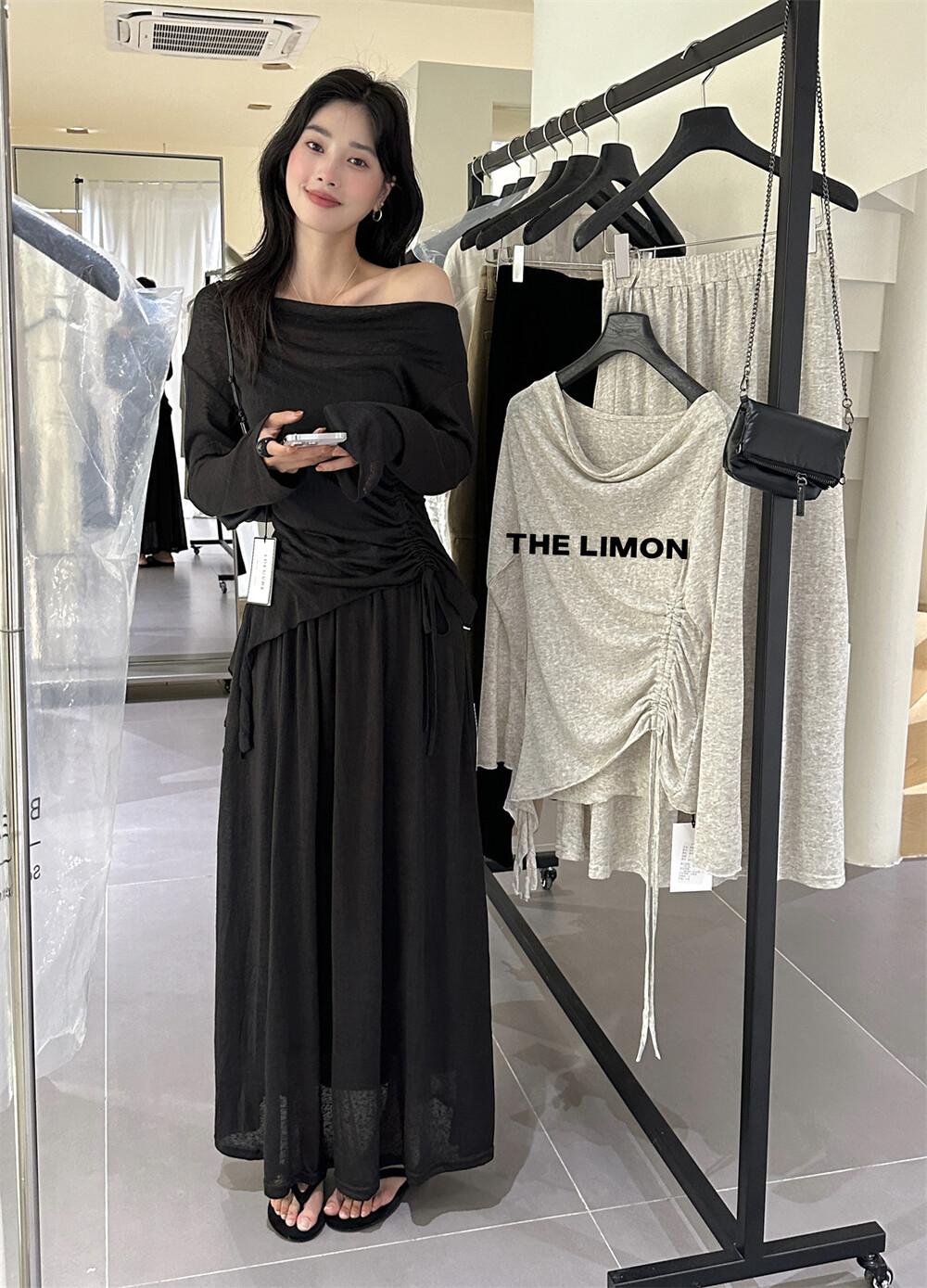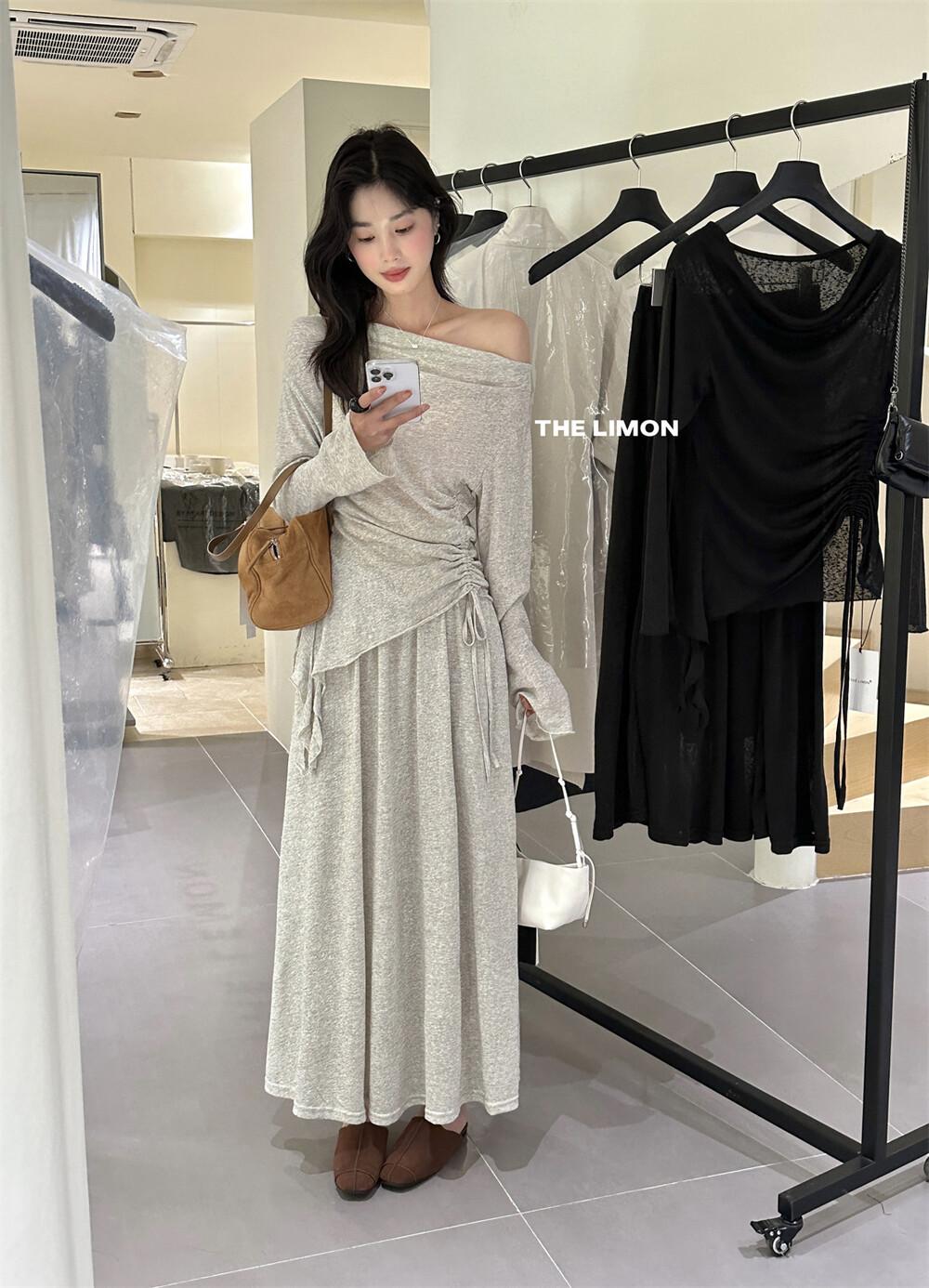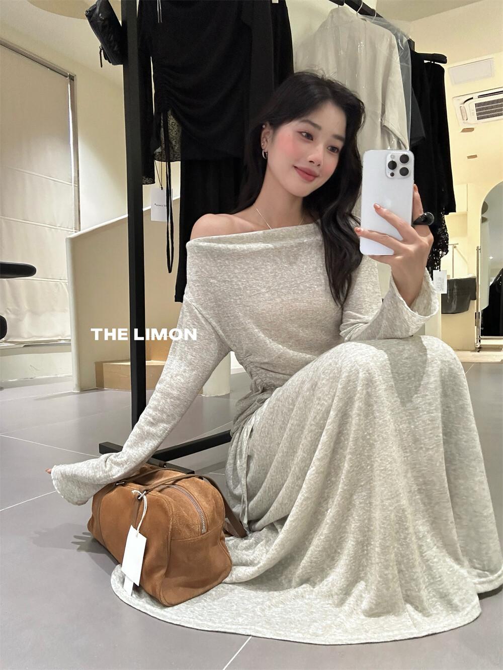 THE LIMON Camiseta de Manga Larga con Hombro Descubierto con Diseño de Otoño de Té Verde Limón + Falda Midi Larga Conjunto de Dos Piezas