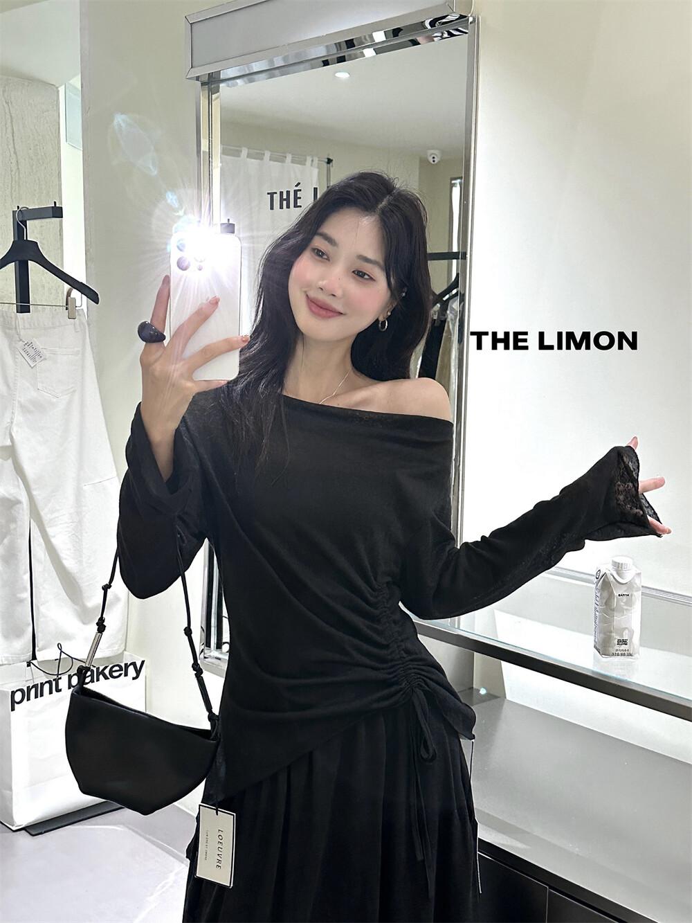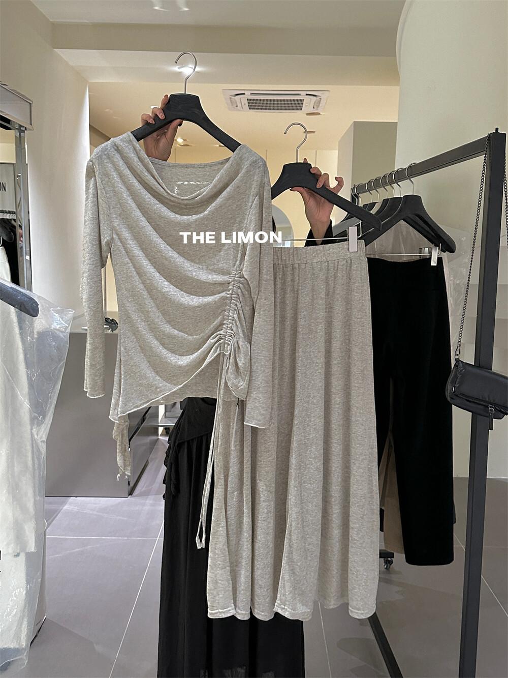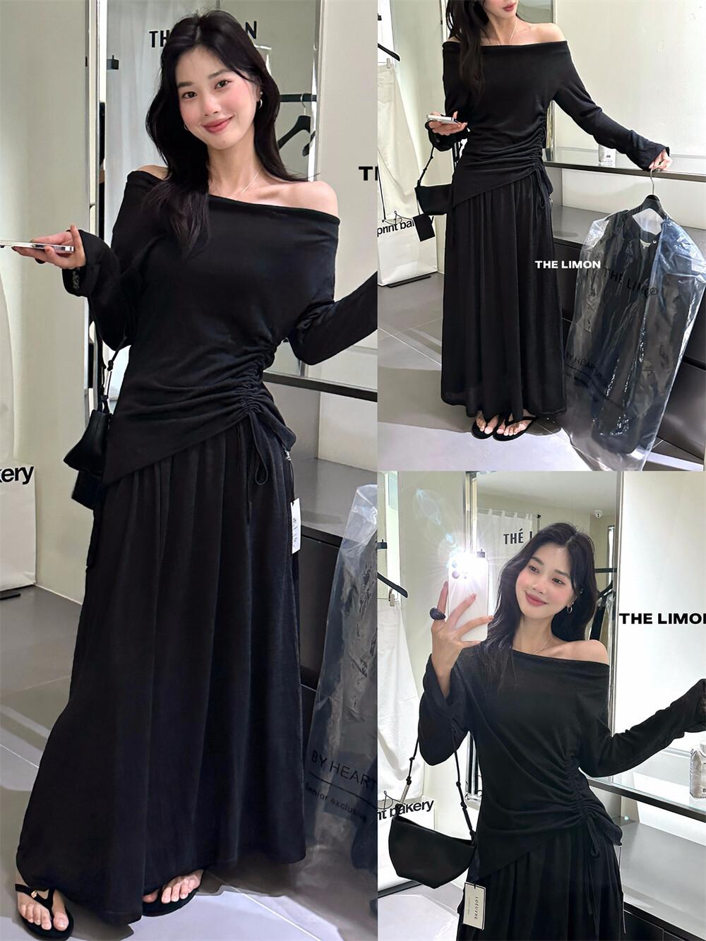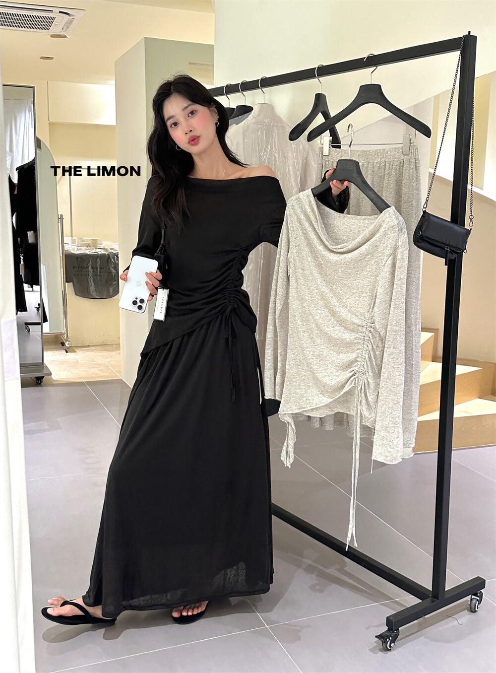 THE LIMON Camiseta de Manga Larga con Hombro Descubierto con Diseño de Otoño de Té Verde Limón + Falda Midi Larga Conjunto de Dos Piezas
