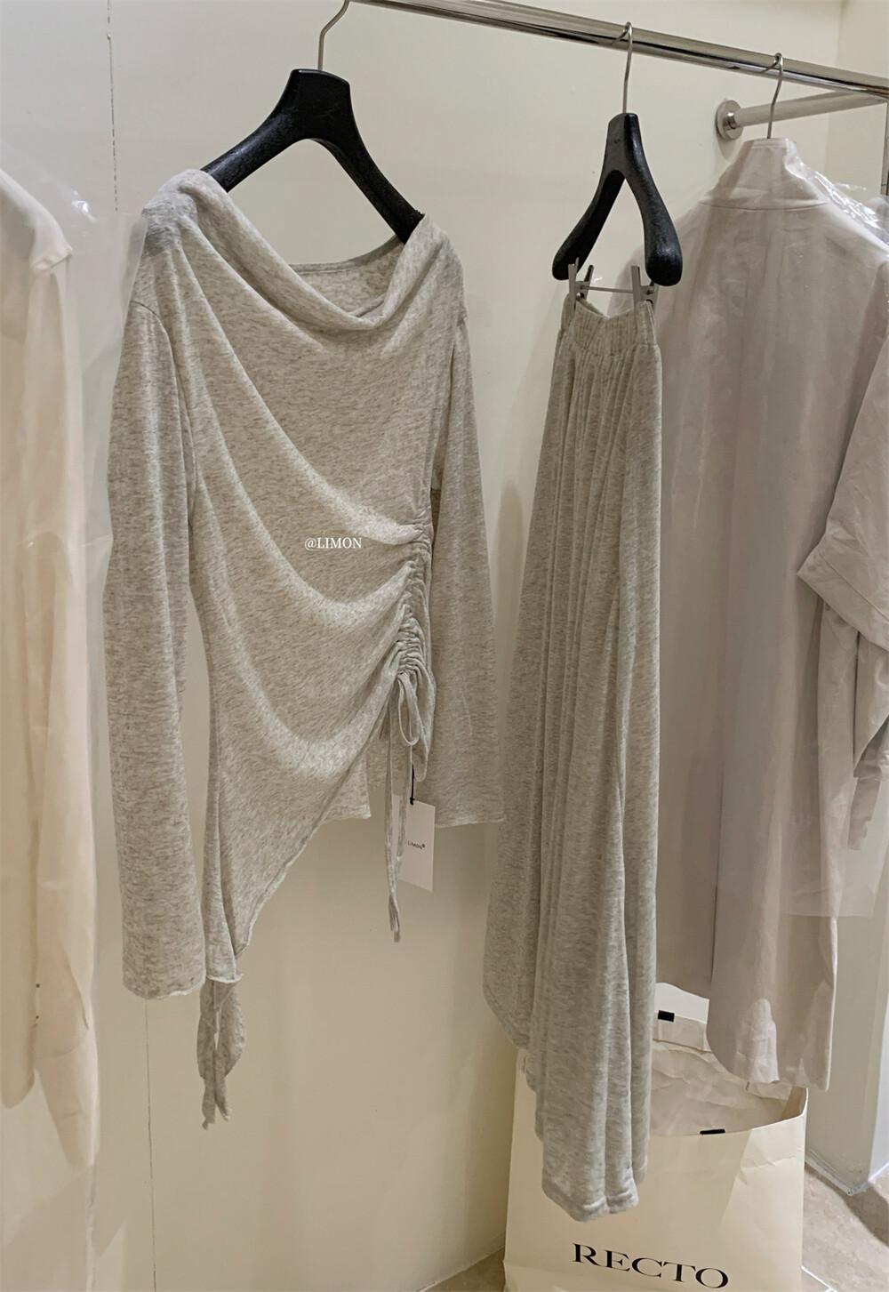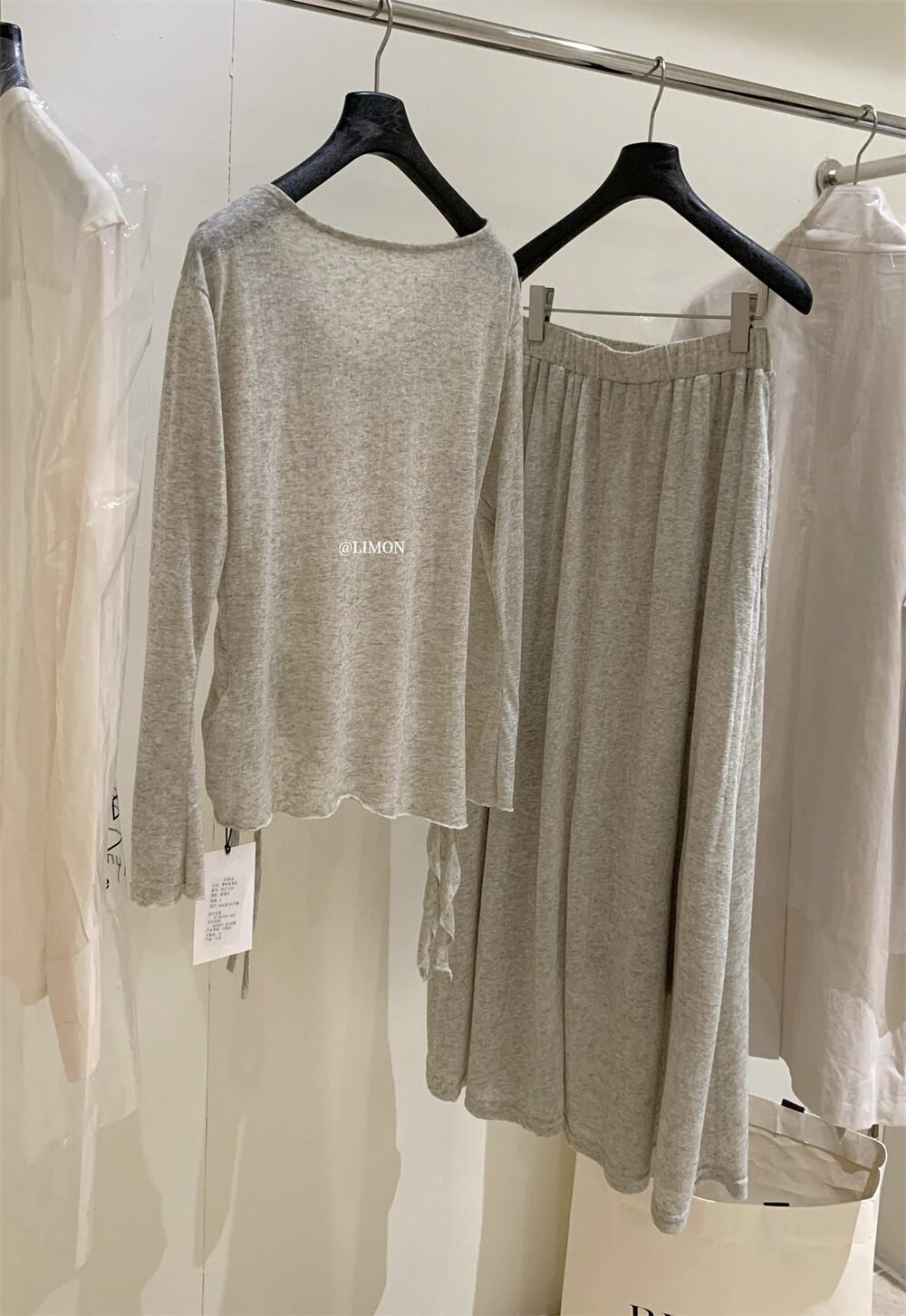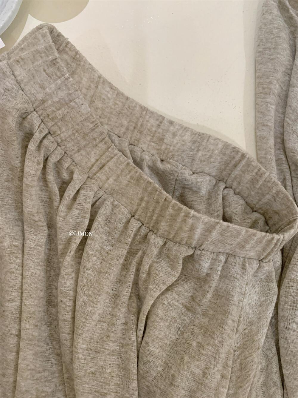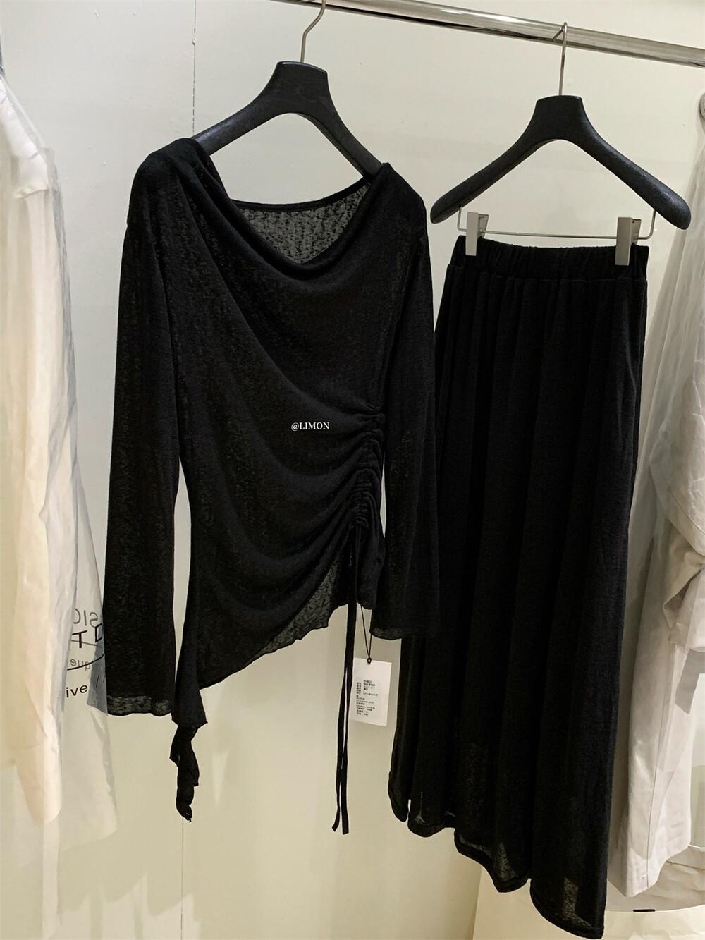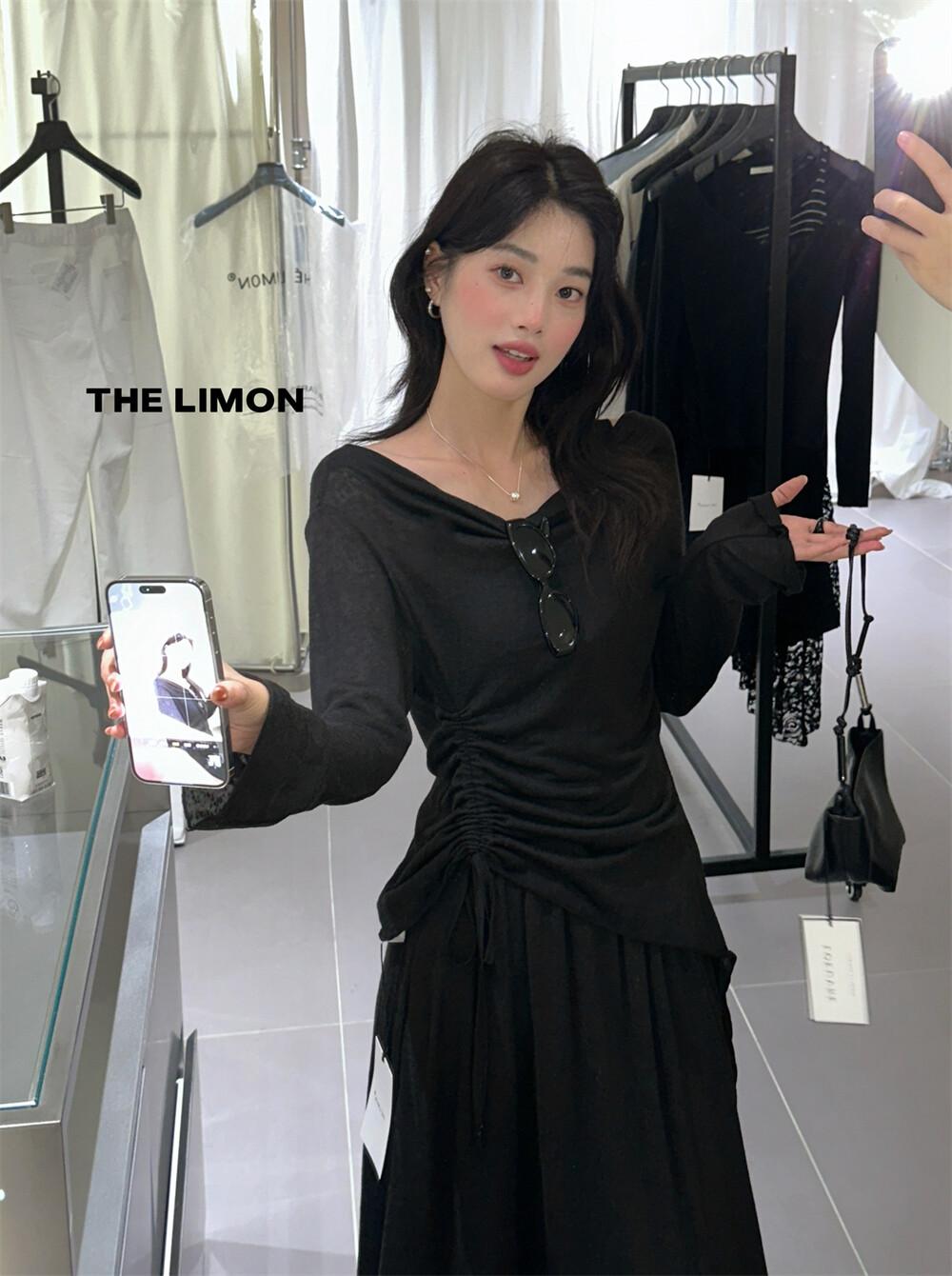 THE LIMON Camiseta de Manga Larga con Hombro Descubierto con Diseño de Otoño de Té Verde Limón + Falda Midi Larga Conjunto de Dos Piezas