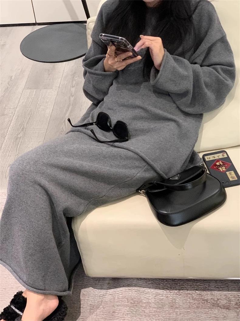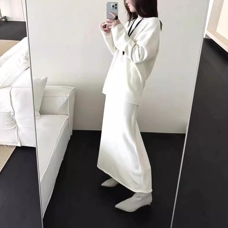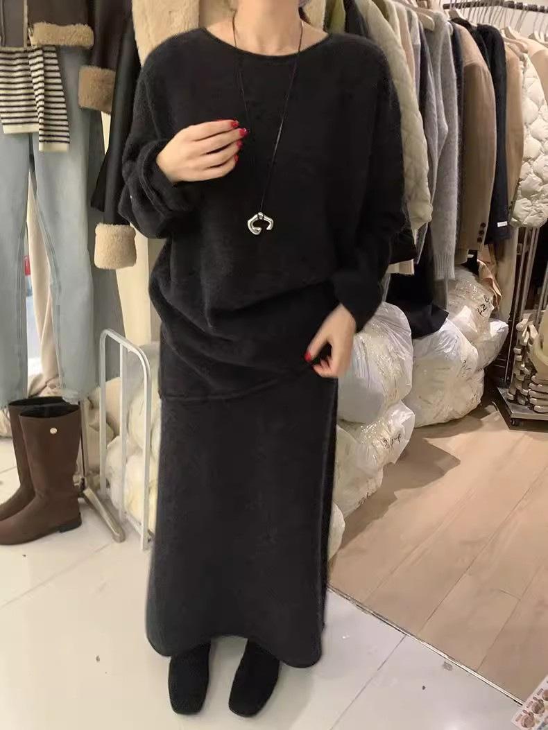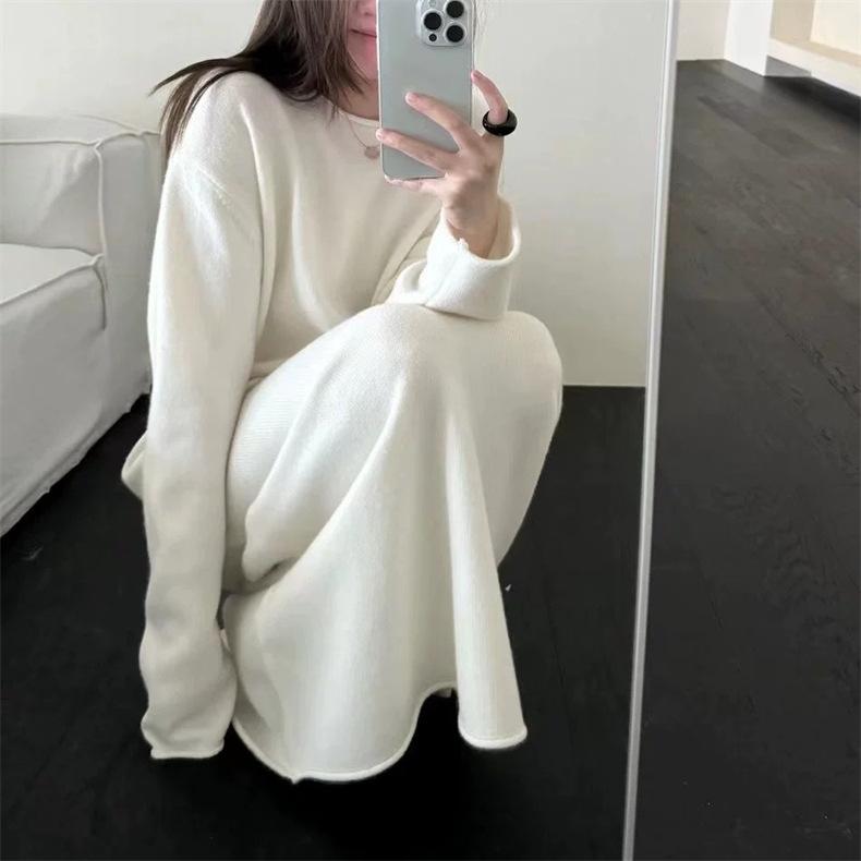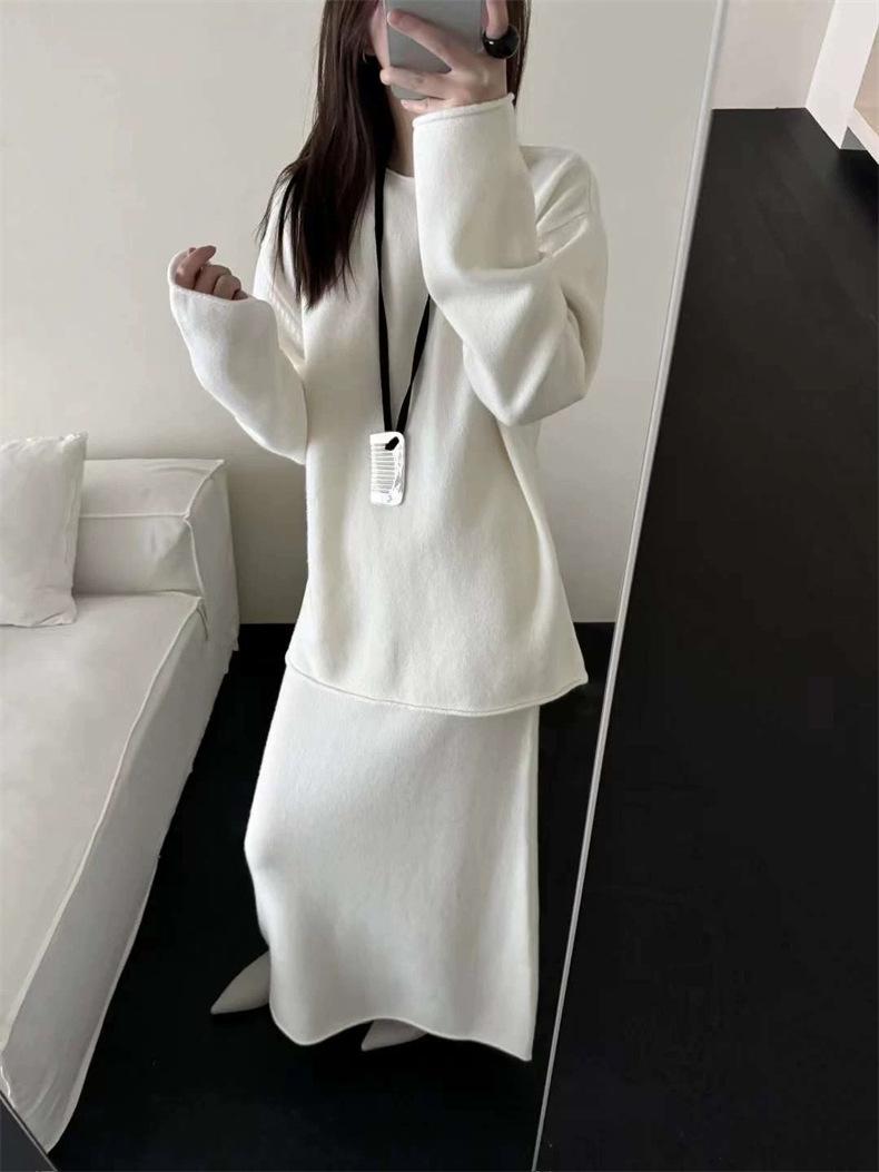 Suéter de Manga Larga Holgado de Cuello Redondo Estilo Perezoso Estilo Coreano para Mujer Otoño e Invierno 2025 Falda de Cintura Alta que Reduce la Edad Conjunto de Dos Piezas Ins