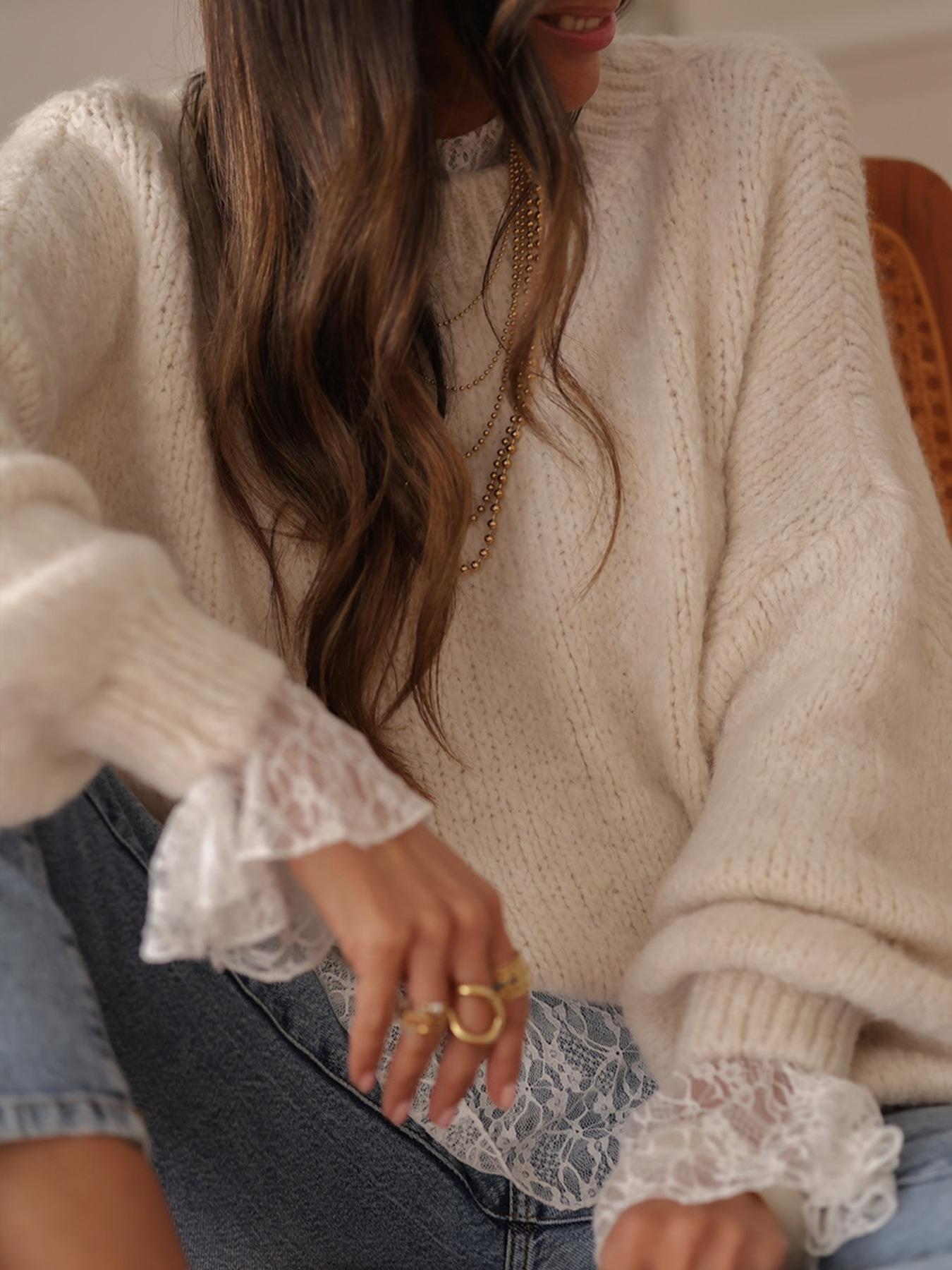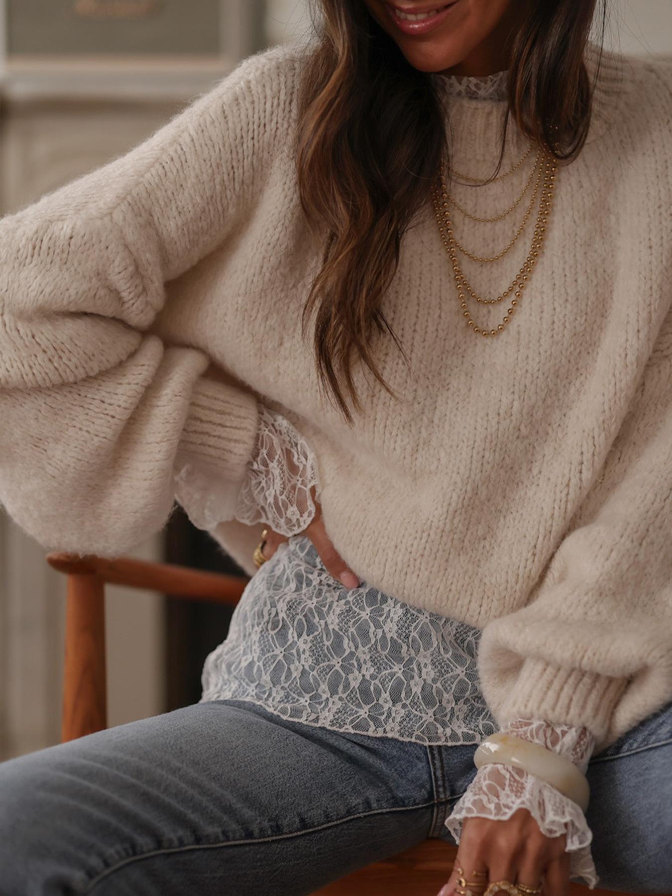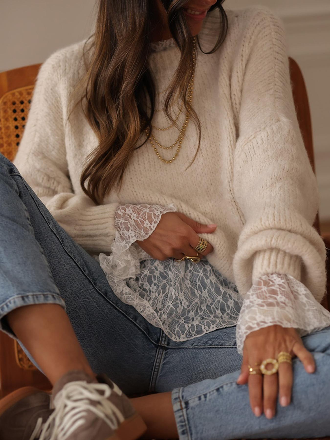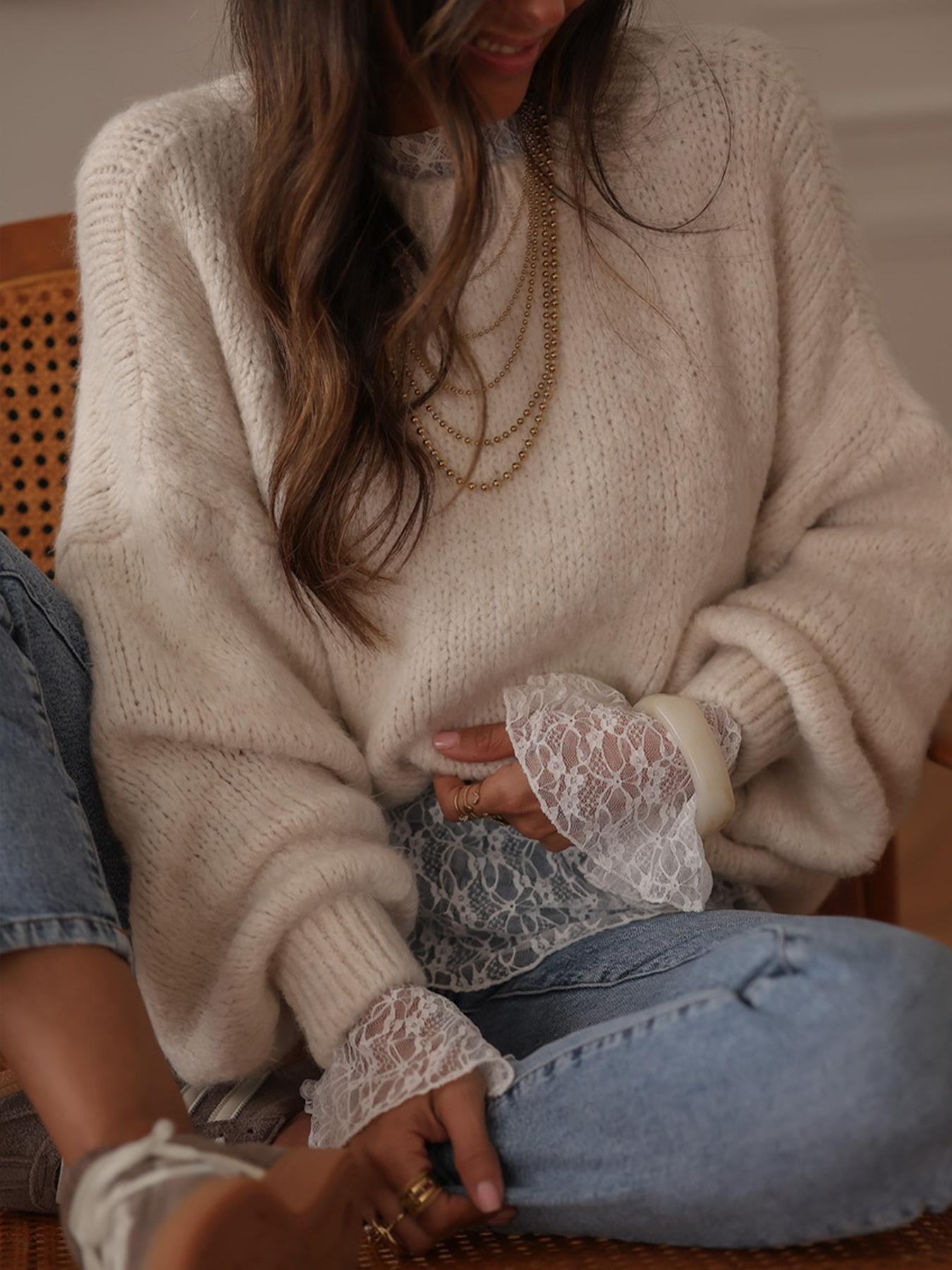 Suéter de Punto Holgado de Cuello Redondo para Mujer de Alta Gama con Manga de Encaje Estilo Perezoso Otoño e Invierno Color Puro Suave y Ceroso