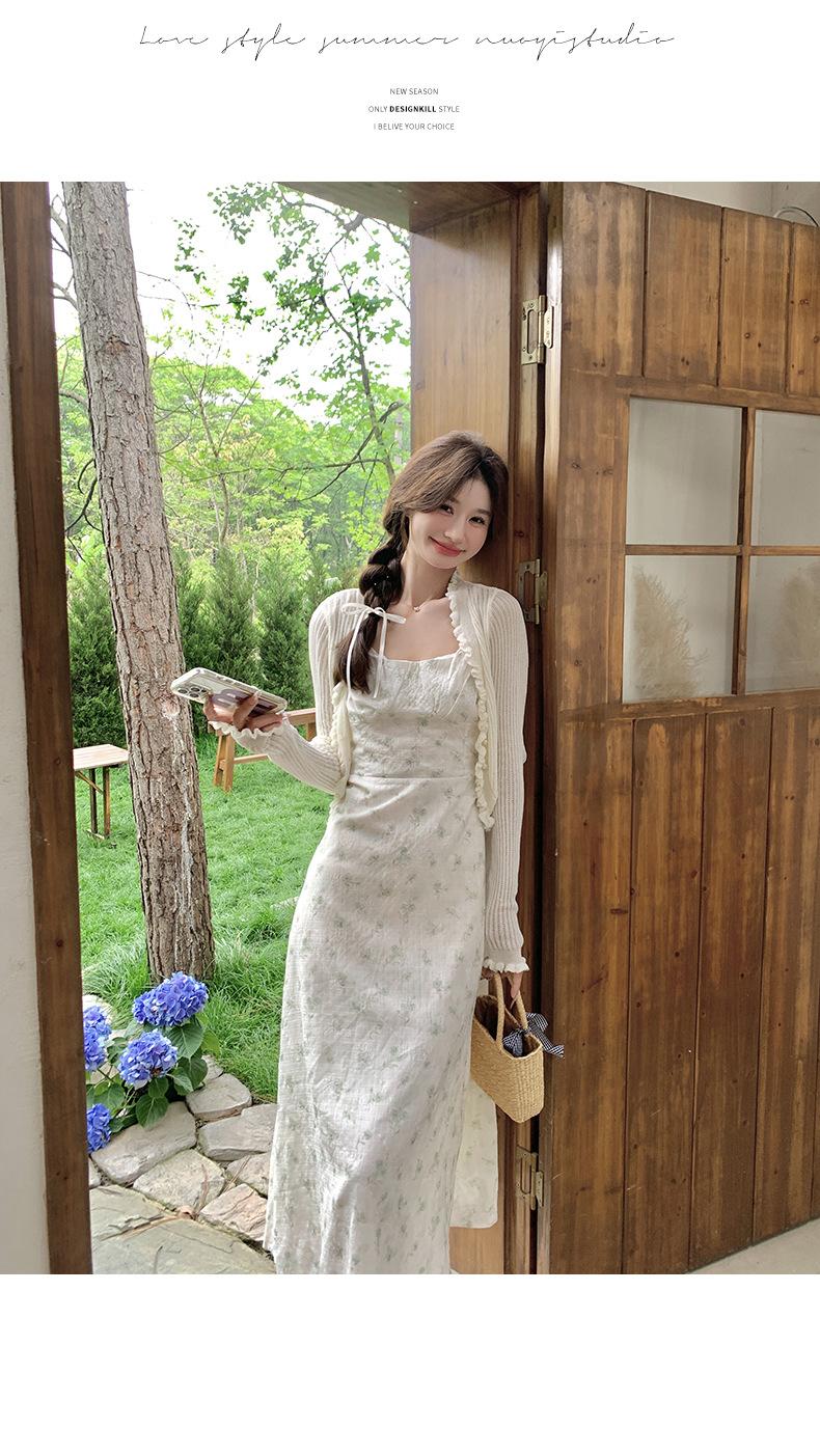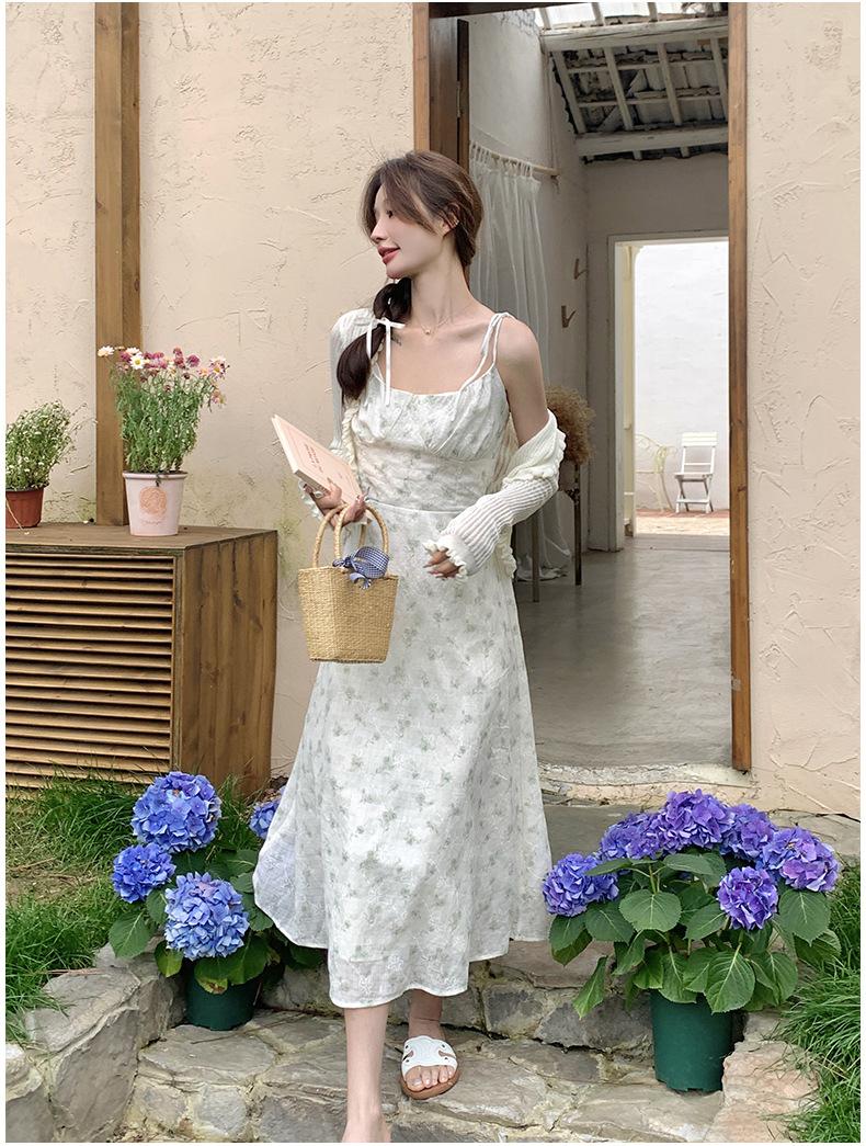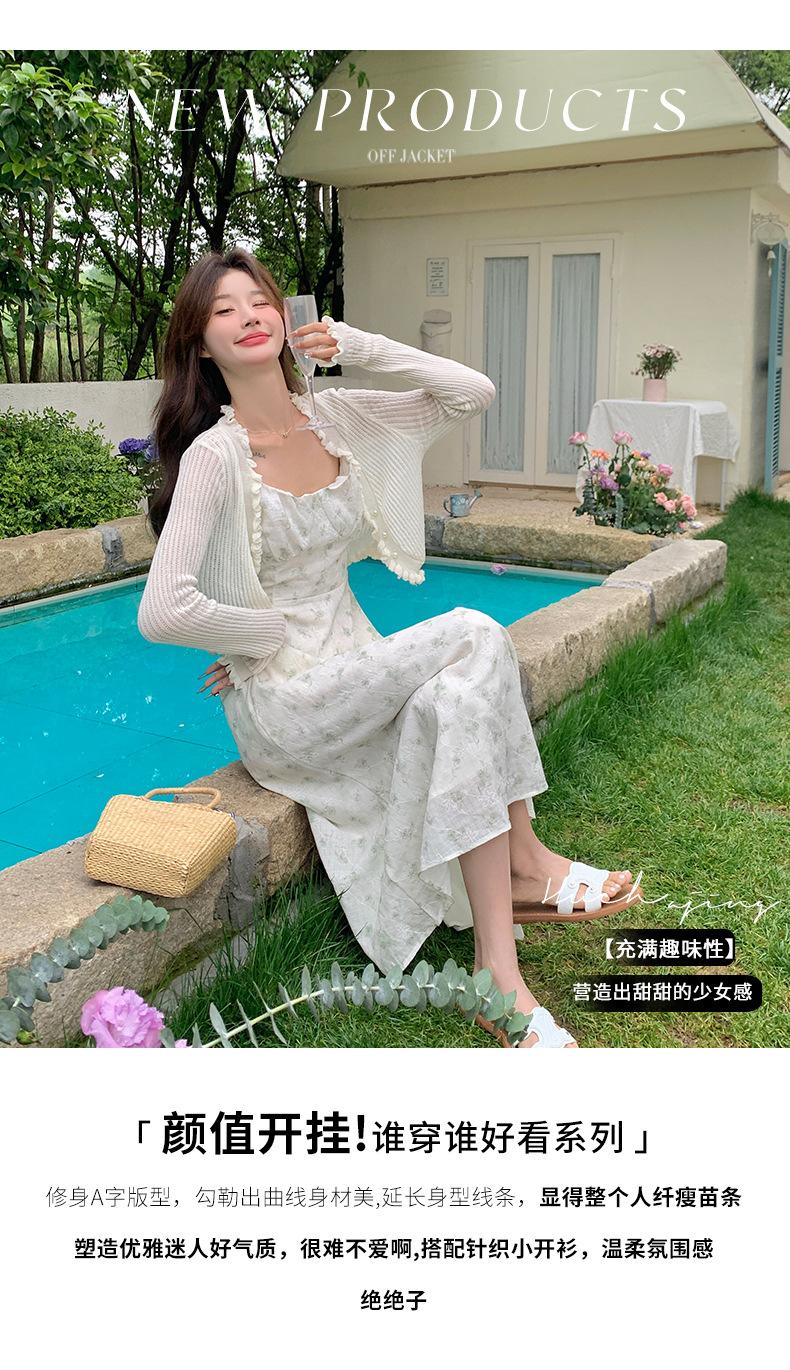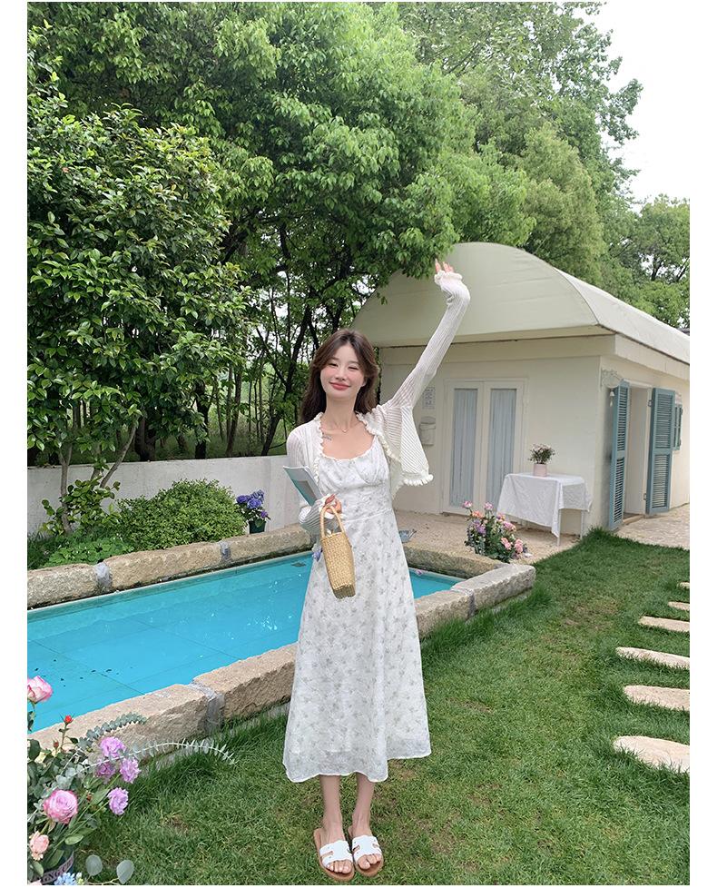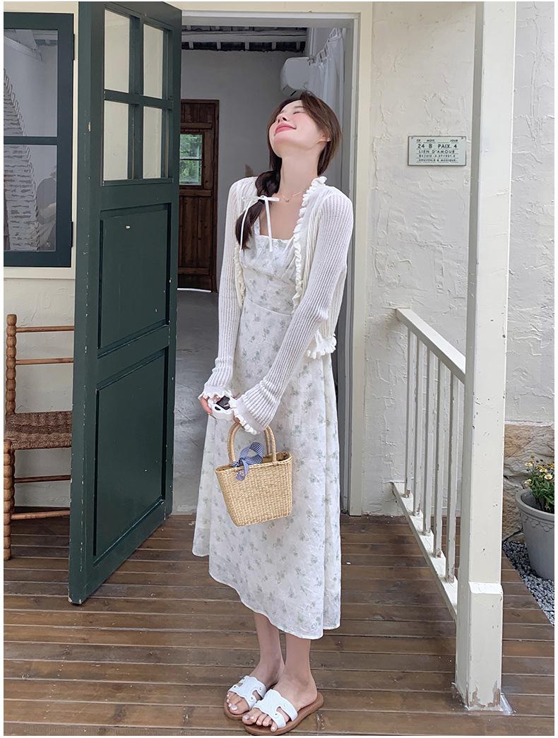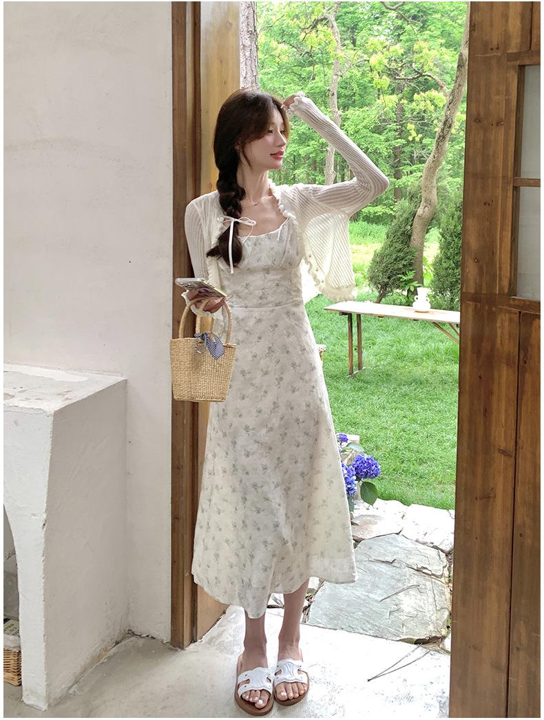 2025 Nueva Moda de Verano Casual Versátil Reductor de Edad Vestido Floral con Tirantes + Traje Cárdigan Protección Solar Moderno