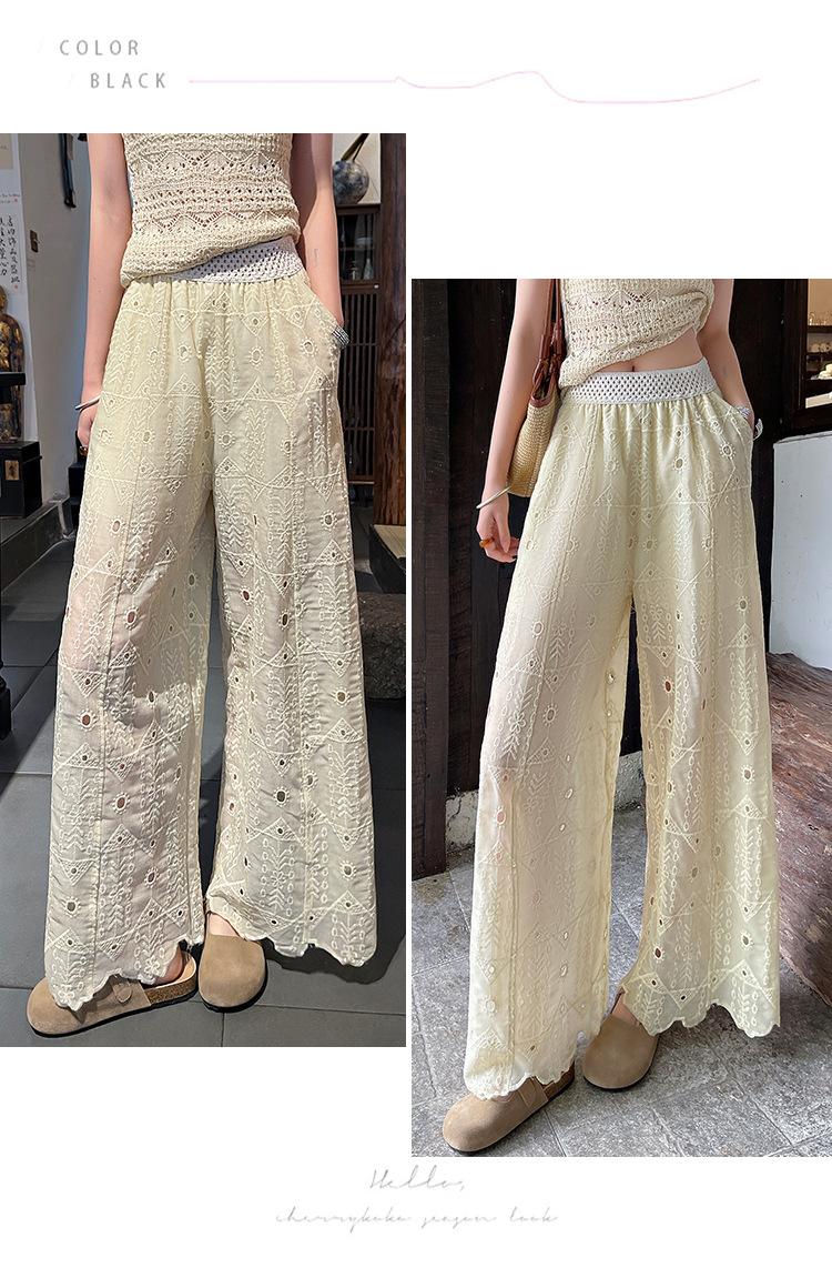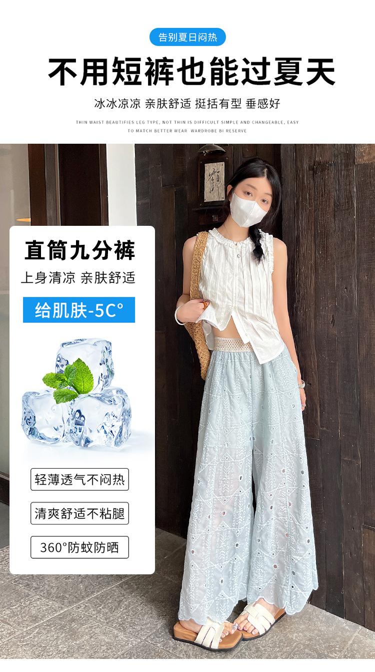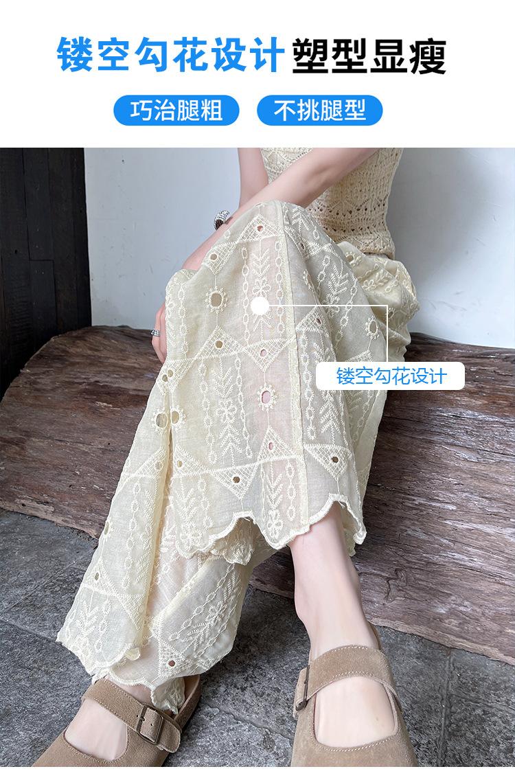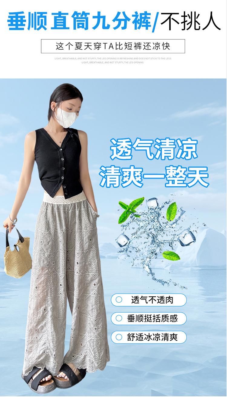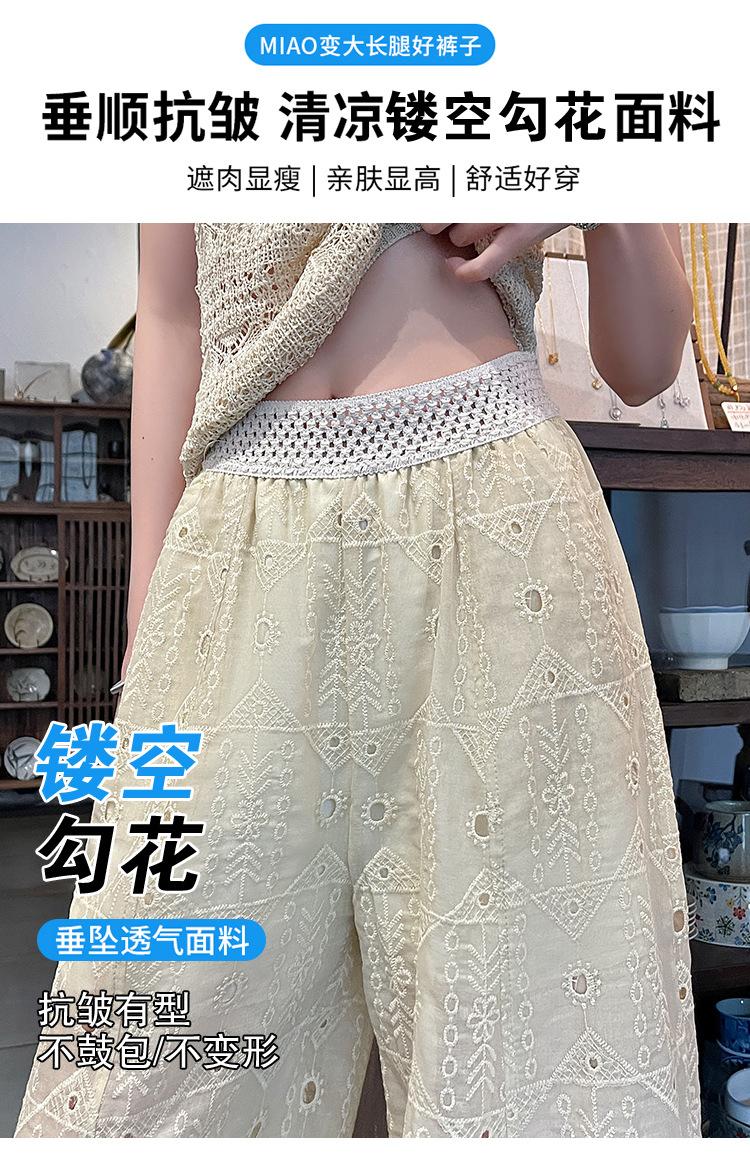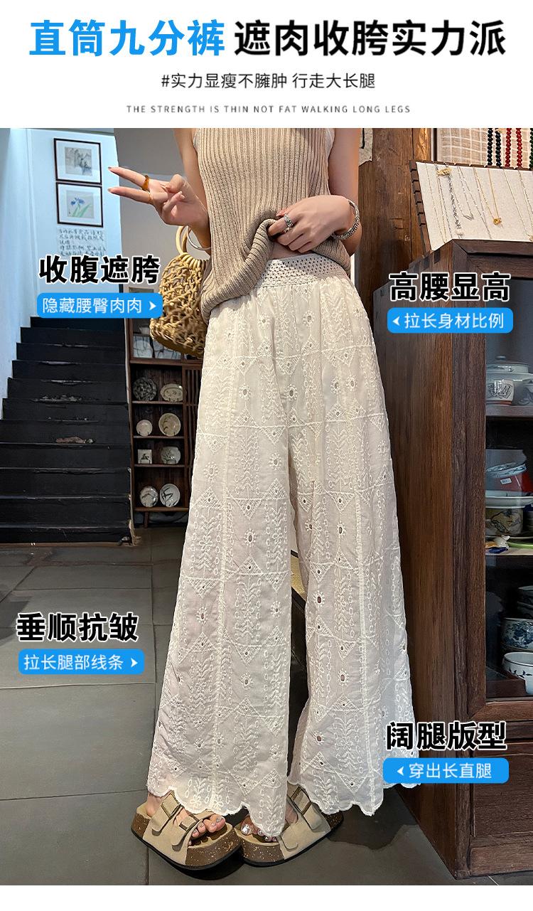 Pantalones rectos de nueve puntos de encaje calado con patrón de gancho de bordado grueso fino para mujer 2025 Verano Nuevo Look Adelgazante Pantalones de Pierna Ancha