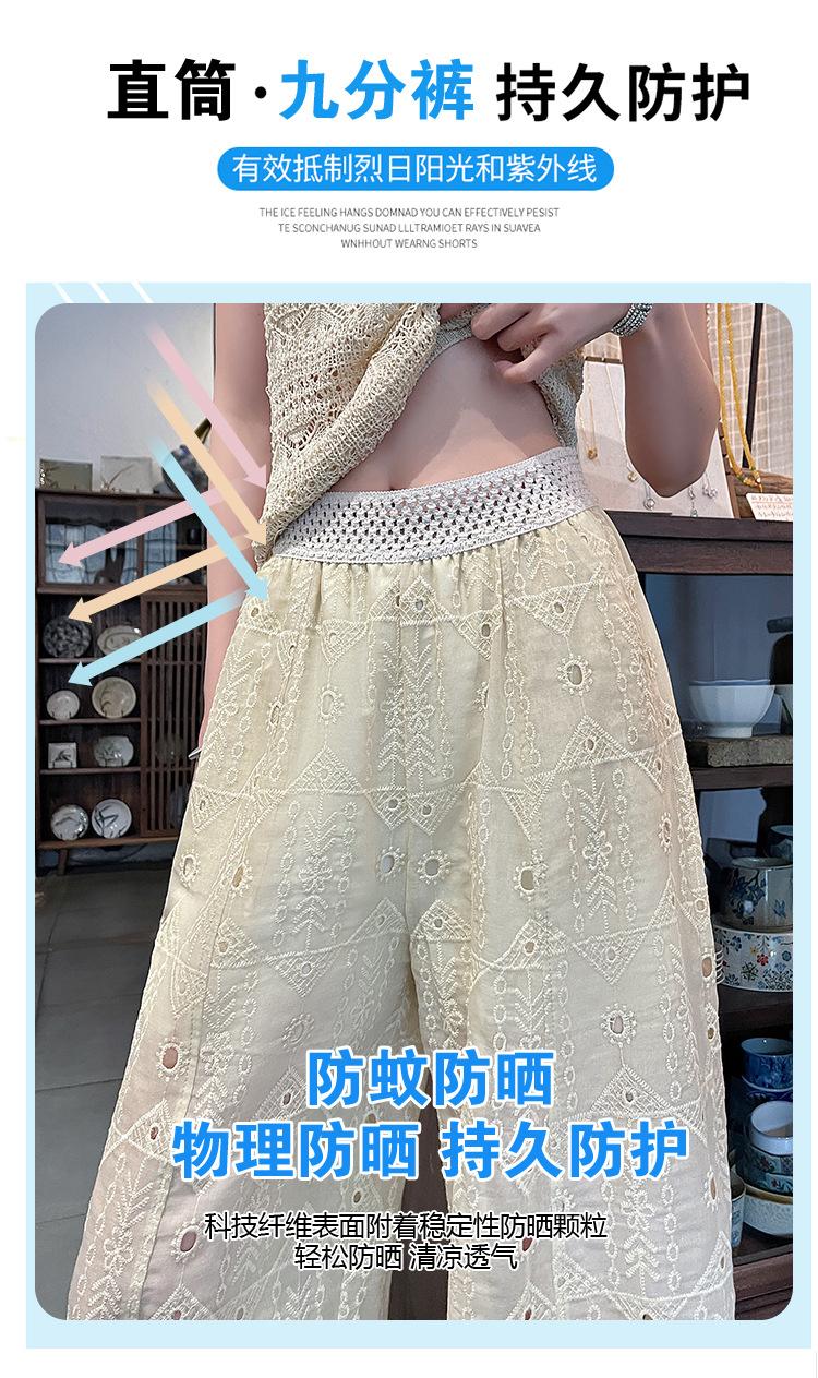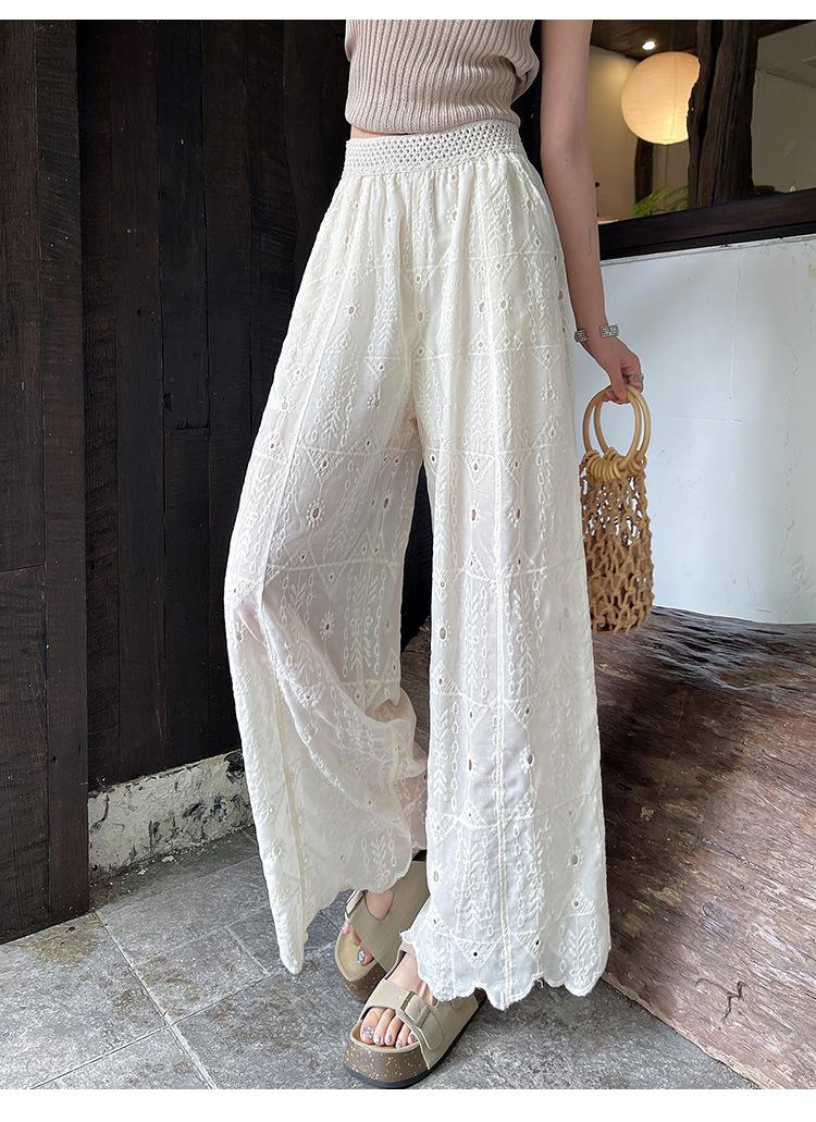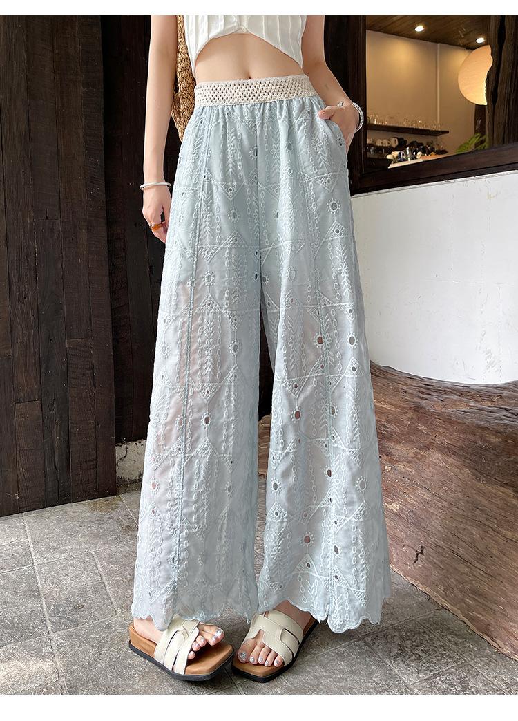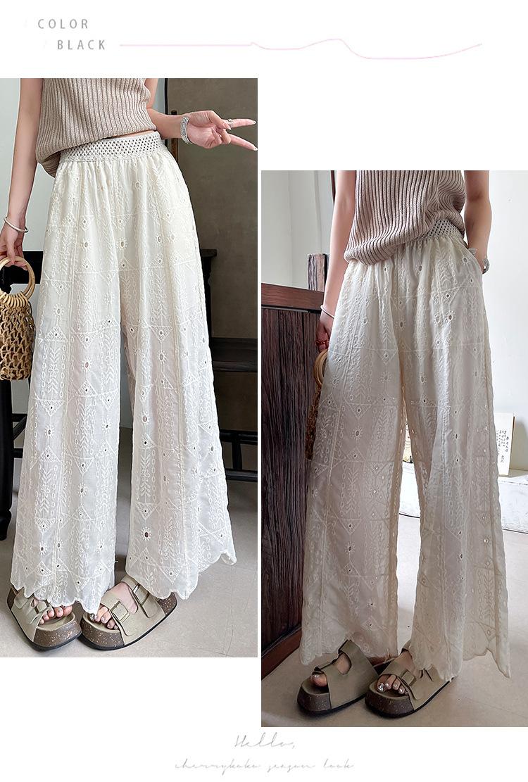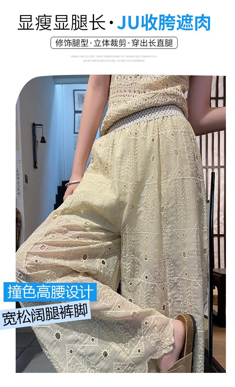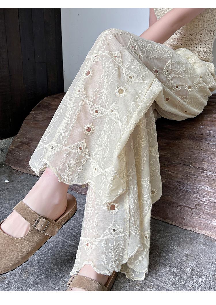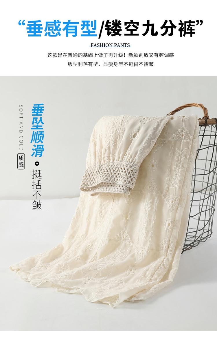Pantalones rectos de nueve puntos de encaje calado con patrón de gancho de bordado grueso fino para mujer 2025 Verano Nuevo Look Adelgazante Pantalones de Pierna Ancha