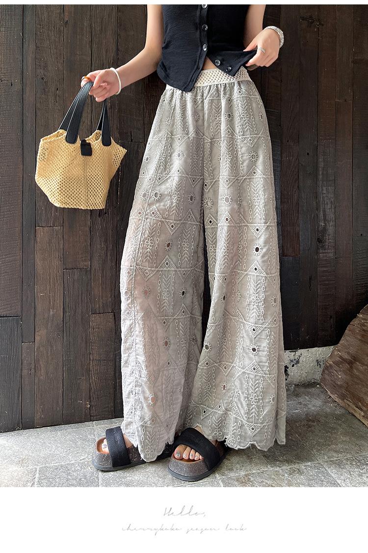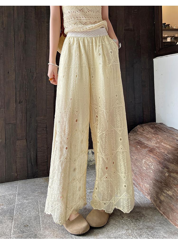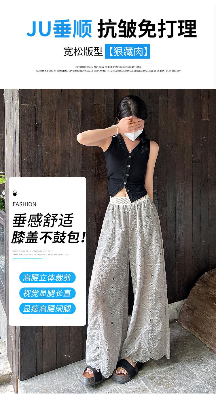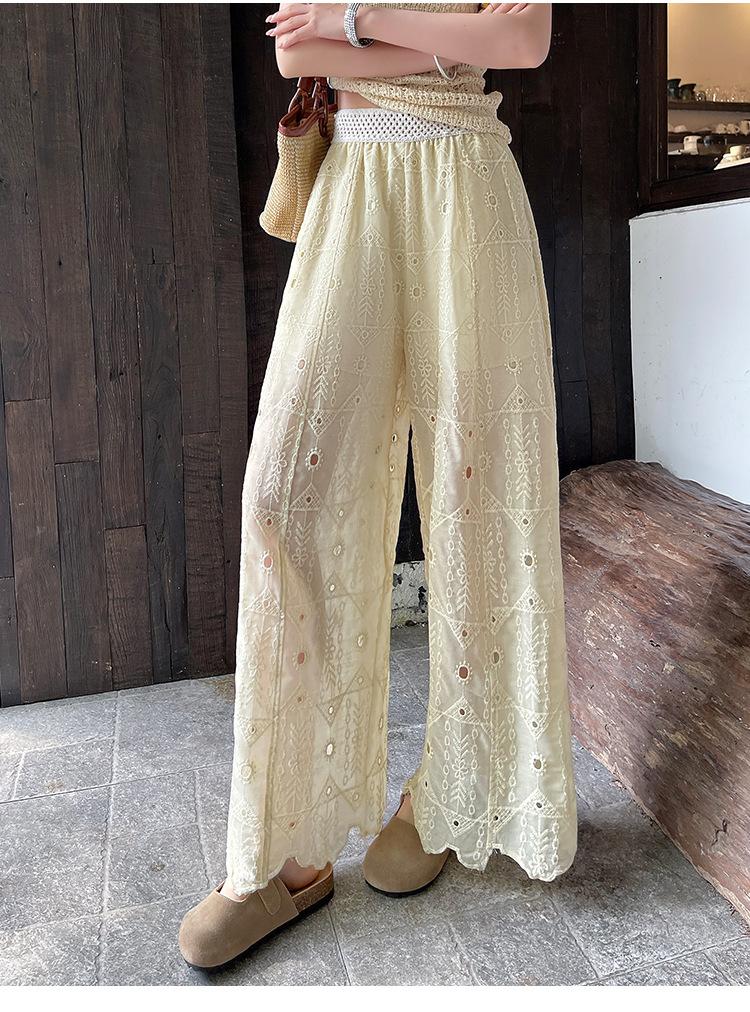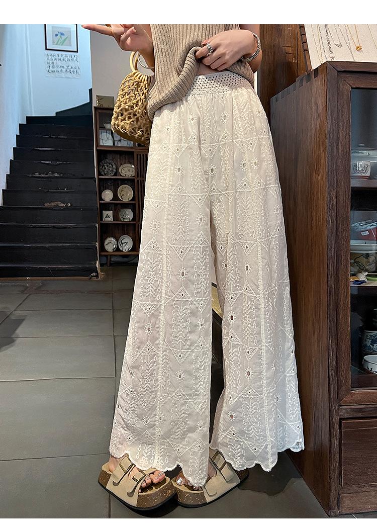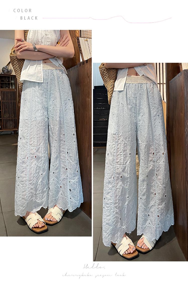 Pantalones rectos de nueve puntos de encaje calado con patrón de gancho de bordado grueso fino para mujer 2025 Verano Nuevo Look Adelgazante Pantalones de Pierna Ancha