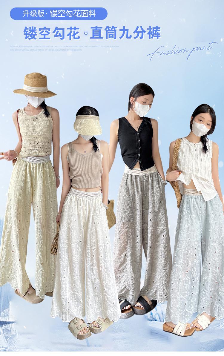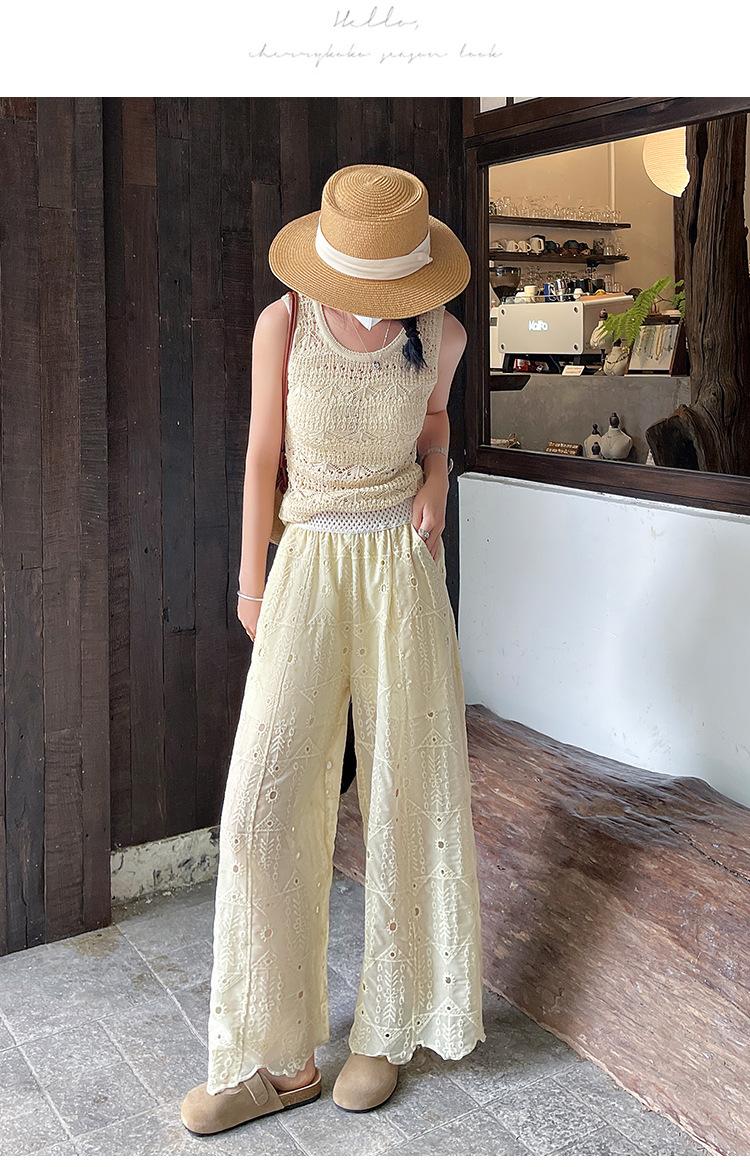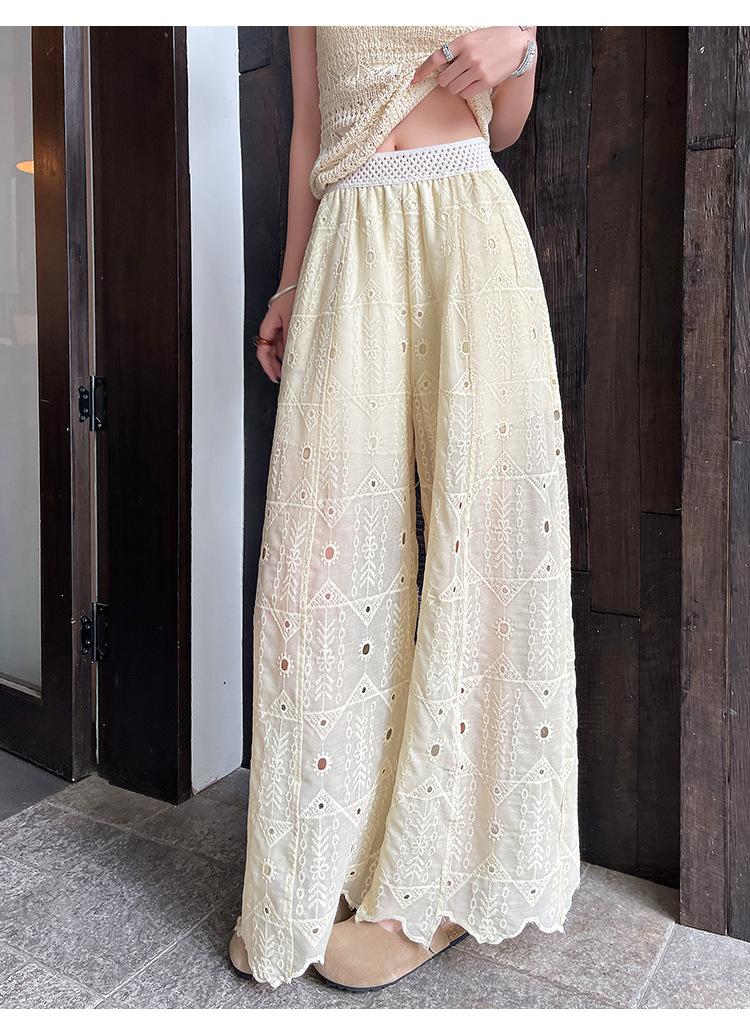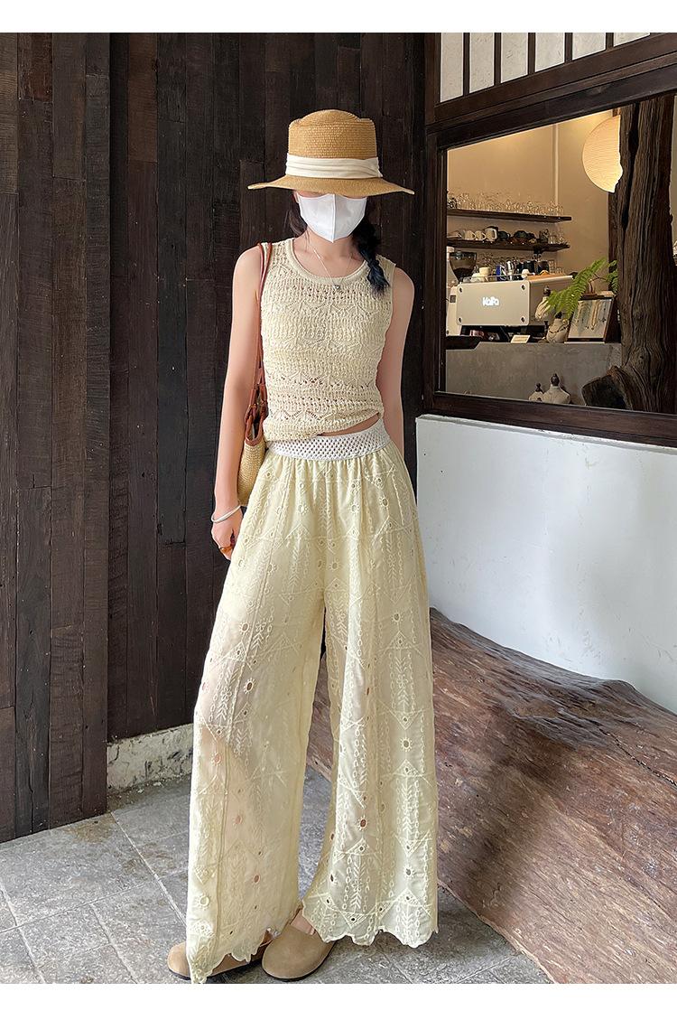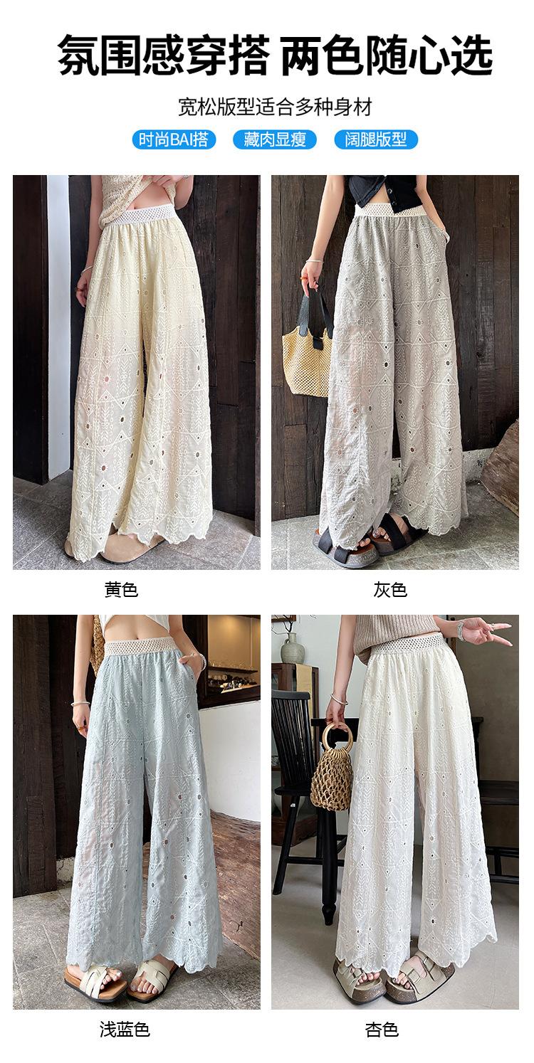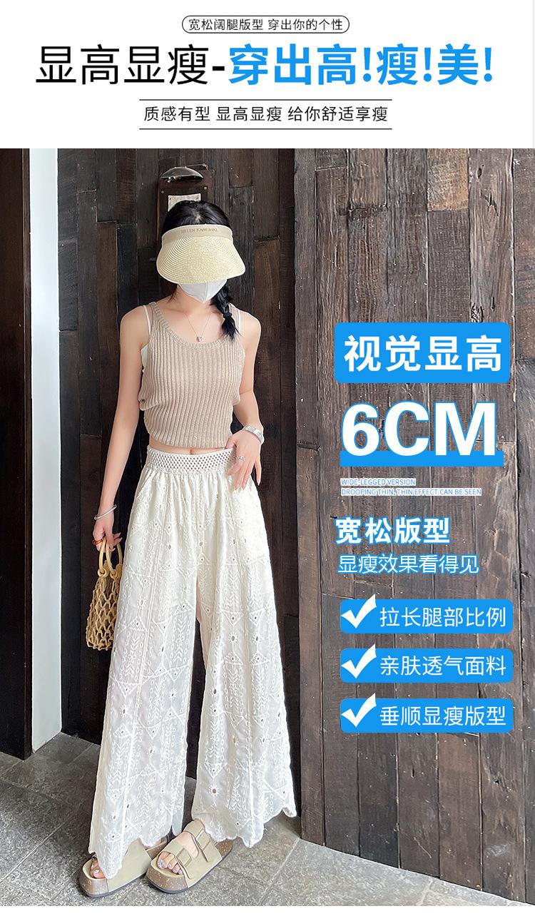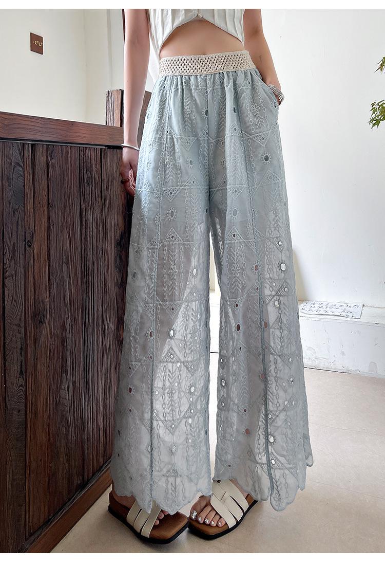 Pantalones rectos de nueve puntos de encaje calado con patrón de gancho de bordado grueso fino para mujer 2025 Verano Nuevo Look Adelgazante Pantalones de Pierna Ancha