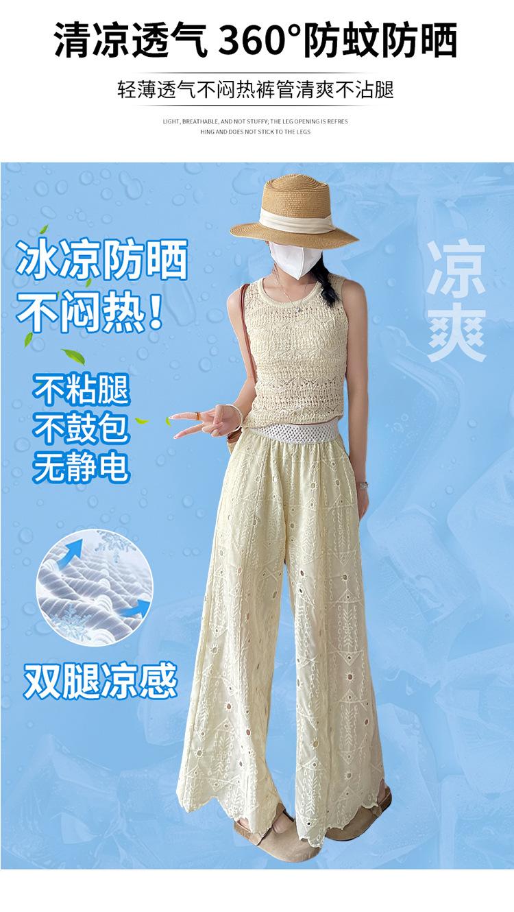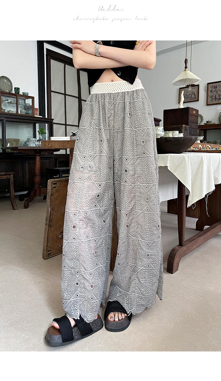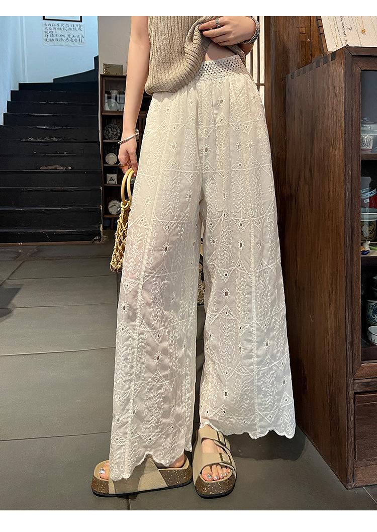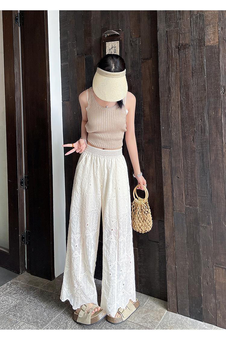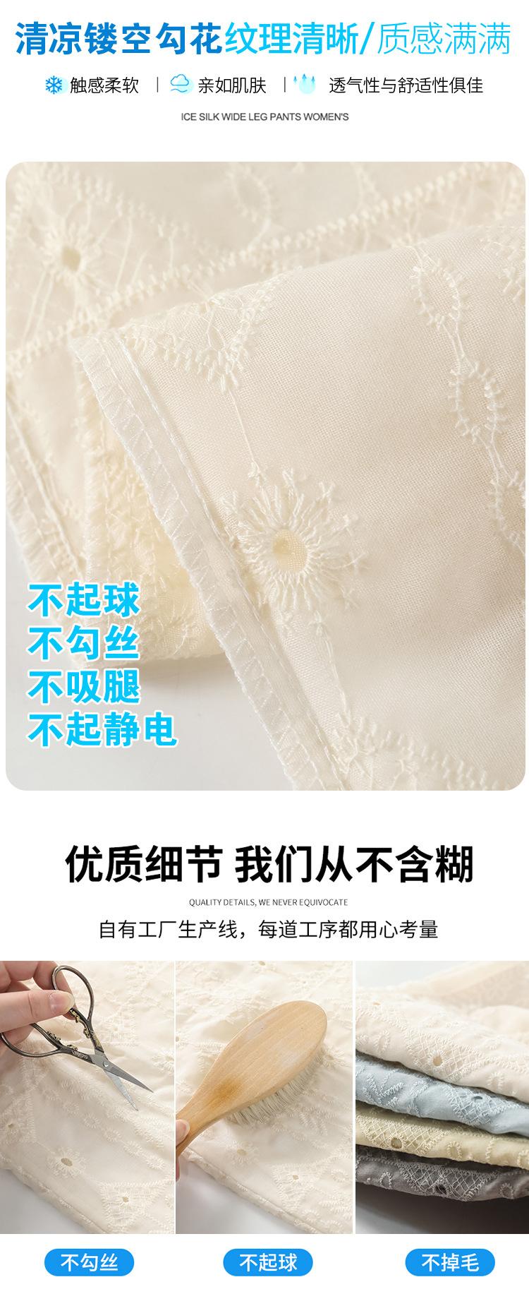 Pantalones rectos de nueve puntos de encaje calado con patrón de gancho de bordado grueso fino para mujer 2025 Verano Nuevo Look Adelgazante Pantalones de Pierna Ancha
