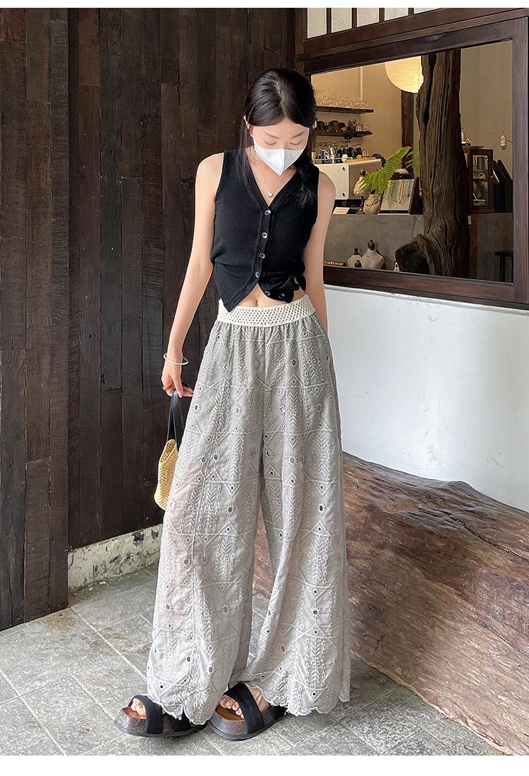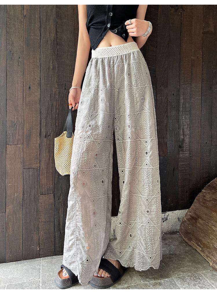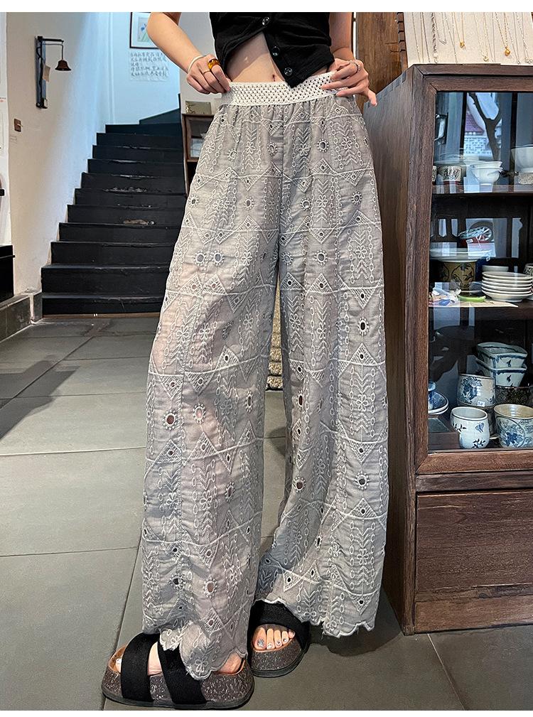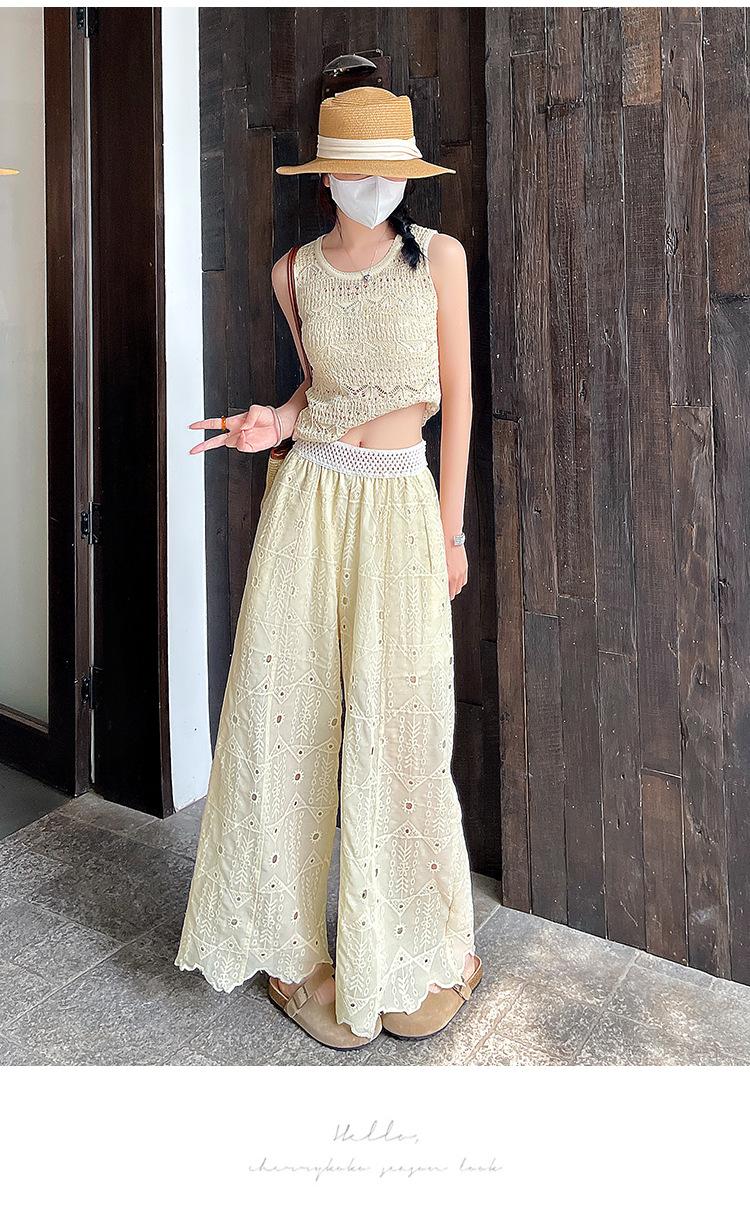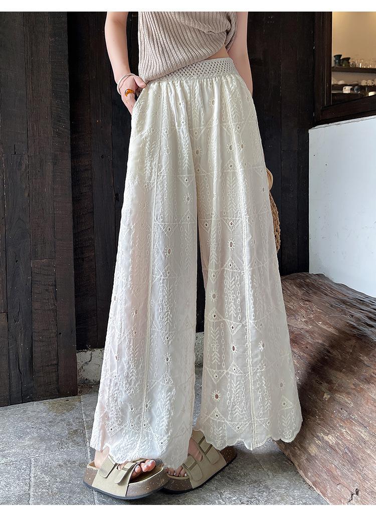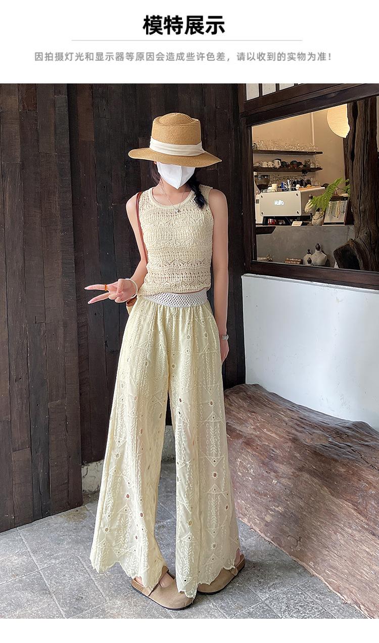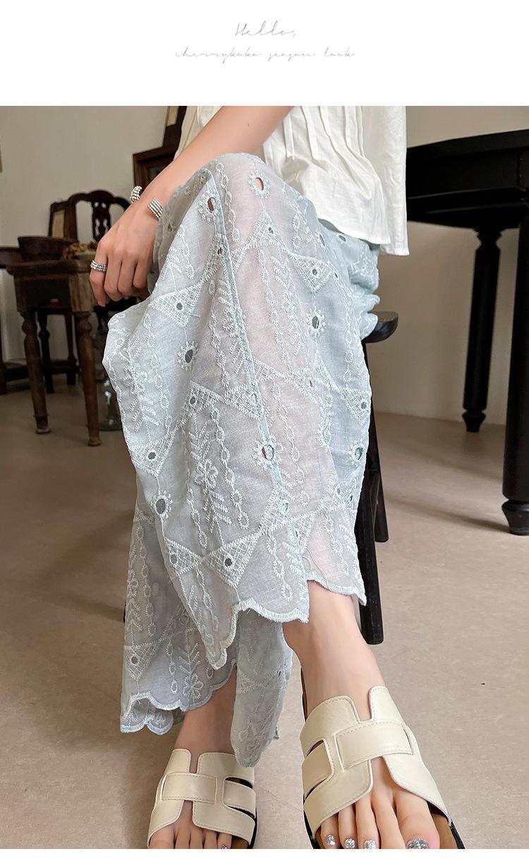 Pantalones rectos de nueve puntos de encaje calado con patrón de gancho de bordado grueso fino para mujer 2025 Verano Nuevo Look Adelgazante Pantalones de Pierna Ancha