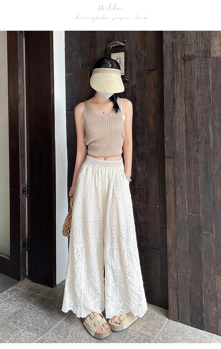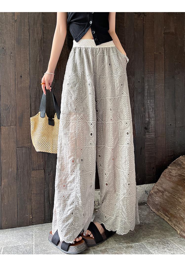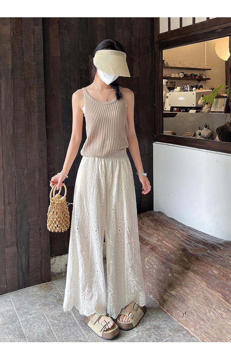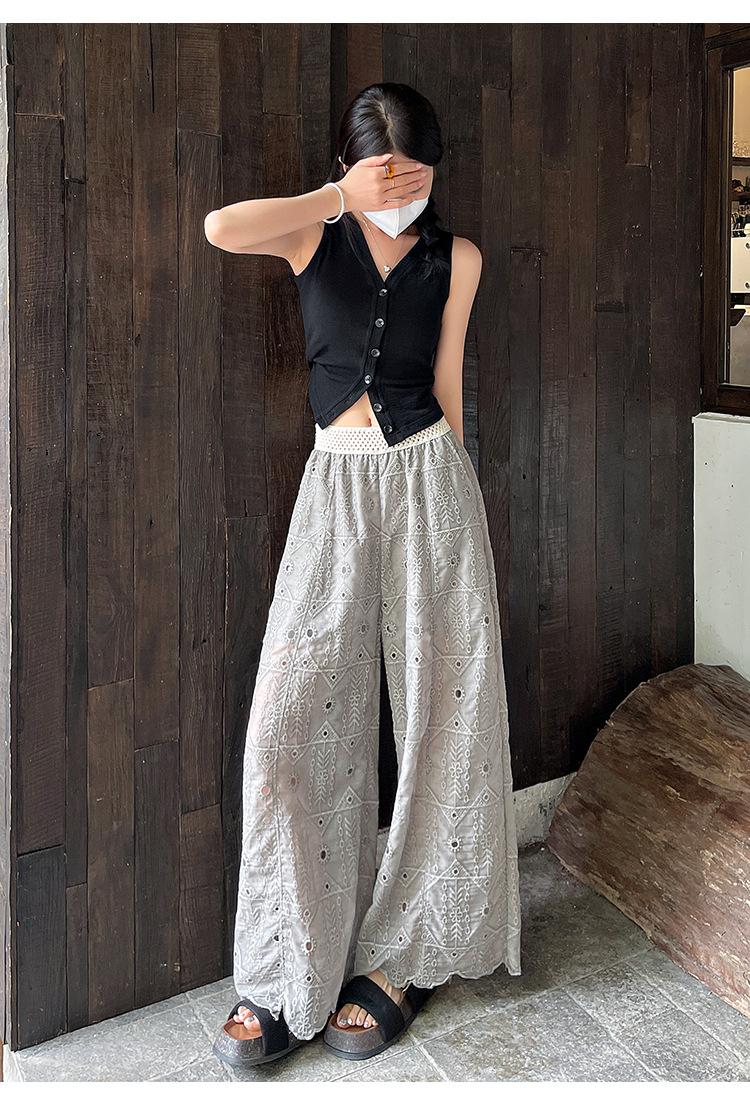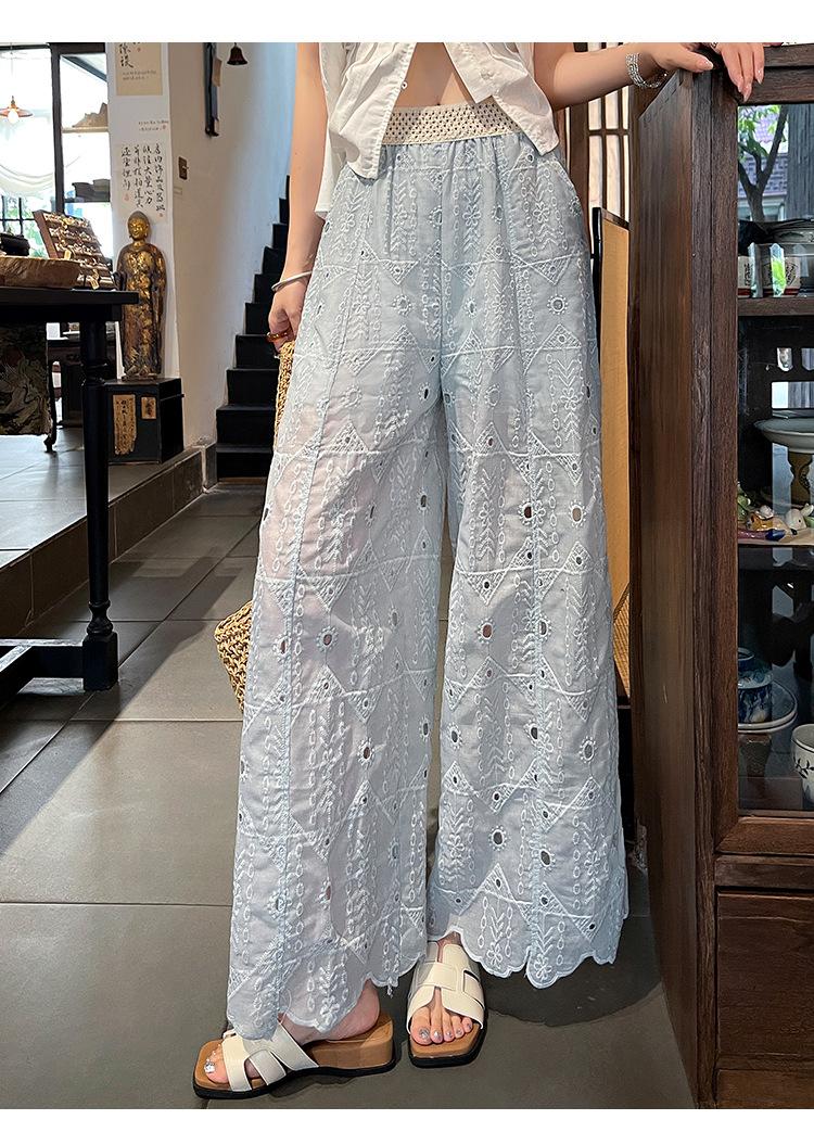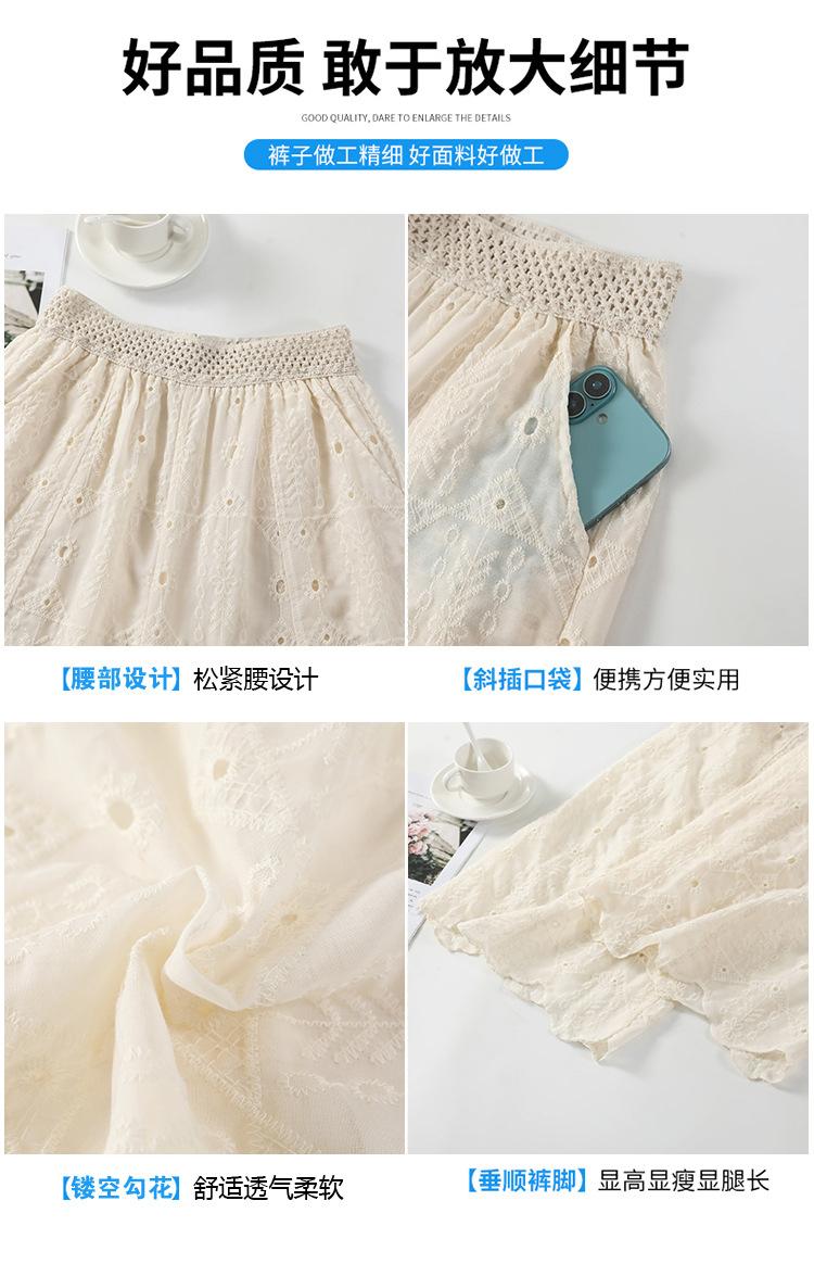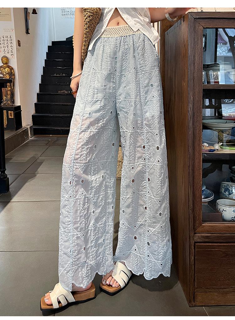 Pantalones rectos de nueve puntos de encaje calado con patrón de gancho de bordado grueso fino para mujer 2025 Verano Nuevo Look Adelgazante Pantalones de Pierna Ancha