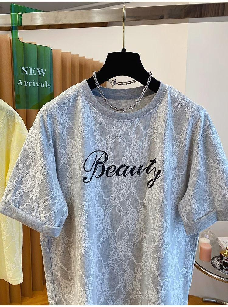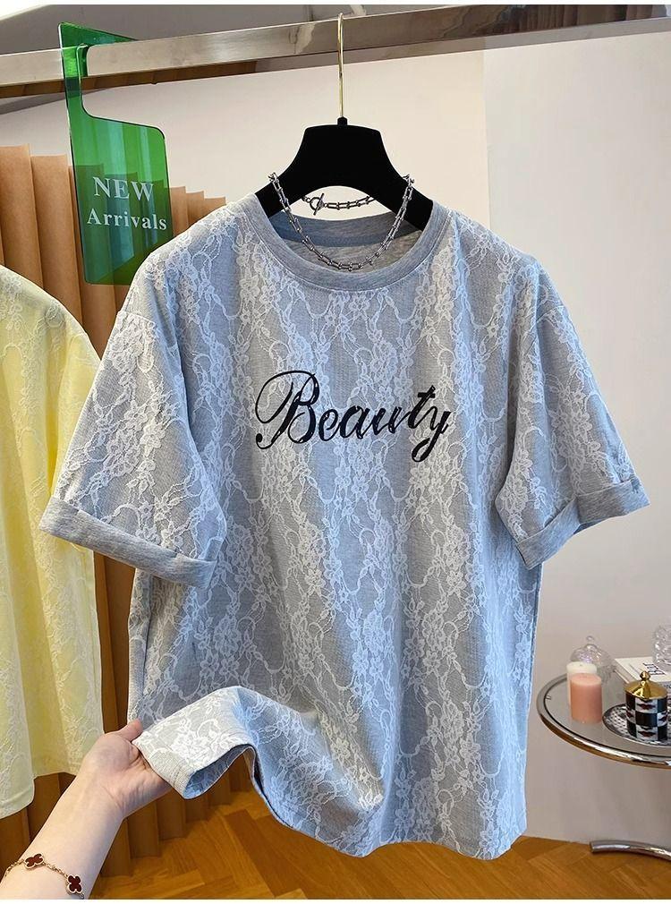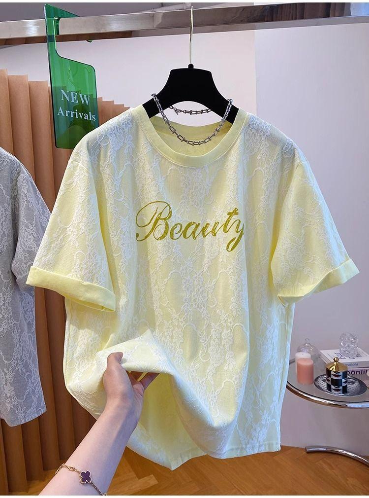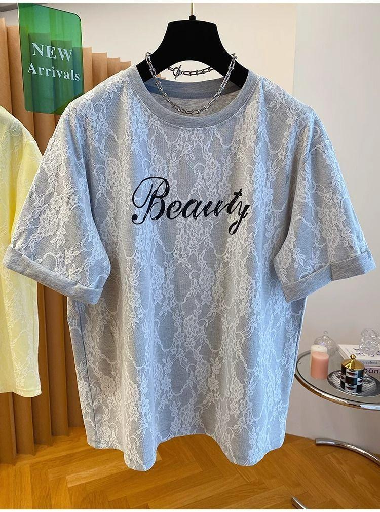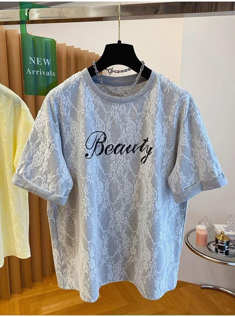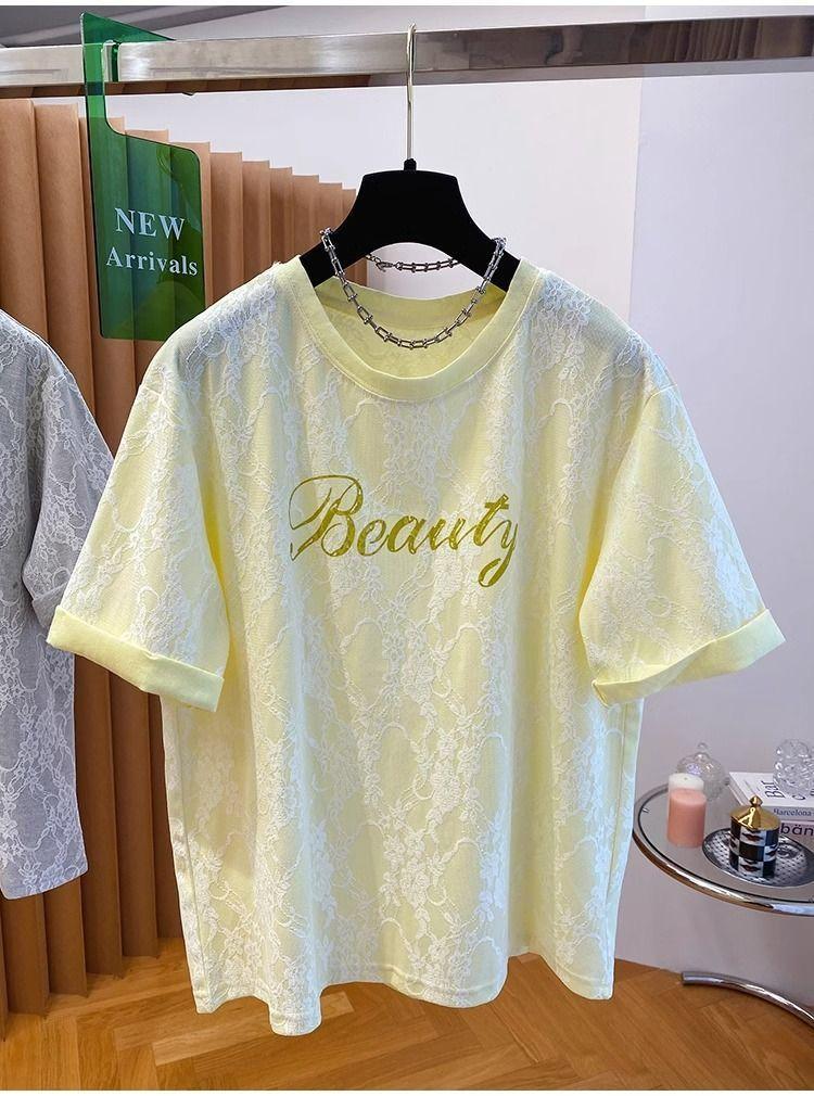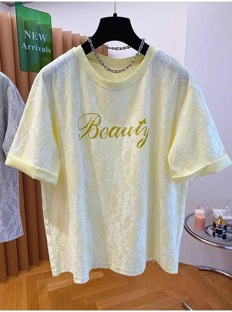 2025 Nuevo Verano Casual Encaje Pesado Super Bonito y Hermoso Letras Suelto Algodón Manga Corta Camisetas Tops para Mujer