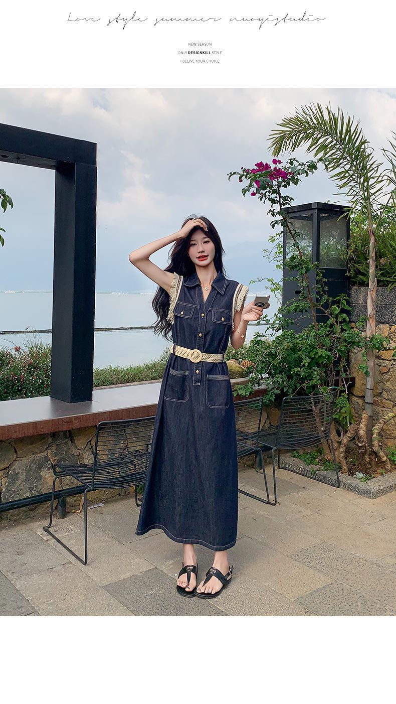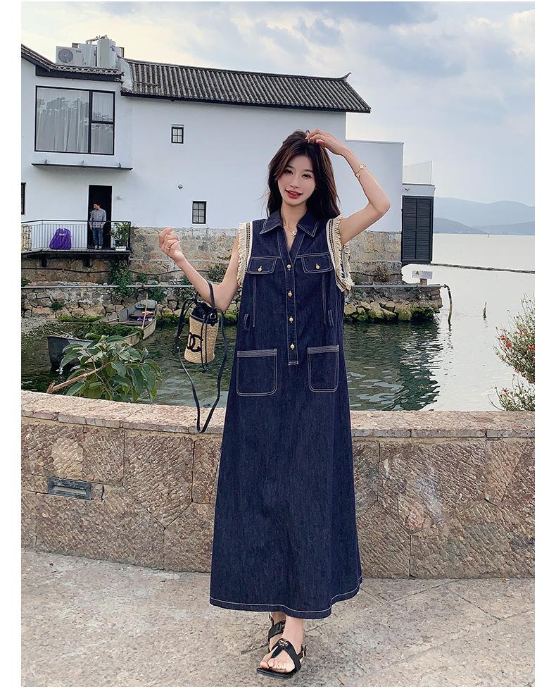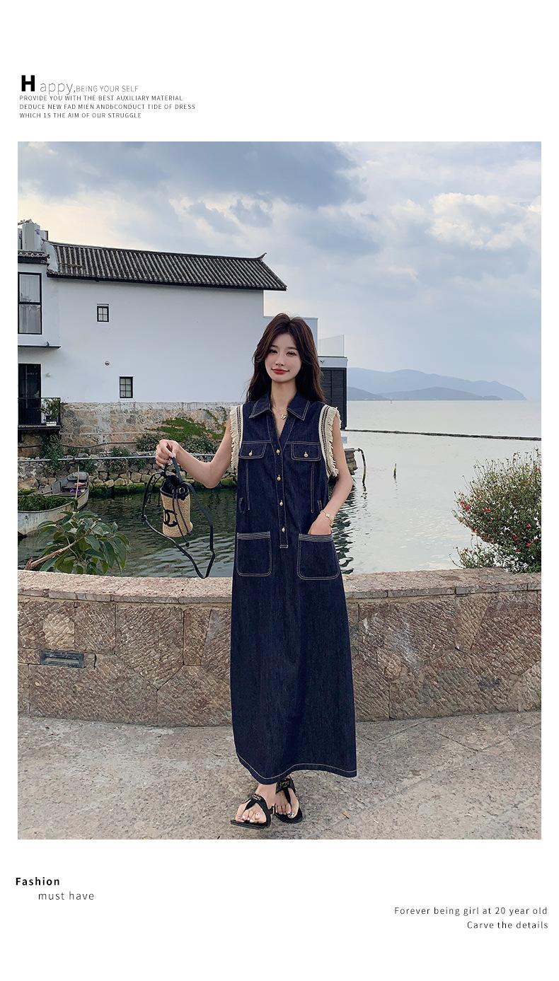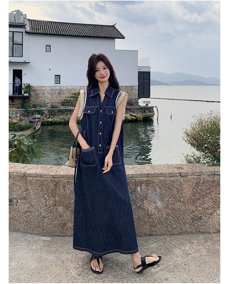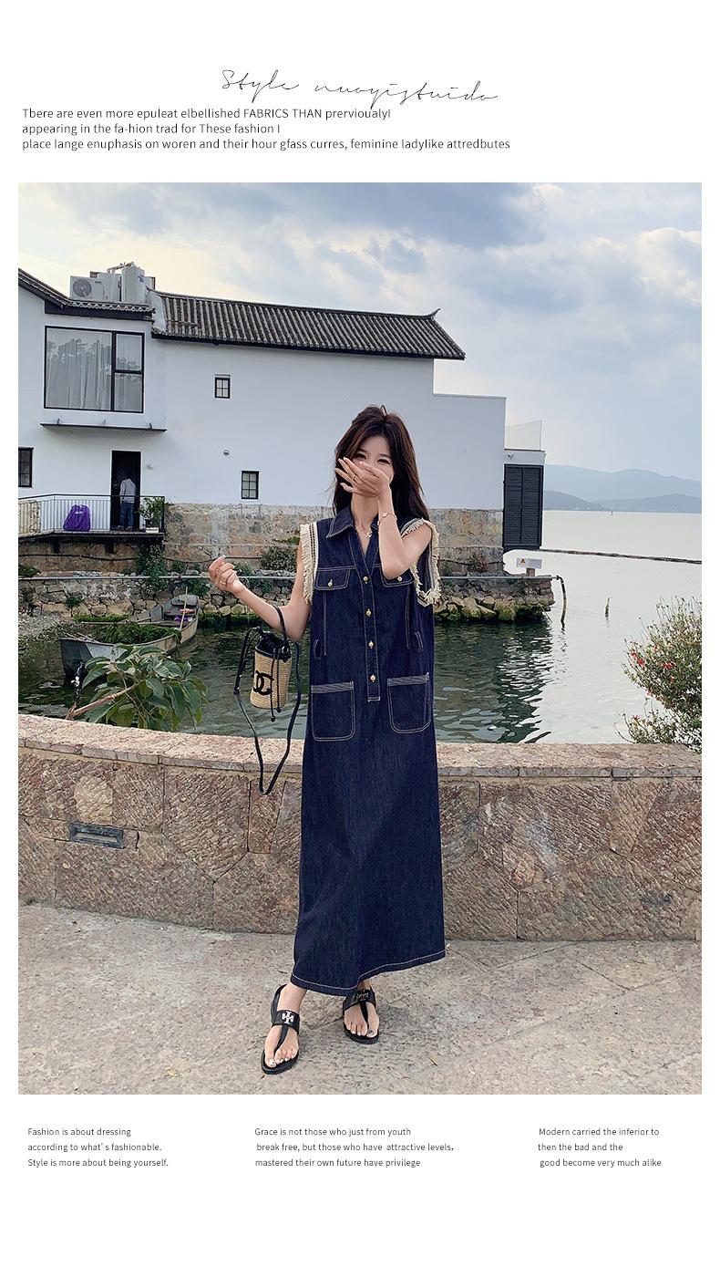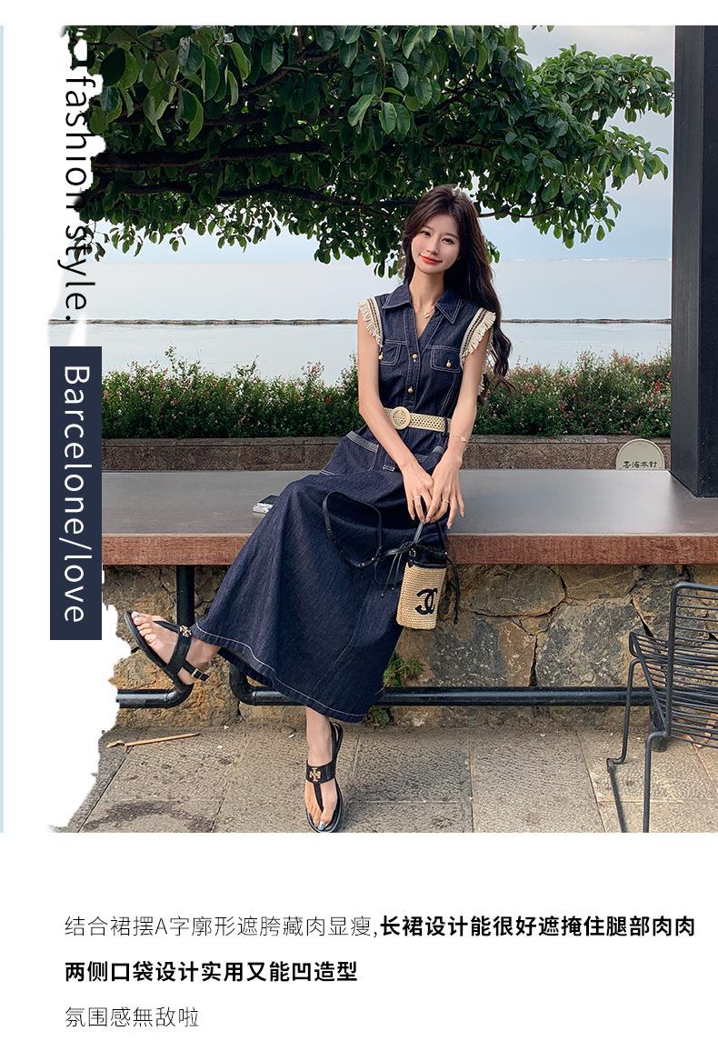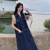 Vestido Adelgazante y Favorecedor de la Figura Estilo Temperamento 2025 Verano Nuevo Sin Mangas Cuello Camisero Adelgazante de Cintura Línea A Vestido Largo