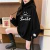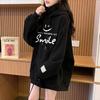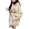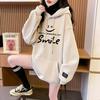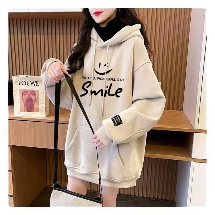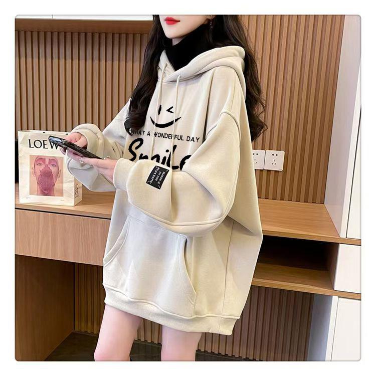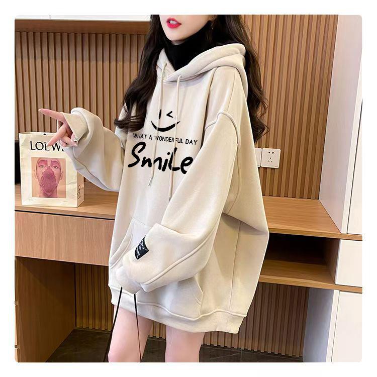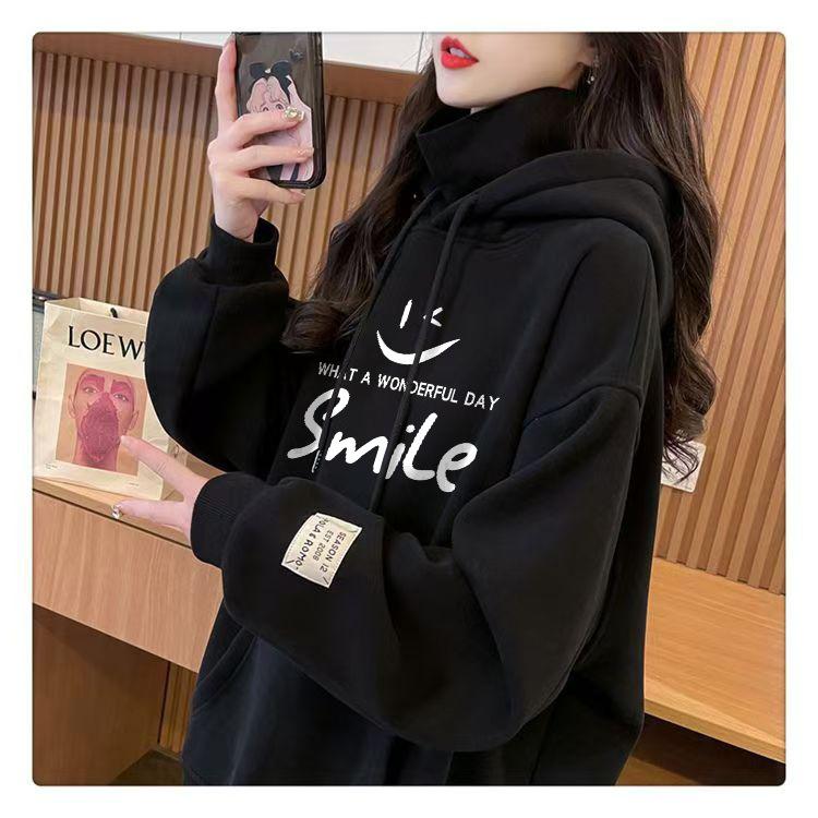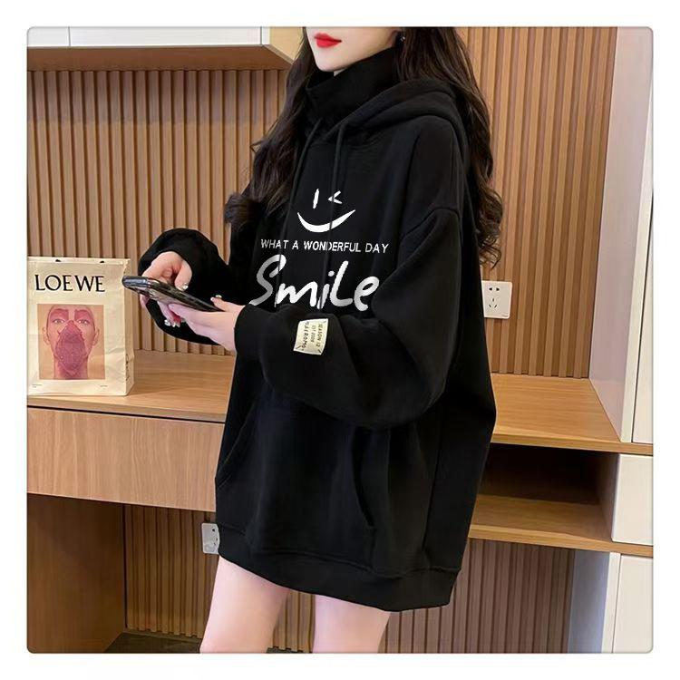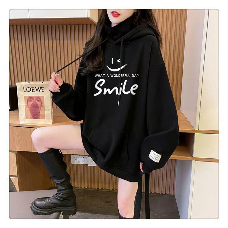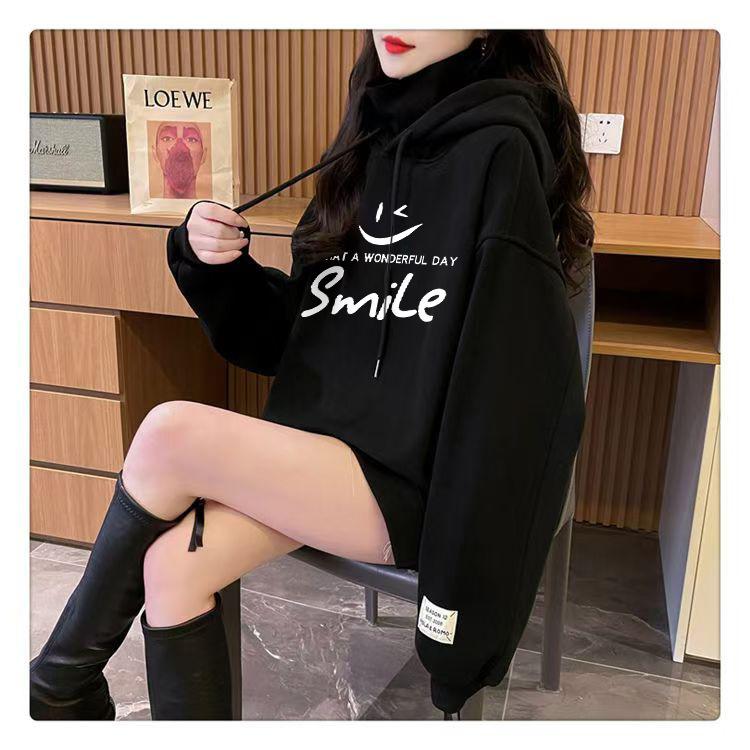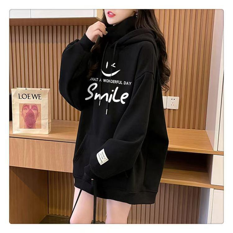 Otoño e Invierno Forrado de Felpa Engrosado Cuello Alto Costuras Suelto Sudadera con Capucha Moda Femenina Elegante Estampado Medio Largo Combinable Top
