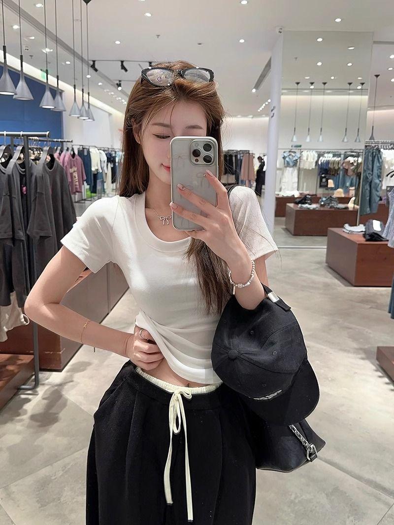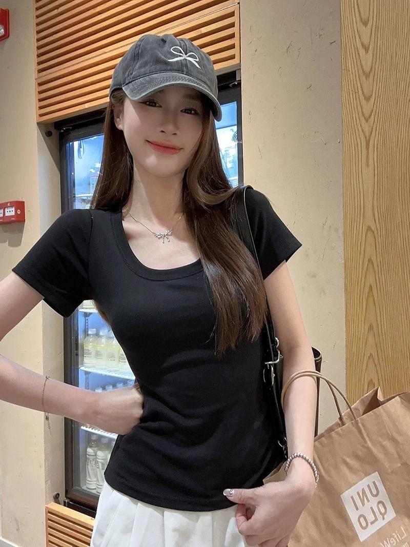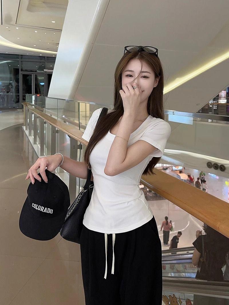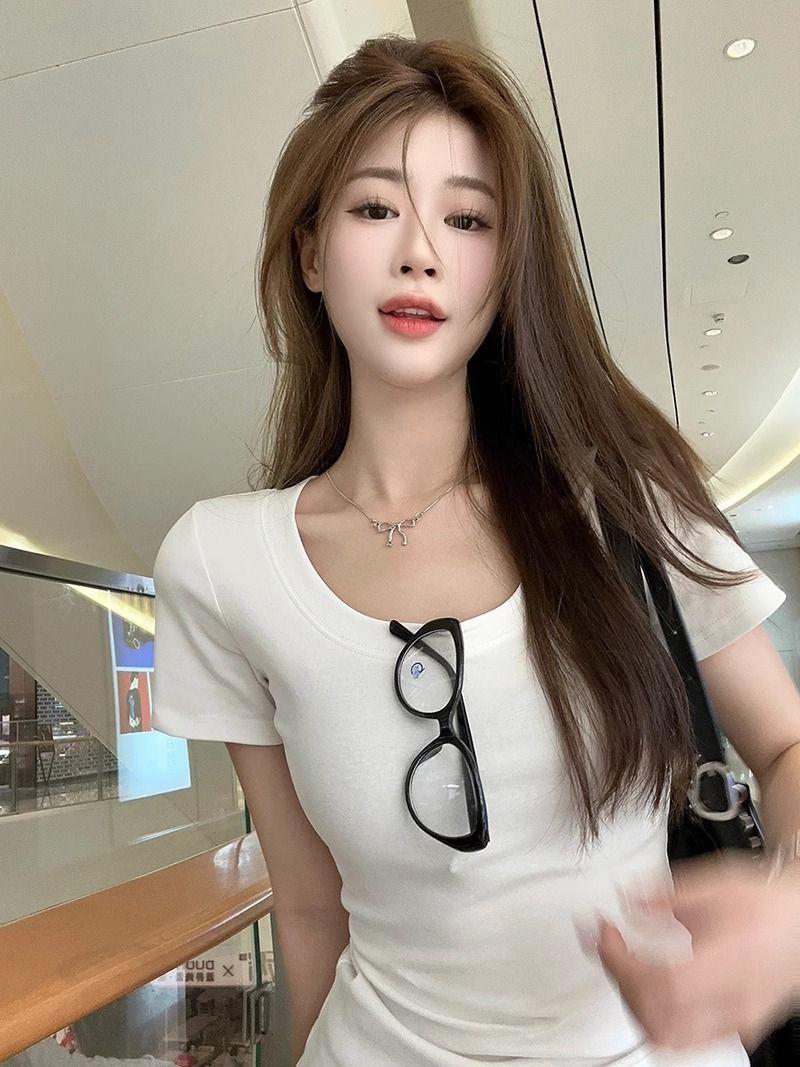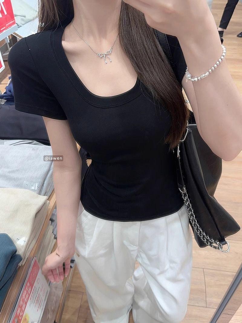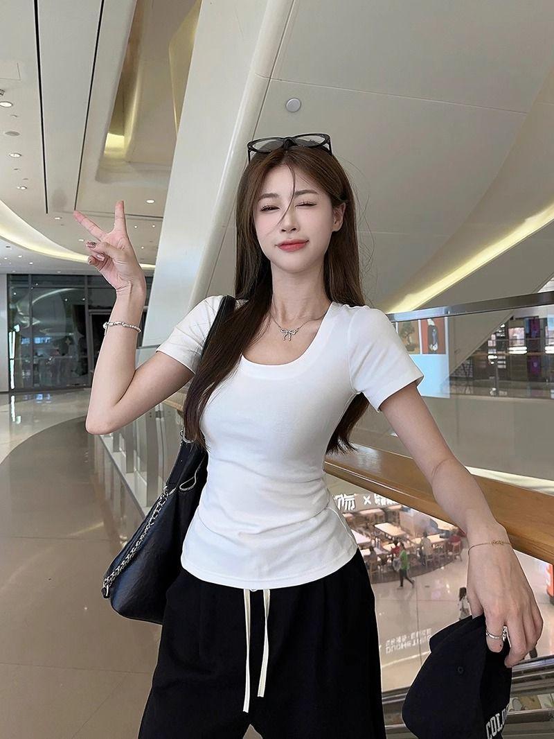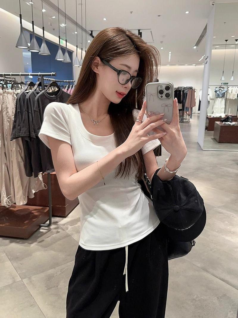Camiseta Blanca de Cuello U con Manga Corta para Mujer Verano Delgada con Aspecto Adelgazante para Fondo Corta Dulce Sexy Básica