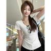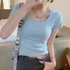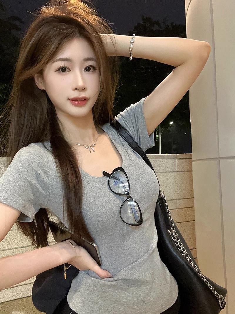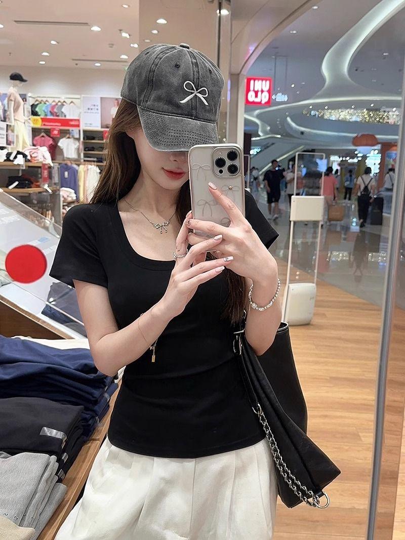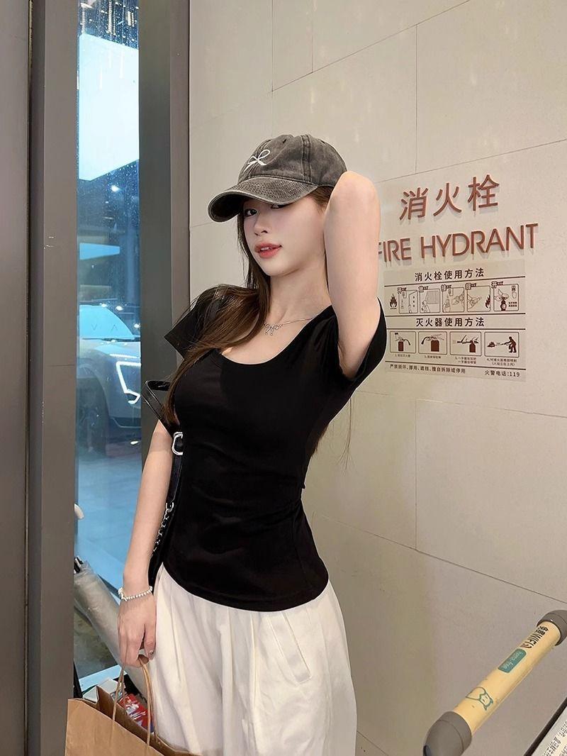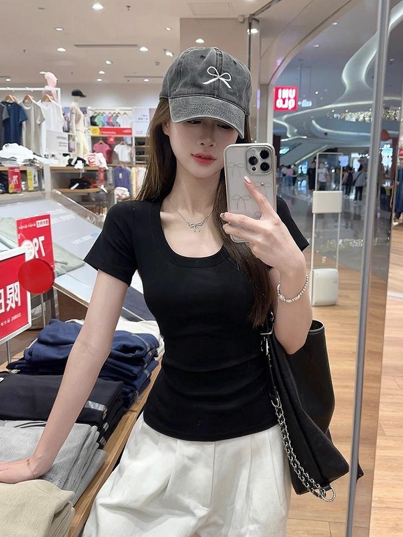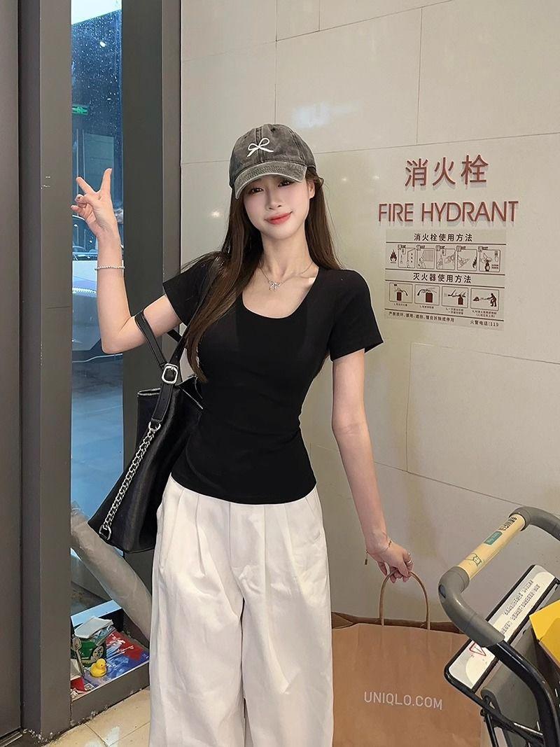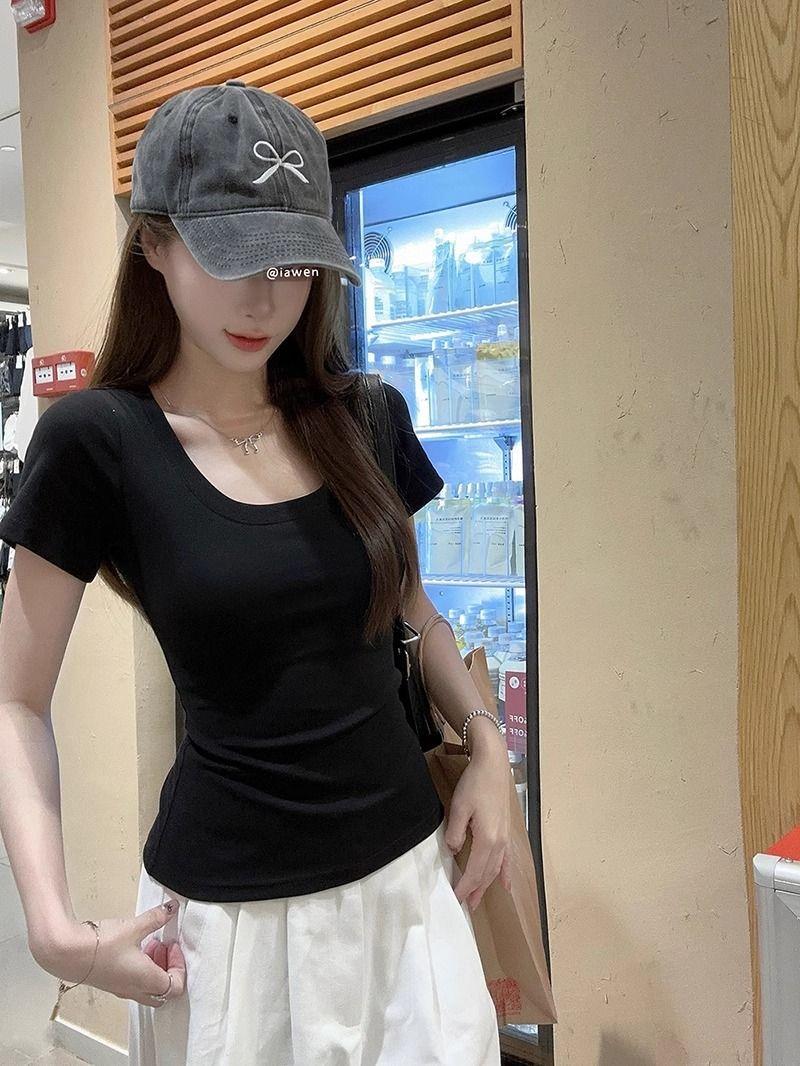 Camiseta Blanca de Cuello U con Manga Corta para Mujer Verano Delgada con Aspecto Adelgazante para Fondo Corta Dulce Sexy Básica