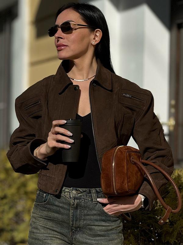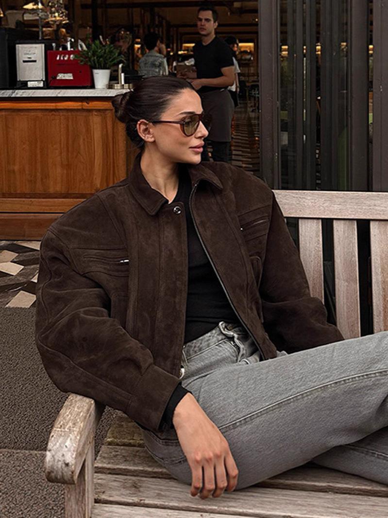 Amazon Transfronterizo Moda para Mujer Europea y Americana Venta al por Mayor 2025 Principios de Primavera Nuevo Chaqueta Retro de Solapa de Gamuza