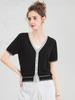 [Contiene Seda de Morera] Verano Seda Más Fácil de Combinar Contraste de Color Cuello en V Manga Corta Top Cárdigan Corto de Punto Camiseta de Punto para Mujer