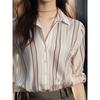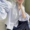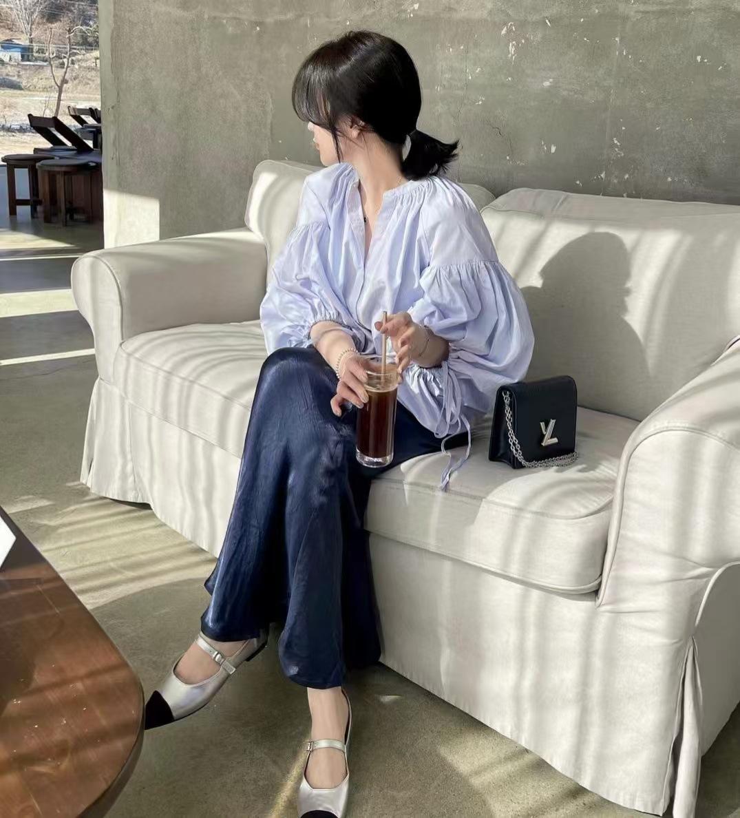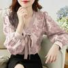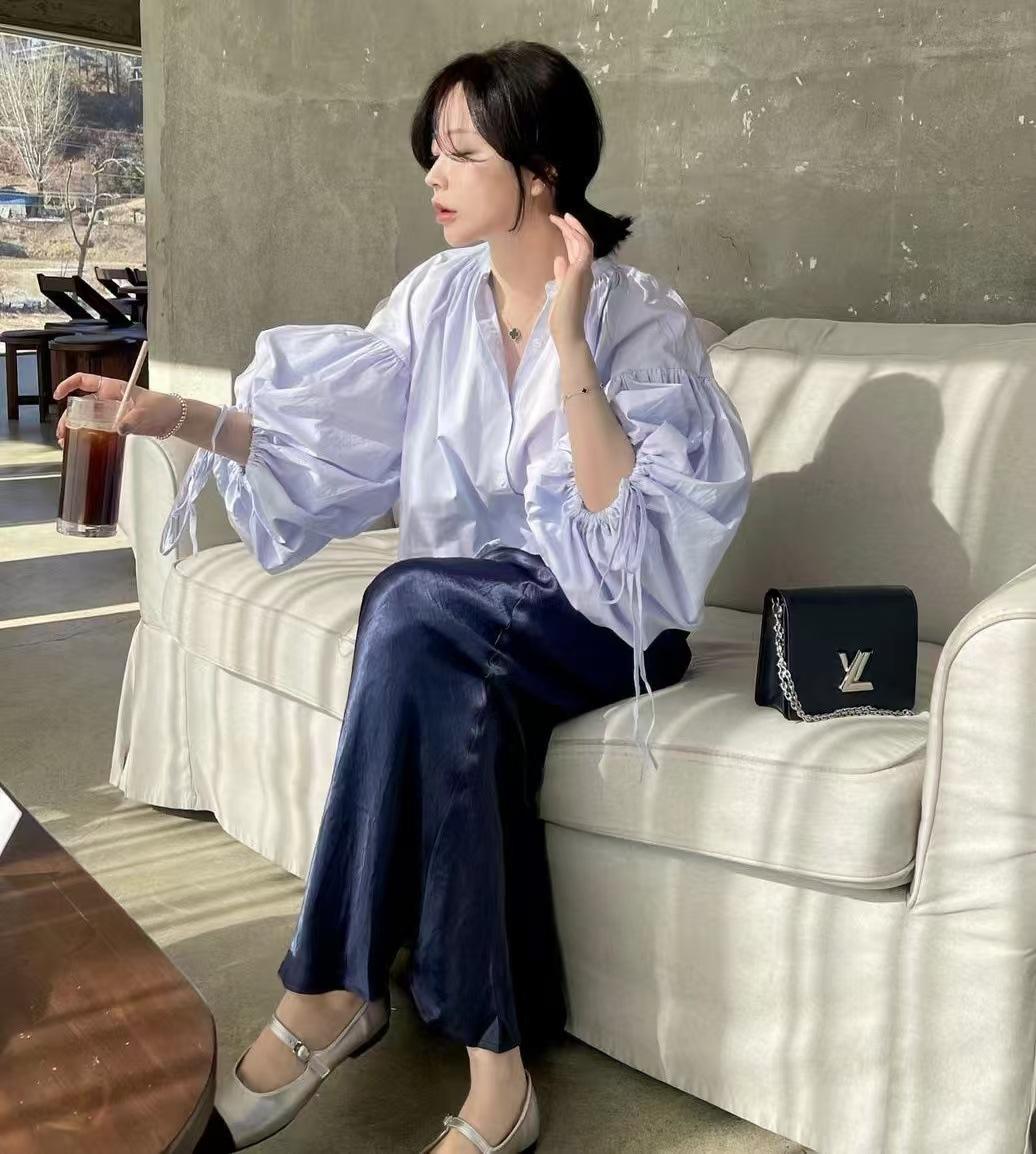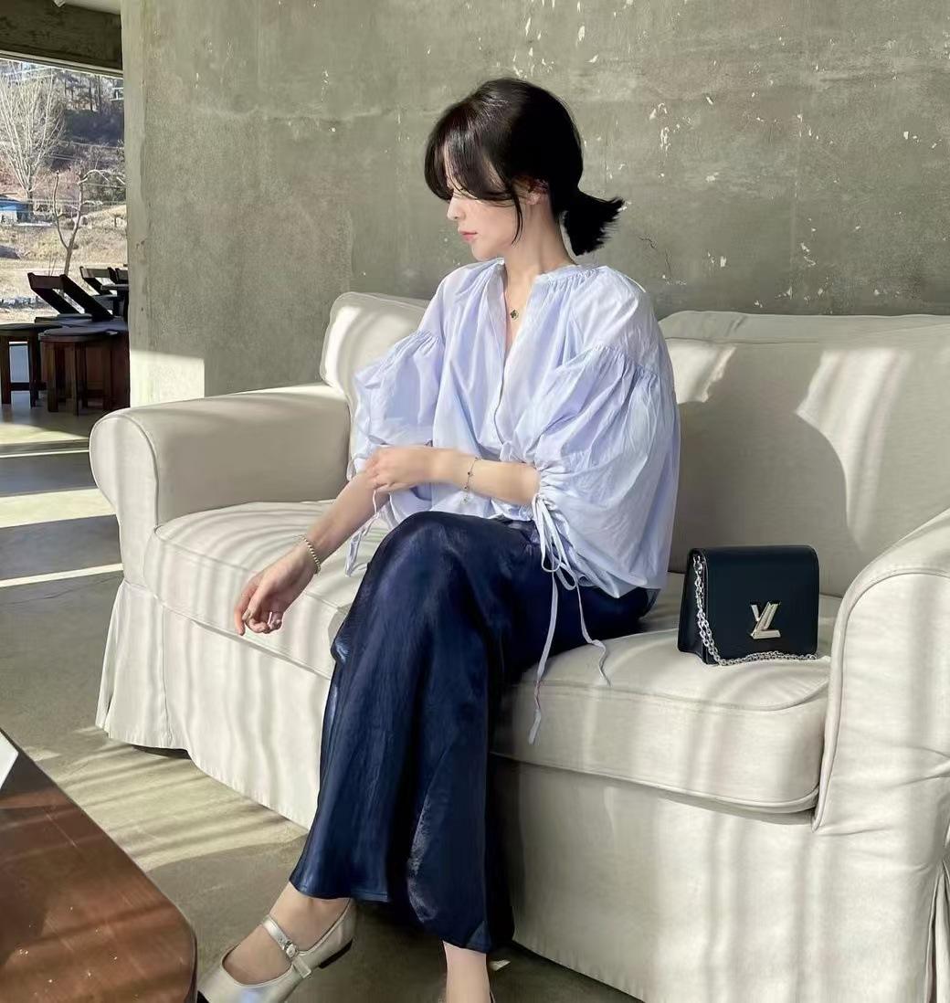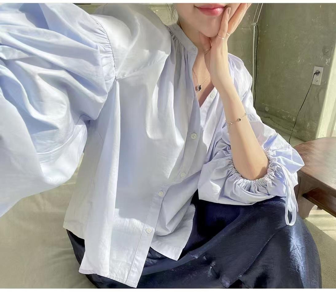 Coreano chic primavera y otoño nicho diseño sentido cuello redondo botón fila pequeña lazo suelto versátil manga linterna camisa top mujer