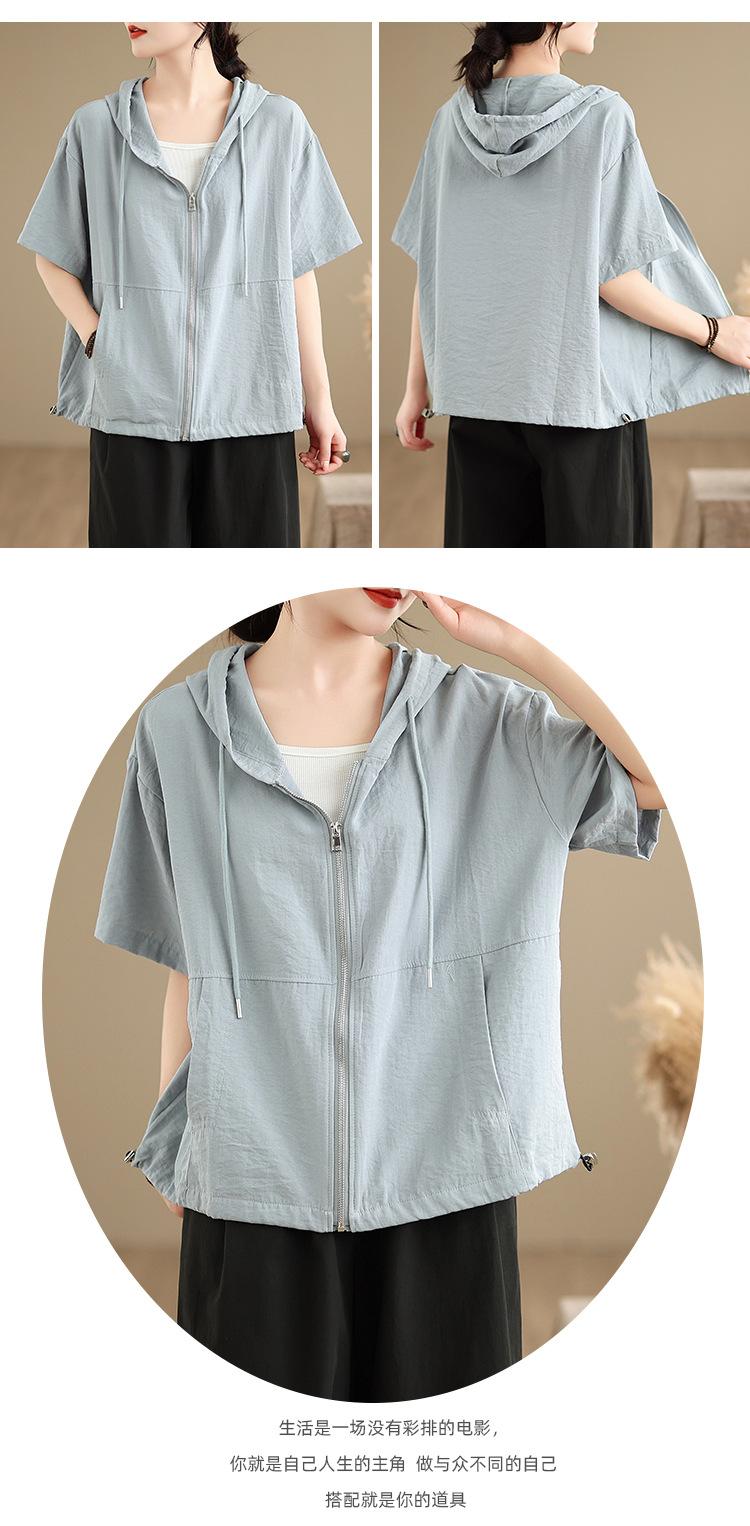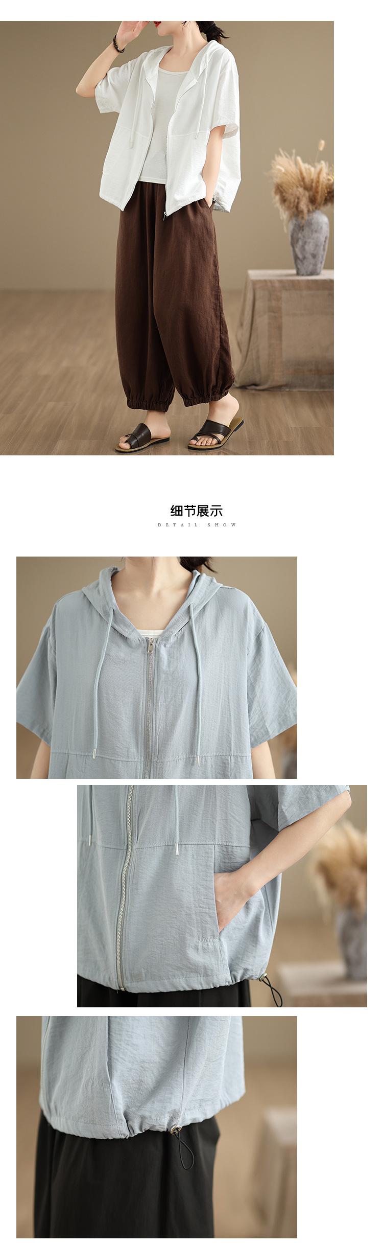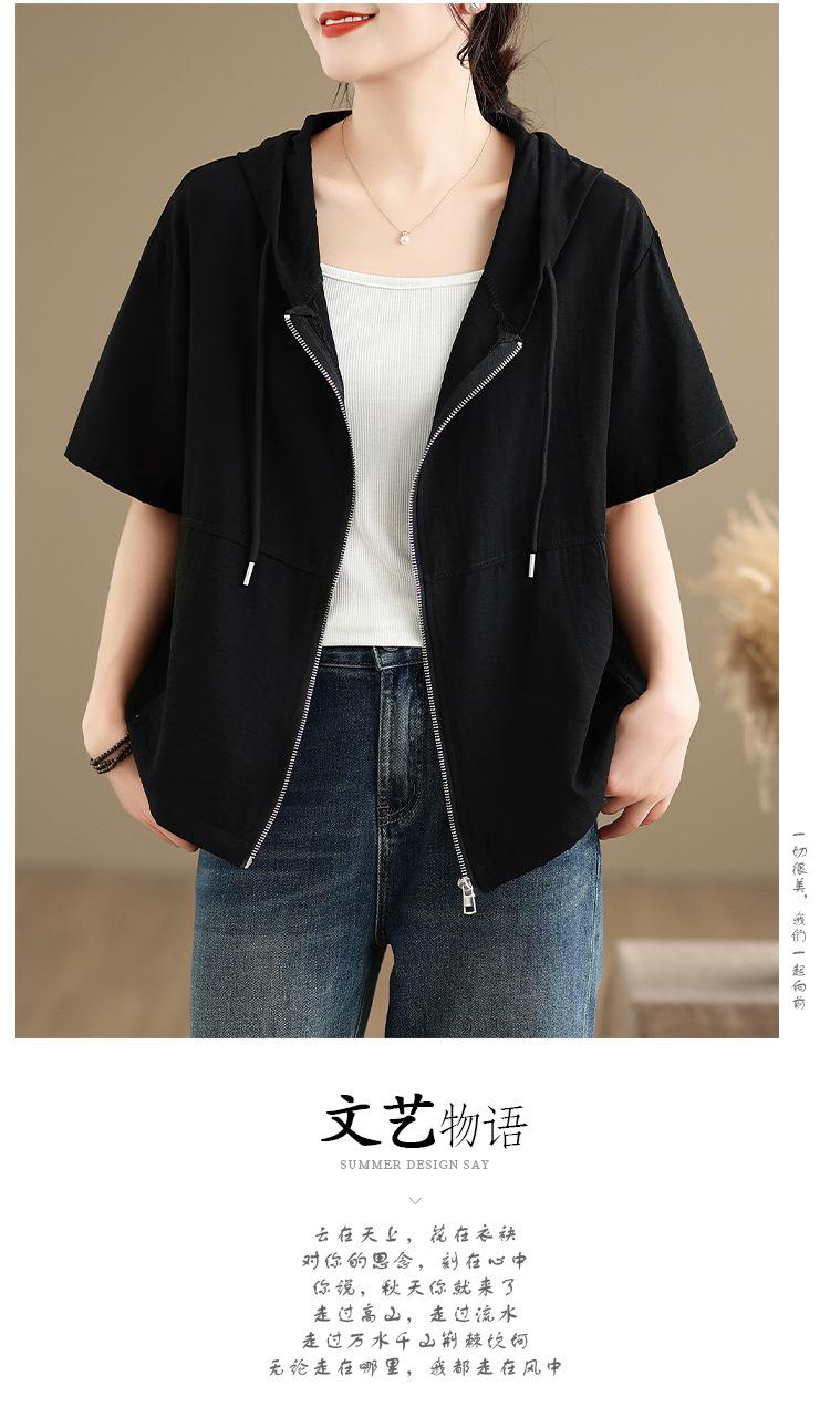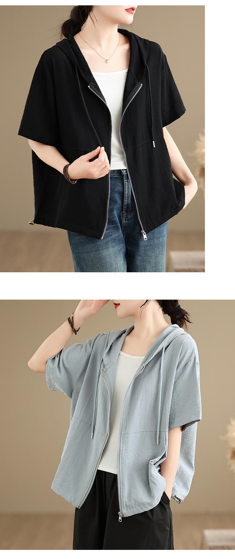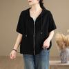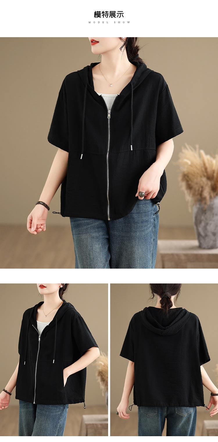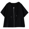 Verano Japonés y Coreano Nuevo Estilo Talla Grande con Capucha Color Sólido Casual Camiseta para Mujer Cremallera Chaqueta Pequeña Dobladillo con Cordón Top